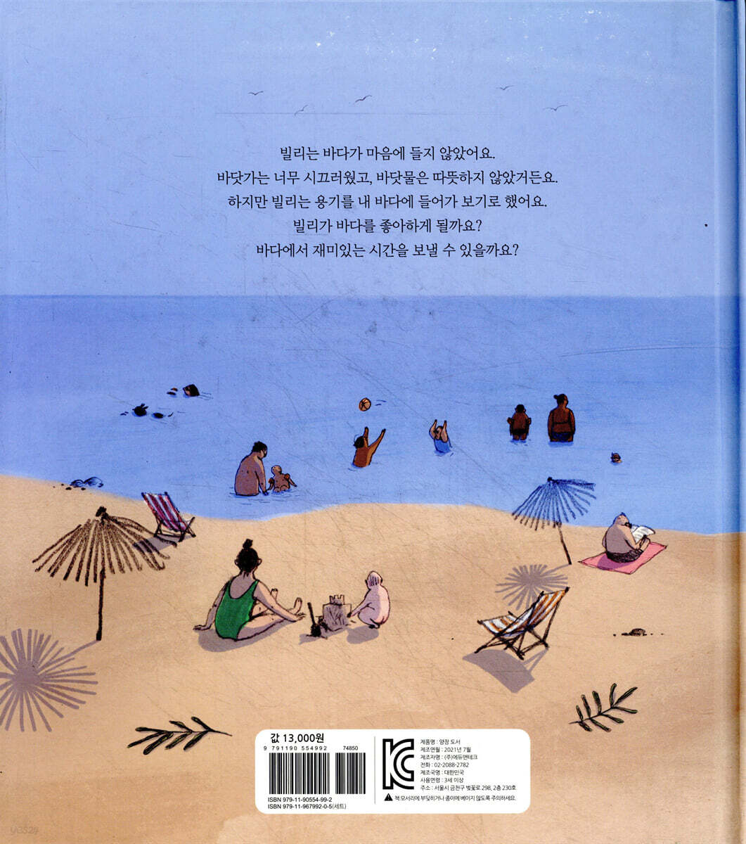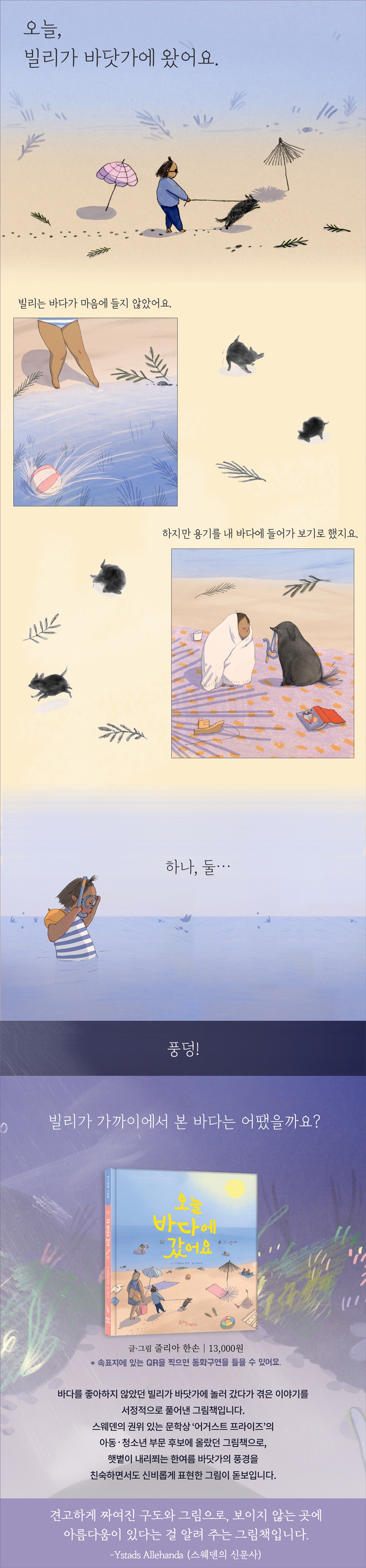 바닷가에 간 빌리는 어떤 하루를 보냈을까요? 첨벙첨벙 튀는 물, 즐겁게 소리 지르는 시끄러운 사람들, 빌리는 바닷가가 마음에 들지 않았어요. 바다가 무섭게 느껴졌을지도 몰라요. 빌리는 용기를 내어 바다로 들어가 봅니다. 바다는 마냥 친절하지만은 않았어요. 하지만 빌리가 또 한 번 용기를 내어 바닷속을 들여다보자 전혀 다른 세상이 펼쳐졌지요. 우리가 경험하는 많은 일이 이렇지 않을까요? 겉모습만 보고 싫다거나 재미없다고 생각했던 것도 깊이 들여다보면 새로운 면을 찾게 되면서 재미있게 느껴지기도 하지요. 빌리처럼 사물을 좀 더 가까이 들여다보세요. 매일 새로운 재미를 찾게 될지도 몰라요. 따뜻한 색으로 그려낸 북유럽 스웨덴의 바다 풍경 『오늘 바다에 갔어요』는 스웨덴 그림책 작가 줄리아 한손의 첫 그림책이자, 스웨덴의 권위 있는 아동문학상 ‘어거스트 프라이즈’ 후보에 오른 그림책입니다. 해변에 내리쬐는 따뜻한 빛의 질감과 생동감 넘치는 선이 돋보이지요. 스웨덴의 아름다운 바닷가 풍경을 느껴 보세요. |