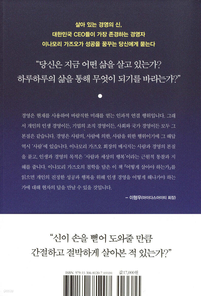 경영은 현재를 사용하여 바람직한 미래를 얻는 인과적 연결 행위입니다. 그래서 개인의 인생 경영이든, 기업의 조직 경영이든, 사회와 국가 경영이든 모두 그 본질은 같습니다. 경영은 사람의, 사람에 의한, 사람을 위한 행위이기에 그 해답 역시 ‘사람’에 있습니다. 이나모리 가즈오 회장의 메시지는 사람과 경영의 본질을 묻고, 인생과 경영의 목적은 ‘사람과 세상의 행복’이라는 근원적 통찰과 지혜를 줍니다. 이나모리 가즈오의 철학을 담은 이 책 『어떻게 살아야 하는가』를 읽으면 개인의 진정한 성공과 행복을 위해 인생 경영을 어떻게 해나가야 하는가에 대해 현자의 답을 만날 수 있을 것입니다. - 이형우 (마이다스아이티 회장)