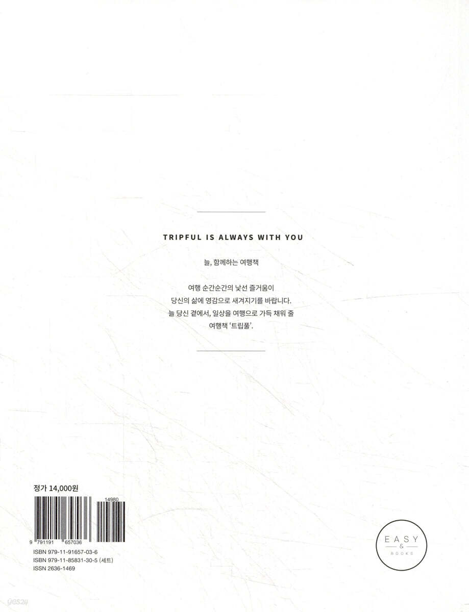 오랜 시간 하동과 함께한 차. 1,200여 년의 야생차 역사를 간직한 하동에는 찻자리부터 티 카페까지, 차와 함께하는 다양한 공간들이 있습니다. 〈트립풀 하동〉은 눈과 코, 입을 쌉싸름한 향으로 채워줄 장소들을 소개합니다. 예술이 깃든, 하동 문학과 예술이 가득한 하동. 골목골목이 하나의 작품이 된 하덕마을 섬등 골목길 갤러리부터 박경리 소설 〈토지〉의 배경이 된 최참판댁까지. 오랜 시간 수많은 작가에게 영감을 주는 곳이 하동입니다. 이러한 이야기가 곳곳에 숨겨진 장소들을 〈트립풀 하동〉을 통해 전합니다. 하동, 취향 맞춤 여행 공간 하나하나가 여행지가 되고 있습니다. 하동은 여행자의 취향을 충족해 줄 장소들이 곳곳에 갖춰져 있습니다. 〈트립풀 하동〉은 여행자가 바라는 하동을 경험할 수 있도록 취향 맞춤 여행을 제안합니다. 아이와 함께하는 여행, 연인 & 친구와 함께하는 여행, 나 혼자 떠날 수 있는 여행 등 테마에 따른 코스와 스폿을 소개합니다. 이제 자신의 취향에 맞게 하동으로 여행을 떠나보세요. Tripful is always with you 늘 함께하는 여행책, Tripful 여행 순간순간의 낯선 즐거움이 당신의 삶에 영감으로 새겨지기를 바랍니다. 늘 당신 곁에서, 일상을 여행으로 가득 채워 줄 여행책 ‘트립풀’. 수많은 매체와 서적들은 앞다투어 여행을 이야기합니다. 하지만 이러한 정보의 홍수 속에도 저마다 여행을 바라보는 의미와 이유가 다르기에, 정작 ‘여행’의 정답을 말하는 이는 없습니다. 다만 여행을 앞두고, 혹은 여행을 떠올리며 갖게 되는 ‘감정의 궤’가 존재함에는 이견이 없어 보입니다. 여행이 전하는 ‘설렘’과 ‘즐거움’, 나아가 여행을 통해 얻게 되는 일상에서의 ‘영감’ 등 말입니다. 여행책 브랜드 이지앤북스EASY&BOOKS의 〈트립풀 Tripful〉은 여행의 정답이 아닌, ‘여행의 즐거움’을 발견할 수 있는 다양한 방법들을 제시합니다. 저마다 여행의 방식은 다르지만, 그 곳에서 보고, 듣고, 느낀 ‘즐거움 가득한’ 여행의 장면들을 함께 나누고자 합니다. * Tripful = Trip + Full of 제호 〈트립풀〉은 ‘여행’을 의미하는 트립(Trip)에, ‘~이 가득한’이란 뜻의 접미사 풀(-ful)을 붙여 만든 합성어입니다. ◇ 〈트립풀〉만의 큐레이션, 기존 여행 가이드북이 보인 방식을 탈피 단순히 보고, 먹고, 자는 소개가 주인 기존 가이드북의 형식을 벗었습니다. ‘무엇을’ 보다는, ‘어떻게’와 ‘왜’에 집중했습니다. 실제 여행자들의 시선으로 바라보고, 그곳의 매력을 다양하게 해석하고 느끼는 현재의 여행 트렌드와 발맞추었습니다. 다릅니다. 단순한 명소 방문이 아닌 해당 스폿을 즐기는 방법과 그 속에 숨겨진 이야기를, 줄 서서 먹을 만큼 유명한 식당에서 ‘왜’ 먹어야 하는지를, 단순 유행 아이템 쇼핑이 아닌 현지인들의 라이프 스타일을 엿볼 수 있는 그들만의 숍을 함께 소개합니다. 사진과 텍스트의 지루하고 반복적인 나열보다는 각각의 매력과 장점을 드러낼 수 있는 텍스트 편집과 디자인 레이아웃, 이미지 등 〈트립풀〉만의 큐레이션을 통해 여행자와 여행지에 더욱 집중, 여행의 깊이를 한껏 더합니다. ◇ 현지인처럼 가볍게, 트렌디한 여행책 〈트립풀〉은 가볍고 얇으면서도 감각적인 디자인의 여행책입니다. 130 페이지 내외의 콤팩트한 분량은 어디든 가볍게 들고 여행할 수 있게 합니다. 표지는 여행지의 일상에서 포착할 수 있는 감각적인 장면을 담아 소장하고 싶은 욕구를 더합니다. 낯선 곳에서 이방인처럼 여행하는 것이 아닌, 현지인처럼, 현지인의 삶을 체험하고 돌아오는 여행을 즐길 수 있도록 〈트립풀〉이 안내합니다. |