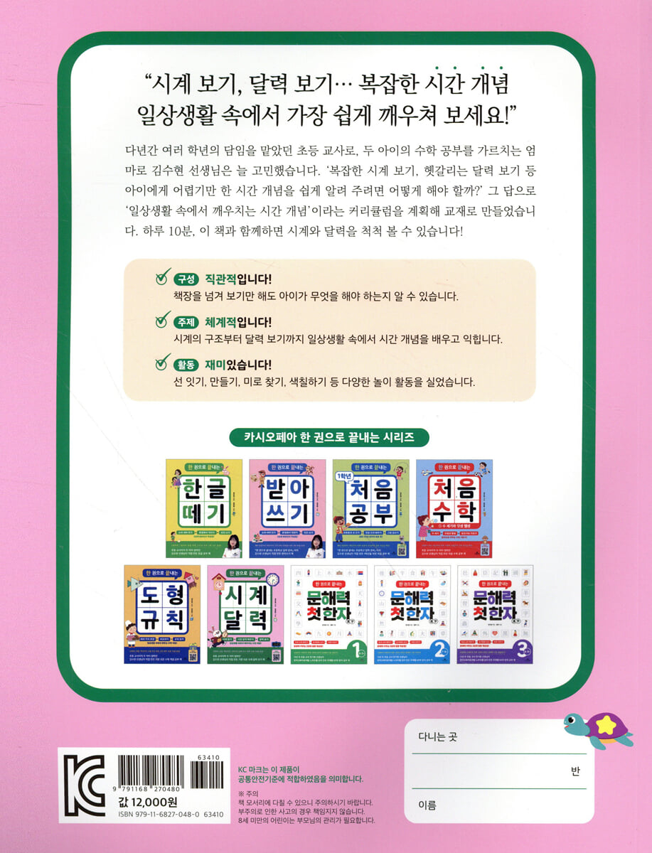 5세부터 초등 1학년까지 시계 보기·달력 보기 하루 10분 30일 완성 『한 권으로 끝내는 시계 달력』은 5세부터 초등 1학년까지 아이가 시계와 달력으로 나타나는 시간 개념에 재미를 느끼고, 문제를 해결하며 성취감을 맛볼 수 있도록 초등 1학년 수학 교과서를 기반으로 한 내용에 일상생활의 장면을 밀착시켜 커리큘럼을 계획했습니다. 처음부터 시계와 달력 보기를 곧바로 배우기보다는 ‘시계 보기 준비’ 활동에 1부터 12까지 순서, 시계 숫자, 시곗바늘 등을 먼저 접하며 충분히 준비 학습을 할 수 있도록 내용을 구성했습니다. 그래서 ‘몇 시 배우기’, ‘몇 시 30분 배우기’, ‘5분 단위 및 1분 단위 배우기’, ‘달력 보기’로 이어지는 본격 학습을 수월하게 해나갈 수 있습니다. 그뿐만 아니라 책의 내용을 한눈에 살펴볼 수 있는 ‘유닛 가이드’, 책을 200% 활용하게끔 도와주는 ‘이 책의 활용법’, 하루 10분, 적게는 2쪽에서 많게는 6쪽까지 30일간 꾸준히 공부하게끔 이끌어주는 ‘한 권 끝 계획표’를 실어 아이가 어려운 수학 개념 공부를 한 권으로 끝낼 수 있도록 했습니다. [특징 ②] 주제가 체계적입니다! 시계의 구조부터 달력 보기까지 난이도별 유닛으로 공부 성취감 극대화 『한 권으로 끝내는 시계 달력』은 아이가 가장 쉽게 시간 개념을 배우고 익힐 수 있도록 시계의 구조부터 달력 보기까지의 내용을 난이도별 유닛으로 구분해서 실었습니다. 이 책에서 나오는 ‘유닛’은 아이가 공부하는 주제를 나눈 단위입니다. 시계 보기와 달력 보기에 익숙해지려면 하나의 내용을 완벽히 숙지한 후에 그다음 내용으로 넘어가야 합니다. 처음부터 유닛별로 차근차근 따라가며 공부하는 것이 중요하다는 뜻입니다. 그래서 본격적으로 시간 개념을 배우기 전에 시계 보기 준비로 워밍업 학습을 진행하고, 그다음에 몇 시 배우기, 몇 시 30분 배우기, 5분 단위 및 1분 단위 배우기, 달력 보기로 자연스럽게 넘어갈 수 있게끔 내용을 구성했습니다. 이렇게 한 유닛 한 유닛 천천히 공부하다 보면 어떤 아이든지 크게 힘들이지 않고 성취감을 맛보며 시간 개념을 가장 쉽게 깨우칠 수 있게 됩니다. 김수현 선생님이 다년간의 경험을 마중물 삼아 이 책에 담아낸, 시계 보기와 달력 보기를 난이도별로 구분한 유닛을 소개합니다. [UNIT 1 시계 보기 준비] 시계에 쓰인 1부터 12까지의 숫자, 짧은바늘(시침)과 긴바늘(분침) 등 시계의 구조, 여러 가지 시계의 모습 등 시계 보기에 앞서 꼭 알아야 할 내용만을 준비 학습으로 엄선했습니다. [UNIT 2 몇 시 배우기] 1시부터 12시까지 각각 디지털 시계와 아날로그 시계로 어떻게 시간을 나타내는지 살펴보고, 시간을 보고 읽는 방법을 차례대로 학습합니다. [UNIT 3 몇 시 30분 배우기] 1시 30분부터 12시 30분까지 각각 디지털 시계와 아날로그 시계로 어떻게 시간을 나타내는지 살펴보고, 시간을 보고 읽는 방법을 차례대로 학습합니다. [UNIT 4 5분 단위 및 1분 단위 배우기] 9시를 기준시로 하여 각각 디지털 시계와 아날로그 시계로 어떻게 5분 및 1분 단위의 시간을 나타내는지 살펴보고, 시간을 보고 읽는 방법을 차례대로 학습합니다. [UNIT 5 달력 보기] 1년, 사계절, 요일 배우기로 달력 보기의 기초를 다진 다음, 1월부터 12월까지 12개월을 차례대로 학습합니다. [특징 ③] 직관적이라 쉽고 재미있습니다! 책장을 넘겨 공부하다 보면 어느새 시계 보기와 달력 보기 완전 정복 『한 권으로 끝내는 시계 달력』은 아이가 책장을 넘겨 보기만 해도 무엇을 해야 하는지 쉽게 알 수 있도록 직관적으로 구성했습니다. 책 속에는 부모님을 비롯해 주 양육자가 보는 내용에만 설명 문장이 있고, 아이가 보면서 공부하는 내용에는 설명 문장을 최소화했습니다. 그 대신 학습에 도움이 되는 내용으로 가득 채웠습니다. 아이가 난이도별로 구성된 내용을 효과적으로 따라갈 수 있도록 각각의 유닛마다 해당 유닛을 공부할 수 있는 최적의 방법을 연구했습니다. 그래서 ‘UNIT 1 시계 보기 준비’는 ‘1부터 12까지의 수 → 시계 숫자 → 시계 구조’로, ‘UNIT 5 달력 보기’는 ‘1년 → 사계절 → 요일 → 월 → 일’로 이어지는 순차적 학습, ‘UNIT 2 몇 시 배우기’, ‘UNIT 3 몇 시 30분 배우기’는 1시(1시 30분)부터 12시(12시 30분)까지 1시간 단위로 배우고 익히는 반복 학습, ‘UNIT 4 5분 단위 및 1분 단위로 배우기’는 9시를 기준시로 하여 5분과 1분 단위로 하나하나 구분해서 배우고 익히는 분절 학습법을 적용했습니다. 이와 더불어 아이들이 더 재미있게 공부를 놀이처럼 느끼며 할 수 있도록 선 잇기, 만들기, 미로 찾기, 색칠하기 등의 활동도 중간중간 수록했습니다. |