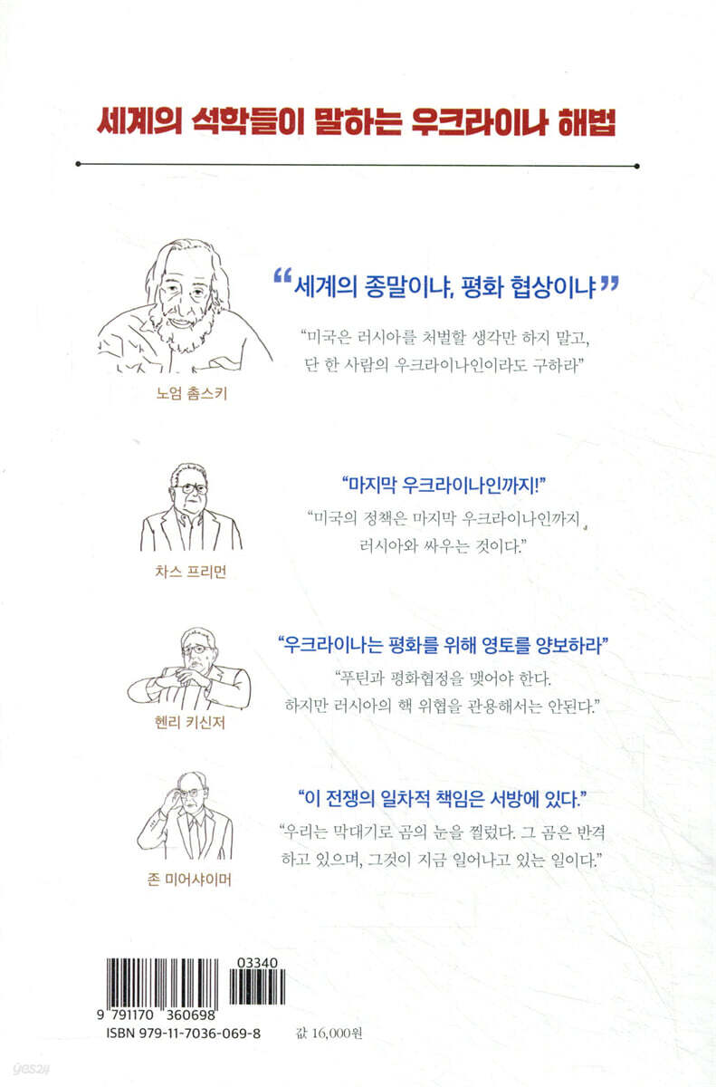 프롤로그 노엄 촘스키, 우크라이나 사태를 말하다 01. “1인치도 동진하지 않겠다” - 고르바초프와 베이커의 1인치 회담 02. “러시아에 완충지대는 왜 필요한가” - 군사동맹 없는 유럽 공동체 03. “유럽에 나토가 왜 필요한가” - 핀란드와 스웨덴의 나토 가입 04. “우크라이나 전쟁에 우크라이나는 없다” - 이 전쟁은 대리전 05. “러시아는 도발되었다!” - ‘우크라 함정’에 빠진 러시아 06. “러시아를 약화시키라” - 서방의 프로파간다 07. “바이든은 왜 푸틴을 전범이라 부르는가” - 미국의 대량학살 조약 08. “140여 개국은 왜 경제제재에 참여하지 않는가” - 실패한 경제제재 09. “화살은 중국을 향하고 있다” - 나토의 중국 견제 10. “푸틴은 미국에게 큰 선물을 주었다” - 황금 접시에 담긴 유럽 11. “록히드 마틴과 엑손모빌을 기쁘게 하는 일은 이제 그만!” - 환경 대재앙 12. “푸틴을 벼랑 끝으로 몰지 말라” - 핵전쟁의 가능성 13. “세계 종말이냐, 평화 협상이냐” - 이제 전쟁을 끝낼 때 14. “깨어있는 지성인이여, 실천하라” - 재앙을 막을 수 있는 대중의 힘 에필로그 부록 01. 부쿠레슈티 나토 정상회의 선언(2008년 4월 3일) 02. 나토 확장과 관련된 베이커-고르바초프 1인치 회담 전문(1990년 2월 9일) 03. 독일 통일과 관련된 2+4 외무장관 회담 전문(1990년 9월 12일) 04. 미국-우크라이나의 전략적 파트너십에 대한 공동 성명(2021년 9월) 05. ‘한국의 우크라이나 무기 지원 반대’ 한국 종교 시민사회단체 성명서(2022년 6월 21일) 06. “이것이 우크라이나 사태의 해답이다” - 촘스키 인터뷰 전문 참고자료 |