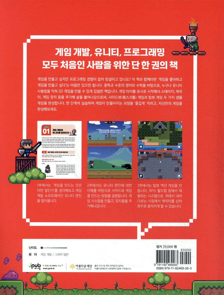 베타리더 후기 x 시작하며 xii 이 책에 대하여 xiii PART 1 | 게임을 만들기 위한 준비 CHAPTER 1 | 게임 개발과 유니티를 알아보자 2 1.1 게임 개발의 시작은 지식과 아이디어 2 1.2 게임 개발에 필요한 것 생각해보기 4 1.3 유니티의 기초 6 1.4 유니티 설치하기 6 1.5 유니티로 만드는 게임의 구성 살펴보기 18 CHAPTER 2 | 유니티로 첫 게임 만들기 20 2.1 프로젝트 만들기 20 2.2 게임 화면 만들기 25 2.3 플레이어 캐릭터 만들기 42 CHAPTER 3 | 스크립트 작성하기 53 3.1 스크립트로 게임 오브젝트 조작하기 53 3.2 C# 프로그래밍의 기초 59 3.3 PlayerController 스크립트 살펴보기 65 PART 2 | 사이드뷰 게임 만들기 CHAPTER 4 | 사이드뷰 게임의 기본 시스템 만들기 78 4.1 사이드뷰 게임 78 4.2 샘플 게임 실행해보기 79 4.3 게임 스테이지 만들기 83 4.4 게임 오브젝트 재사용하기 88 4.5 플레이어 캐릭터 만들기 95 CHAPTER 5 | 버튼과 UI 만들기 125 5.1 게임 UI 만들기 125 5.2 게임 재시작 기능 만들기 138 5.3 게임 실행하기 142 CHAPTER 6 | 게임에 화면과 기능 추가하기 144 6.1 버전 업 내용 요약 144 6.2 타이틀 화면 추가하기 146 6.3 스크롤 화면 만들기 153 6.4 시간제한 기능 만들기 166 6.5 아이템과 점수 만들기 176 6.6 결과 화면 추가하기 184 CHAPTER 7 | 게임에 장치 추가하기 190 7.1 대미지 블록 만들기 190 7.2 이동 블록 만들기 198 7.3 이동 블록과 연동되는 스위치 만들기 205 7.4 고정 포대 만들기 210 7.5 돌아다니는 적 캐릭터 만들기 217 7.6 게임에서 사운드 재생하기 221 7.7 마우스 및 터치 패널 조작 구현하기 226 PART 3 | 탑뷰 액션 게임 만들기 CHAPTER 8 | 탑뷰 액션 게임의 기본 시스템 만들기 242 8.1 예제 게임 실행해보기 242 8.2 지금부터 만들 탑뷰 게임에 대해 알아보기 244 8.3 타일맵으로 게임 화면 만들기 246 8.4 플레이어 캐릭터 만들기 262 CHAPTER 9 | 탑뷰 액션 게임 업그레이드하기 287 9.1 씬에서 씬으로 이동하기 287 9.2 배치 아이템 만들기 299 9.3 적 캐릭터 만들기 306 9.4 UI와 게임을 관리하는 시스템 만들기 315 CHAPTER 10 | 탑뷰 액션 게임 완성하기 331 10.1 타이틀 화면 추가하기 331 10.2 게임 데이터 저장하기 337 10.3 보스 스테이지 만들기 354 10.4 여러 BGM과 SE 적용하기 378 APPENDIX | 한국어판 부록 APPENDIX A | 게임에서 사용되는 삼각함수 390 A.1 삼각함수란? 390 A.2 각도로 좌표 구하기(Sin과 Cos을 이용하여 벡터 구하기) 392 A.3 좌표에서 벡터 구하기(Atan2 메서드 사용하기) 393 A.4 자주 쓰는 삼각함수 메서드 394 APPENDIX B | 실제 기기에 빌드 및 설치하기 397 B.1 iOS 기기에 설치 397 B.2 안드로이드 기기에 설치 401 B.3 웹 앱으로 배포하기 412 찾아보기 416 |