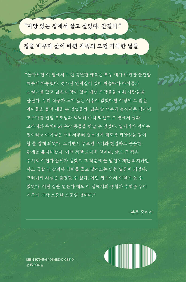 --- pp.11~12 “이 집에서는 나날이 모험이었다. 모든 날이 다른 색채와 느낌으로 다가와 놀랍고 뿌듯한 추억을 남겨주었다. 힘들고 속상하고 마음 아픈 일들도 있었지만 그보다는 가슴 설레고 놀랍고 짜릿한 일들이 훨씬 더 많았다. 이 집이 아니었다면 결코 알지 못하고 살았을 세상이 있었다. 모험이 넘치는 집에서 산다는 것, 눈을 뜨면 여전히 설레고 놀랍고 두근거리는 일이 기다린다는 것, 이보다 더 신나는 일은 없다.” --- pp.56~57 “나는 자연 속에서 살고 그 안에서 아이들을 키우고 싶어서 이곳에 왔다. 일거리는 넘치지만 자연도 넘친다. 그거면 충분하다. 몸과 마음을 열심히 움직이며 살 수 있는 집이다. 덕분에 수없이 많은 이야기를 만들며 살고 있다. 이런 삶은 밖에서는 잘 보이지 않는다. 뛰어들어서 내 이야기로 만들어야 알 수 있는 것이다. 우리 가족은 우리의 이야기를 살아간다. 힘들어도 지루할 틈 없는 집에서 날마다 모험을 누리며 살고 있다.” --- p.64 “농사라는 게 절기마다 심고 거둬야 할 작물이 달라서 한 가지가 끝나면 다른 것을 이어 심어야 한다. 그런데 우린 먼저 심은 것도 제대로 못 챙기다 보니 밭이 금세 엉망이 되었다. 풀은 무섭게 자라 작물을 다 가렸다. 날이 가물면 물 주기가 고역이고 장마가 길면 작물이 녹아버리거나 썩었다. 오이도, 가지도, 옥수수도 제때 수확하지 않으면 덜 여물거나 너무 자라서 먹을 수 없었다. 땅콩은 두더지가 파먹고 첫 옥수수는 까치들에게 바쳤다. 콩 싹은 고라니가 말끔히 뜯어 먹었다. 잎을 파먹고 새순을 뜯어 먹고 뿌리를 갉아 먹는 벌레들도 셀 수 없이 많았다.” --- pp.107~108 “비라도 오면 소리는 말할 수 없이 풍성해진다. 지붕과 차양 위로 떨어지는 빗소리가 다르고, 빗물받이 통으로 쏟아지는 빗소리가 다르다. 마당으로 떨어지는 소리와 보도블록 위로 떨어지는 소리가 다르고, 수련 항아리 위로 떨어지는 소리도 다르다. 가랑비 내릴 때 우산을 받치고 숲으로 가면 나뭇잎이 파들거리는 소리가 가득한데 그 속에 가만히 서 있으면 나도 한 그루 나무가 되어 커다란 잎으로 빗방울을 받는 것 같다.” --- p.146 “어느 여름밤 늦도록 컴퓨터 앞에 앉아 글을 쓰는데 가까이서 여치가 울었다. 온 존재로 울어대는 아름다운 소리였다. …같이 밤을 새워주는 이가 있구나. 마음이 꽉 차올랐다. 생각해보니 이 집에선 언제나 나 혼자인 적이 없다. 너무나 많은 생명이 곁에 있다. 같이 있어주는 것만큼 고마운 게 있을까. 여치 소리를 듣는 내내 좋은 글을 써야겠다는 생각이 들었다. 저토록 최선을 다하는 울음 앞에 부끄럽지 않은 글을 써야겠다고 말이다.” --- p.165 “이 집에서는 매일 무수한 생명들이 새로 오고 또 죽어간다. 우리가 사는 곳에서 죽음이란 길에 널린 돌만큼 흔하다. 가을이 오면 얼마 전까지 요란하게 울던 매미가 바삭하게 말라서 풀밭에 떨어져 있고, 싱싱하게 넝쿨을 뻗어가던 오이가 나날이 누렇게 말라가며 스러지는 모습도 본다. 초여름의 정원을 아름답게 장식하던 장미도 꽃잎을 떨구는 때가 온다. 무심하게 내딛는 발걸음에 여치가 깔려 죽기도 하고, 창틀에는 늘 말라죽은 노린재며 이름 모를 벌레들 사체가 굴러다닌다. 화장실에서 청아하게 울던 귀뚜라미가 어느 결에 쓰러져 있을 때도 있다. 태어난 지 얼마 안 돼 물통에 빠져 죽고 만 병아리를 처음 본 날은 눈이 붓도록 울었지만 이젠 어떤 죽음을 마주해도 담담하게 묻어주게 되었다. 생명은 태어나고, 번성하고, 다시 생명을 남기고 죽어간다는 것을 이제 아이들도 안다. 사람도 다르지 않다는 것도.” --- p.182 “눈보라 치는 밤, 친구들은 동네에서 만나 눈길도 걷고, 사진도 찍고, 눈싸움도 하며 즐거운 추억을 만들 텐데 얼마나 같이 있고 싶을까. 이럴 때 친구들과 한동네에 살았다면 ‘잠깐 애들 만나고 올게요. 모두 근처에 있대요’ 하며 달려 나갔겠지. 그래봐야 아파트 단지 어느 놀이터나 공터일 거고 모두 어디 사는지 아는 애들이라 나도 걱정 없이 ‘조금만 놀다 들어와’라고 할 수 있었을 텐데.” --- p.233 “그런데 돌아보면 이 집에서 누린 특별한 행복은 모두 내가 나열한 불편함 때문에 가능했다. 경사진 언덕길이 있어 겨울마다 아이들과 눈썰매를 탔고 넓은 마당이 있어 매년 모닥불을 피워 사람들을 불렀다. 우리 식구가 쓰지 않는 이층이 없었다면 어떻게 그 많은 아이들을 불러 재울 수 있었을까. 넓은 밭 덕분에 농사지은 감자며 고구마를 친정 부모님과 넉넉히 나눠 먹었고 그 밭에서 꿩과 고라니와 두꺼비와 온갖 동물을 만날 수 있었다. 일거리가 넘치는 집이라서 아이들은 어려서부터 청소년이 되도록 집안일을 같이 할 줄 알게 되었다. 그러면서 부모인 우리와 친밀하고 끈끈한 관계를 유지해갔다. 이건 정말 고마운 일이다.” --- p.248 |