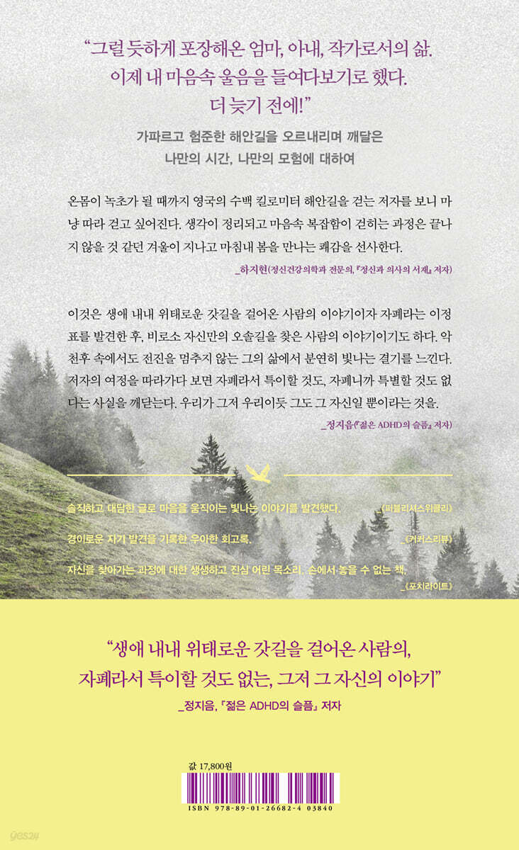 프롤로그 진짜 나를 마주하다 1부 걷기로 하다 _데솔레이션 포인트 이것은 나만의 시간이다 _8월, 마인헤드 해안지구 비록 뒤처질지라도 _8월, 마인헤드에서 포어랜드 포인트까지 감당해내다 _9월, 포어랜드 포인트에서 일프라콤까지 사라지고 싶었다 _10월, 일프라콤에서 반스터플까지 아스퍼거 증후군 _11월, 반스터플에서 애플도어까지 그럴듯하게 꾸며온 삶 _12월, 도버에서 셰퍼즈웰까지 남편에게 고백하다 _12월, 셰퍼즈웰에서 캔터베리까지 스펙트럼 선상의 삶 _1월, 캔터베리에서 차트햄까지 가장 안전한 곳으로 _1월, 위츠터블에서 시솔터까지 긴 터널을 통과하는 시간 _1월, 차트햄에서 칠햄까지 2부 받아들이다 _하틀랜드 길을 영원히 기억하는 법 작은 균열 _2월, 애플도어에서 클로벨리까지 상심하지 않는 법 _2월, 하틀랜드 포인트에서 틴타겔성을 경유해 이든 프로젝트까지 그만두지만 않는다면 _2월, 클로벨리에서 하틀랜드 키까지 위태로운 평화 _2월, 하틀랜드 키에서 모웬스토까지 자기 이해로 향하는 길 _2월, 칠햄에서 차트햄까지 여전히 내 곁에 있는 것들 _3월, 도버의 화이트 클리프 내향적인 사람 _3월, 모웬스토에서 와이드마우스 베이까지 머물고 싶다 _3월, 와이드마우스 베이에서 모건 포스까지 3부 다시 일어서다 _아우터 호프 명상이 내게 가르쳐준 것들 다시 시작하는 삶 _5월, 위츠터블에서 캔터베리까지 나를 돌본다는 것 _5월, 위츠터블에서 손덴 우드까지 도망치지 않기 위해 _5월, 런던에서 캔터베리까지 우리 사이에 연결된 줄 _6월, 데번의 사우스 햄스 결국 돌아가야 할 곳 _7월, 자동차로 콘월의 맨 끝까지 나의 멋진 신세계 _8월 말, 데번 에필로그 진단을 받다 감사의 말 |