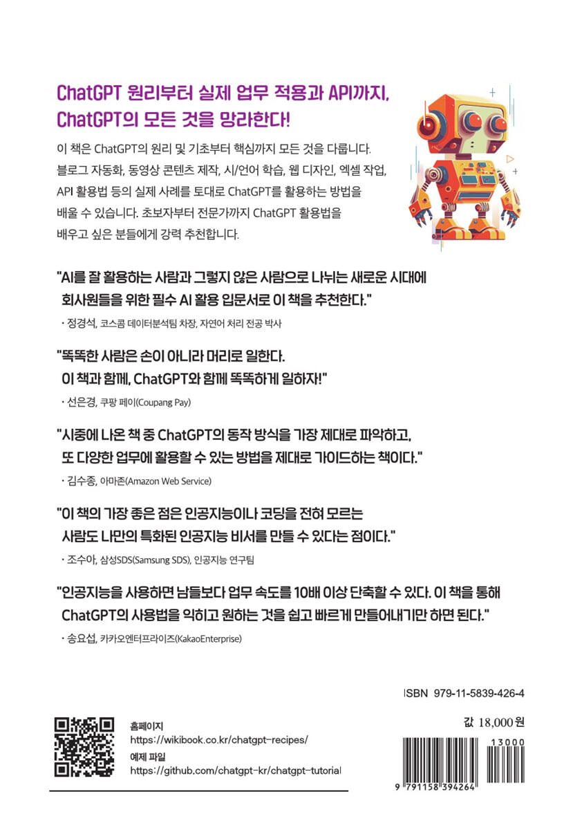 ChatGPT의 전문 분야: 자연어 처리란? 트랜스포머의 등장 ___인공 신경망 ___트랜스포머 ___인코더와 디코더 OpenAI와 언어 모델 GPT GPT 시리즈의 발전 ChatGPT의 등장 (GPT-3.5) GPT의 오해와 한계 2장: ChatGPT와 GPT-3 시작하기 회원 가입 ChatGPT 무료 버전 사용하기 접속되지 않는 경우 OpenAI의 다른 GPT 모델 사용해보기 ___플레이그라운드 사용하기 ___다양한 예제 참고하기 ___다른 GPT 모델 사용해보기 ___최대 길이(Maximum length) ___온도 조절(Temperature) ___빈도수 페널티와 존재 페널티 ChatGPT Plus 사용하기 03장: ChatGPT 튜토리얼 한/영 번역 크롬 확장 프로그램: 프롬프트 지니 ___프롬프트 지니 설치 방법 ___프롬프트 지니 사용 방법 ChatGPT를 위한 프롬프트 가이드 ___프롬프트 엔지니어링 ___답변의 형태를 구체적으로 요청하세요 ___정보, 맥락, 예시를 추가로 제공하세요 ___역할극을 요청하세요 ___영어를 사용해보세요 ___추가 답변을 요청하세요 ChatGPT로 할 수 있는 것들 ___다양한 장르의 콘텐츠 작성 ___프로그래밍 도우미 ___번역 ___텍스트 요약하기 ___정보 또는 설명 요청하기 ___아이디어 얻기 ___마케팅 준비하기 4장: 블로그 글을 대신써주는 블로거 ChatGPT ChatGPT와 대화하며 블로그 글 작성하기 ___블로그 글 주제 선정하기 ___콘텐츠 작성하기 ___해시태그/키워드 선정하기 ___Meta Description 작성하기 ___이미지 삽입하기 ___최종 블로그 글 포스팅하기 크롬 확장 프로그램을 통해 1분만에 블로그 글 작성하기 ___AIPRM for ChatGPT 설치하기 ___키워드를 활용한 SEO 최적화 주제 한 번에 생성하기 ___Title을 활용한 SEO 최적화 글 작성하기 ___다른 사이트 글을 벤치마킹하여 나만의 SEO 최적화 글 생성하기 구글 스프레드시트와 ChatGPT를 활용한 블로그 글 작성 자동화 ___자동화 프로그램 맛보기 ___준비 작업 1 - OpenAI API 키 발급하기 ___준비 작업 2 - 구글 스프레드시트에 확장 프로그램 설치하기 ___자동화 시스템의 구조 ___자동화 프로그램의 테이블 구성 ___자동화에 필요한 구글 스프레드시트 함수 ___입력 받은 주제를 영어로 번역하기 ___ChatGPT에게 블로그 글 작성 요청하기 ___한글로 번역하기 ___활용 방법 및 정리 ___구글 스프레드시트를 통한 블로그 글 자동화의 한계 ___에러가 발생한다면? 5장: 유튜브 동영상을 만들어주는 크리에이터 ChatGPT ChatGPT를 활용하여 유튜브 주제 정하기 ___ChatGPT와 대화를 통해 주제 구체화하기 ___ChatGPT를 활용하여 경쟁 유튜브 영상 벤치마킹하기 ChatGPT를 활용하여 유튜브 스크립트 작성하기 픽토리 AI와 클로바더빙을 활용하여 동영상 제작하기 ___픽토리 AI 내 스크립트 넣기 ___동영상 템플릿 설정하기 ___자막 편집하기 ___배경음악 선택하기 ___스크립트 음성 더빙하기 ___텍스트 넣기 ___동영상 생성 동영상 생성 AI 플랫폼 사이트 추천 6장: 사진을 이용해 글을 써주는 글 작가 ChatGPT Imagga를 활용한 사진 키워드 추출 ___Imagga란? ___Imagga Tagging 기능을 활용한 사진 키워드 추출하기 ___사진 키워드 추출 결과 분석 사진의 키워드를 활용해 시를 쓰는 ChatGPT ___사진에서 추출한 키워드를 활용해 시 작성하기 ___분위기 변경하여 작성하기 ___타깃 독자를 지정해서 작성하기 소설을 쓰는 ChatGPT ___사진에서 추출한 키워드를 활용해 소설 쓰기 ___장르 변경하여 작성하기 ___시대적 배경을 변경하여 작성하기 7장: ChatGPT를 가정 교사와 면접관으로 고용하기 영어 공부하기 ___문법 교정받기 ___ChatGPT에 면접관 역할을 시켜 면접 준비하기 ___영어 단어 공부하기 ___영작하기 ___영어 스피치 공부하기 프로그래밍 언어 공부하기 ___구글 코랩 소개 ___파이썬 강의 계획서 만들기 ___주차별 내용 파고들기 ___에러가 발생한 경우 ___문제 풀이하기 8장: ChatGPT와 AI Art로 시작하는 웹 디자인 미드저니(Midjourney) 소개 미드저니 파라미터 미드저니를 통해 이미지 생성하기 웹 사이트 디자인하기 ChatGPT로 홍보 문구 만들기 DeepL을 활용해 자연스러운 번역하기 웹 사이트에 홍보 문구 삽입하기 웹 디자인을 위한 프롬프트 가이드 미드저니의 유료 정책 9장: ChatGPT로 엑셀 업무 속도 10배 높이기 총 정산액 계산 결제 수단에 따른 정산액 계산 전체 결제기관 리스트 출력하기 신용카드 기관의 수 카운트하기 특정 구매자의 결제 수단 확인하기 10장: ChatGPT로 성공적인 프레젠테이션 준비하기 발표 콘텐츠 작성 발표 슬라이드 제작 ___슬라이드에 이미지 삽입하기 ___텍스트 삽입하기 스크립트 작성 11장: ChatGPT API 맛보기 API 요금 정책 API 실습 ___OpenAI 라이브러리 설치/API 키 입력 ___기본 답변 얻기 ___역할 부여하기 ___이전 대화를 포함하여 답변하기 12장: ChatGPT 사용을 도와주는 크롬 확장 프로그램 최신 정보를 반영해주는 WebChatGPT ___WebChatGPT 설치 방법 ___WebChatGPT 사용 방법 구글 검색과 동시에 ChatGPT 결과를 제공하는 ChatGPT for Search Engines ___ChatGPT for Search Engines 설치 방법 ___ChatGPT for Search Engines 사용 방법 Gmail에서 바로 메일 작성을 도와주는 ChatGPT Writer ___ChatGPT Writer 설치 방법 ___ChatGPT Writer 사용 방법 13장: ChatGPT의 다른 대안, 추천 AI 플랫폼 웹 검색과 챗봇을 동시에: Youchat 챗봇에서 이미지 생성까지: Chatsonic 공동 작업 공간에서 함께 쓰는 인공지능: Notion AI 한글 글짓기 최적화 AI: 뤼