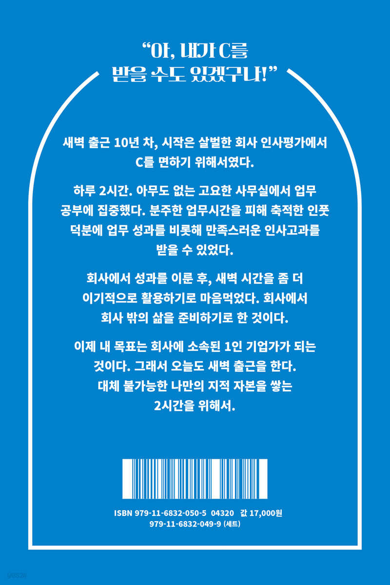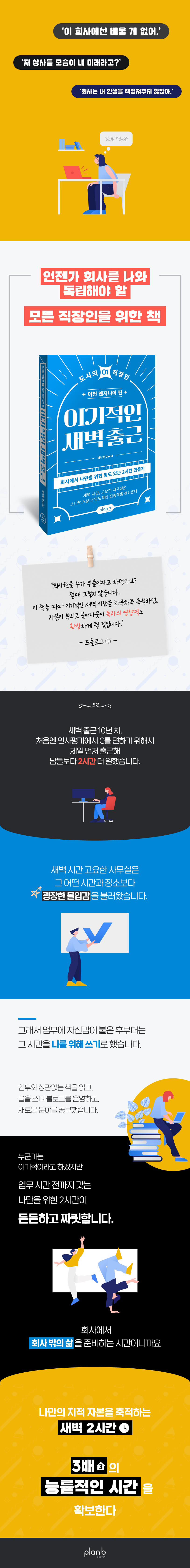 --- p.26 의지력이 고갈되어 일찍 퇴근하는 날은 업무 생각에 마음이 불편했지요. 회사에 남아 있는 날에는 버티기도 힘들뿐더러 집에서 혼자 육아를 하고 있을 아내 생각에 마음이 편치 않았습니다. 그런 상황에서 저는 새로운 묘안을 찾아내게 됩니다. 바로 새벽 출근이었죠. --- p.28 새벽 출근은 꽤 의미 있는 시도였고, 다양한 이유로 매우 유익한 선택이었습니다. 업무에 필요한 역량을 갖추는 차원에서도, 일과 삶의 밸런스 차원에서도, 건강을 지키는 차원에서도 말이지요. 일이 끝나지 않았다면 얼마든지 근무를 연장할 수 있는 야근과는 달리, 새벽 근무는 업무 시작 시간이 정해져 있기 때문에 시간을 효율적으로 써야 했습니다. 당연히 ‘오늘은 무엇 무엇을 해야겠다’라는 계획이 서 있어야 했고, 그 덕분에 회사에 도착하자마자 바로 일을 시작했죠. ‘2시간 동안 의미 있는 걸 해야 한다’라는 생각에 집중력도 높아졌습니다. --- p.30 새벽의 진정한 유익은 이것이 하나의 시스템이 되어 다른 좋은 습관과 결합할 기회가 많이 생긴다는 점에 있습니다. 아침을 먹는 습관, 운동하는 습관, 책 읽는 습관, 글 쓰는 습관 등 체화되면 유익한 습관은 정말 많지만, 이것을 실행할 수 있는 시간을 낸다는 것은 정말 어려운 일입니다. 낮에는 본업에 집중해야 하고, 저녁에는 몸과 마음이 지쳐서 방전되어 있기 때문이지요. 새벽에 일어나는 습관이 정착하고 나면, 평소에 가지고 싶었던 좋은 습관과 결합해서 더 나은 나를 만들어갈 기회를 잡게 됩니다. --- p.55 관점을 조금 바꿔서, 회사를 위해서 하루에 8시간을 투입한 만큼, 나를 위해서 2~3시간 정도를 투입해보는 것은 어떨까요? 어차피 앞으로 십수 년 동안 가장 많은 시간을 보낼 회사에서 내 가치를 올리고 내 영향력을 키우기 위한 투자 시간이라고 생각한다면, 그래서 자발적으로 역량 계발에 시간을 투자한다면 그것은 하기 싫은 노동의 연장보다는 자기계발에 가까울 것입니다. --- p.72 조용한 시간에 나 홀로 앉아서 작전타임을 가지는 것은, 낮 시간에 올바른 일을 하기 위해서도 반드시 필요합니다. 하루의 시작이자 가장 명료한 정신을 가진 새벽 시간에 올바른 작전을 세운 사람만이 낮 시간에 올바르고 가치 있는 일을 할 수 있습니다. 새벽 시간에 하루를 내다보면서 장기적으로 나의 발전 목표가 무엇이었는지, 현재 내 상황은 처음 예상했던 계획과 얼마나 차이가 있는지, 앞으로의 플랜을 수정할 필요가 있는지 등을 평가하는 과정에서 잠재의식 속에 목표를 다시 각인하고 그로부터 행동력을 촉발할 힘을 충전할 수 있습니다. 때로는 냉정하게 지금 나에게 무엇이 부족하며, 그것을 보충하기 위해 어떤 행동을 해야 할 것인지를 판단하는 과정에서 돌파구를 찾을 수도 있습니다. --- p.115~116 |