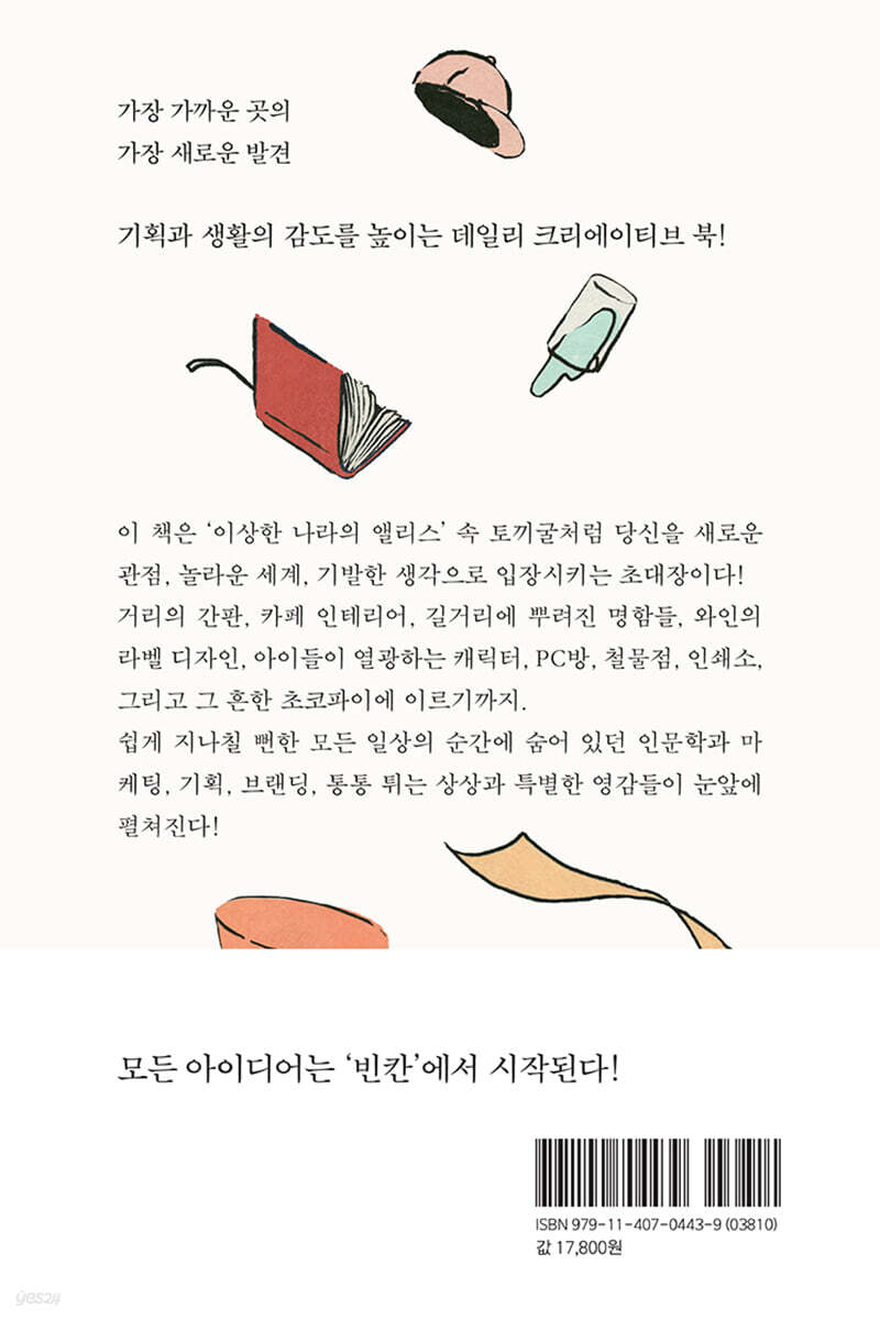 우린 권태에 빠진다. 권태감에서 벗어나 새로운 일상으로 만들기 위한 모든 생각과 행동이 우리의 생활을 찬란하게 빛나게 할 거라 믿는다.” (저자의 말 중에서) 이 책을 보는 동안, 무미건조했던 일상은 무궁무진한 인문학과 마케팅, 기획, 브랜딩, 통통 튀는 상상과 반짝이는 영감의 빈칸으로 가득 찬 세상이 된다. 지금 고민하는 카피, 마케팅, 패키징, 기획 아이디어는 따로 먼 곳에 있지 않다. 오늘 먹은 간식에도, 동료와 수다를 떤 카페에도, 올려다본 나뭇잎 사이로 비치는 햇살에도 있다. 『일상의 빈칸』을 펼치는 순간 독자는 평소에 무시하거나 놓치는 부분을 더욱 기획자의 눈으로 주목하게 될 것이다. 그런 빈칸들을 찾아내어 창의적인 아이디어로 채워나가는 힘이 생길 것이다. 주변의 일상적인 사물, 사건, 인간관계 등이 모두 크리에이티브의 소재가 된다. 이제 당신이 그 빈칸을 멋지게 채울 차례다. 가장 가까운 곳의 가장 새로운 발견 모든 아이디어는 ‘빈칸’에서 시작된다! 기획자, 브랜더, 마케터, 디자이너 등 수많은 크리에이터들이 “인생책”으로 꼽는 『기획자의 습관』은 친구의 선물을 고르고 저녁 차림을 준비하는 등 일상의 모든 계획이 곧 기획임을 알게 하며 10만 독자의 사랑을 받았다. 저자가 심혈을 기울인 3년 만의 신작 『일상의 빈칸』 역시 가장 가까운 곳에서 가장 새로운 발견을 찾는 재미를 주며 기획력의 날을 세우도록 돕는다. ‘크리에이티브는 어떻게 만드나요?’라는 질문에 저자는 창의란 무에서 유를 만드는 게 아니라, A에서 B가 되게 하는 ‘유에서 유’ 행위에 가깝다고 말한다. 앤디 워홀은 마트의 수프캔(A)을 화폭(B)에 옮김으로써 팝아트를 창조했고, 명품 의류브랜드 베트멍은 DHL물류(A)의 로고를 티셔츠(B)에 배치하면서 새로운 ‘잇템’을 유행시켰다. ‘스탠바이미’ 등 이동식 스크린 역시 TV를 거실에서 떼어 옮겨놓은 결과다. 즉 창조란 배치의 힘이며, 우리는 더더욱 정해진 배치를 헝클어트리고 생각을 자유롭게 풀어놓아야 한다. (집안의 가구 재배치도 창의력에 도움이 된다!) 저자는 『일상의 빈칸』을 통해 아이들이 열광하는 포켓몬 빵을 인형뽑기 기계에 배치해놓은 가차샵에서, PC방에 본격적인 식사를 가져다놓은 ‘PC토랑’이라는 네이밍에서, 반가사유상에 마이클 조던의 유니폼을 입혀놓은 디자인에서, 즉 다름 아닌 우리의 생활반경 속에서 반짝이는 수많은 크리에이티브 조각들을 제시한다. ‘빈칸’은 평소 간과되기 쉽다. 글자 자체에 시선이 가지, 글자와 글자 사이 띄어쓰기에 주목하는 이는 거의 없을 것이다. 하지만 글자의 의미를 이해할 수 있는 건 그 띄어쓰기 덕분이다. 우리가 사랑하는 음악 역시 고정된 음표가 아닌 음표와 음표 사이, 빈칸을 메우는 모든 행위와 생각에 흐른다. “일상을 클래식이 아니라, 재즈처럼 생각해보자. 일상을 자유롭게 바꾸어보자.” (저자의 말 중에서) 반복적인 생활에 지쳐 소모감을 느껴본 이들이라면 지금 바로 ‘일상의 빈칸’을 들여다보자. 당신의 기획과 삶의 감도가 저절로 깊어질 것이다. 일상을 새로운 세상으로 만드는 모든 인사이트를 통해 당신의 뇌는 말랑말랑해지고, 당신의 일상은 찬란한 변주를 시작할 것이다. |