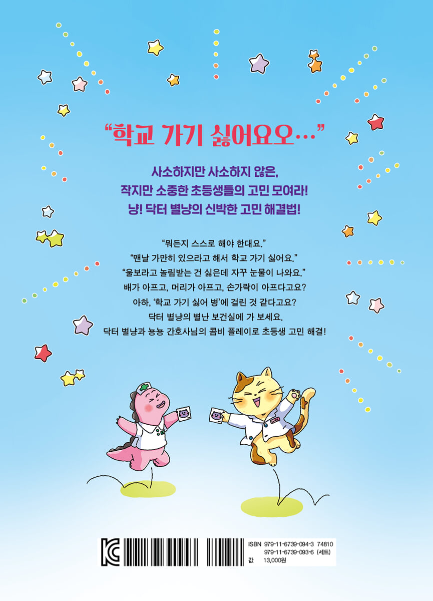 사소하지만 사소하지 않은, 작지만 소중한 초등생들의 고민 모여라! “운동화 끈을 잘 못 묶어서 고민이에요. 이제 초등학생이라고, 혼자 해야 하는 일이 왜 이렇게 많은 거죠? 전 너무 어려워요. 어른들이 도와줬으면 좋겠어요.” _1학년 봄이 “전 가만히 있는 게 제일 힘든데, 학교에 가면 하루 종일 가만히 있어야 한대요. 너무 답답해요!” _1학년 준서 “선생님도 무섭고, 화장실에 혼자 가는 것도 무서워요. 자꾸 눈물만 나오는데, 친구들이 울보라고 놀리는 건 너무 싫어요.” _1학년 담희 학교 가기 싫어서 배가 아프고, 머리가 아프고, 손가락이 아픈 아이들은 다양한 이유를 마음속에 품고 있었어요. 이건 진짜 비밀인데요, 학교에는 이런 아이들에게만 문이 열리는 ‘별난 보건실’이 있어요. 거기에는 냥냥거리며 빗질하는 게 취미인 닥터 별냥과 덩치는 크지만 상냥하고 귀여운 뇽뇽 간호사님이 이런 어린이 친구들을 기다리고 있답니다. 아무도 모르는 마음속 이야기를 들어주는 닥터 별냥의 별난 보건실 이야기 학교 가기 싫은 아이들의 마음속에는 뜻밖의 진심이 숨어 있었어요. 그리고 닥터 별냥은 아이들도 몰랐던 그 마음속 이야기를 마법의 스피커로 꺼내 들려주었답니다. 닥터 별냥이 ‘학교 가기 싫어서 배가 아프고 머리가 아프고 손가락이 아픈’ 아이들에게 건네준 신박한 처방전이 무엇인지 궁금하지 않나요? 여러분도 별난 보건실을 찾아가 보면 어때요? 닥터 별냥과 뇽뇽 간호사님이 여러분을 기다리고 있답니다! 아르아르옹 모르모르옹 미이야아옹~! |