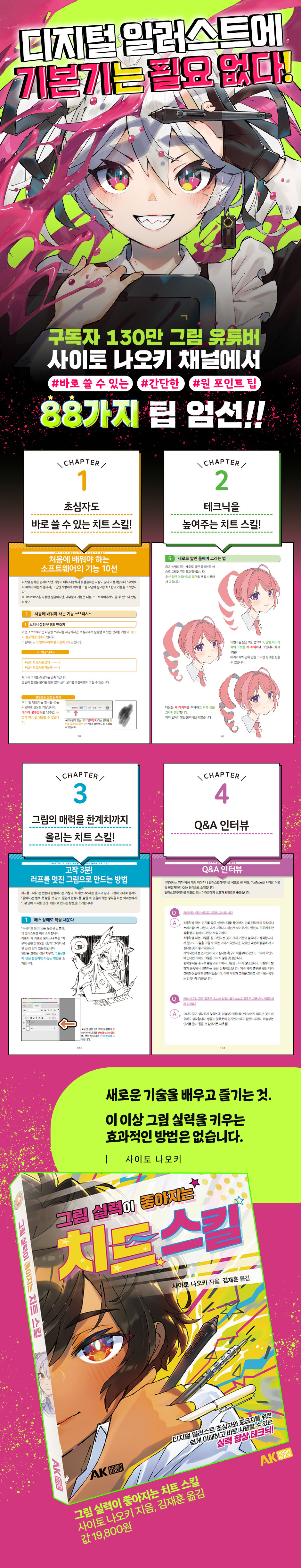 CHAPTER.1 초심자도 바로 쓸 수 있는 치트 스킬! 잘 그리기 위해 필요한 환경 만들기 1 항상 그림 전체를 본다 2 작업 내역 기능을 사용한다 3 도구를 의심해 본다 4 화면 밖의 색을 연한 회색으로 한다 5 자료를 옆에 둔다 6 혼잣말을 한다 7 항상 하던 실수를 기억한다 8 다른 사람의 그림에서 발견한 오류를 기억한다 처음에 배워야 하는 소프트웨어의 기능 10선 처음에 배워야 하는 기능 ~브러시~ 1 브러시 설정 변경의 단축키 처음에 배워야 하는 기능 ~화면 조작~ 2 화면 회전 3 새 창 처음에 배워야 하는 기능 ~레이어~ 4 투명 픽셀 잠그기 5 클리핑 마스크 6 레이어 마스크 7 레이어 이동 처음에 배워야 하는 기능 ~선택 도구~ 8 자동 선택 도구 9 레이어 선택 10 선택 및 마스크 선을 지저분하게 그리는 요령?! 1 펜 설정을 확인하자 2 짧은 선을 지저분하게 그린다 3 긴 선을 지저분하게 그린다 4 모든 선을 지저분하게 그린다 5 깔끔한 선을 그린다 ~실전 해설~ 그림 초심자의 착각 5선! 1 「틀리면 안 된다」라는 착각 2 「선부터 그려야 한다」라는 착각 3 「완성하면 끝」이라는 착각 4 「전부 제대로 그려야 한다」라는 착각 5 「많은 색을 사용하는 편이 좋다」라는 착각 그림 실력 향상 법칙 3선! 1 그리는 시간을 정한다 2 그릴 모티브를 정한다 3 그리는 목적을 정한다 CHAPTER. 2 테크닉을 높여주는 치트 스킬! 이것이 가능하면 프로! 그림의 원칙 3가지 1 처음부터 잘 그리려고 하지 않는다 2 직접 포즈를 잡아본다 3 완성한 뒤에 계속 다듬는다 색 선택의 요령 5선 1 요령 이전에…… 단색 배색을 해보자 2 요령? 유사색 배색을 배우자 3 요령? 난색과 한색을 의식하자 4 요령? 흑백으로 바꿨을 때의 대비가 중요하다 5 요령? 다색일 때는 과도한 명도 차이에 주의하자 6 요령? 무채색을 효과적으로 사용하자 머리카락을 3배 더 잘 그릴 수 있는 방법 1 선으로 그리는 것은 어렵다 2 머리카락을 색의 면으로 그린다 3 뒷머리와 옆머리를 색의 면으로 그린다 4 포인트 머리를 색의 면으로 그린다 5 마지막에 선을 그린다 6 세로로 말린 롤헤어 그리는 법 음영을 넣는 간단한 방법 5선 1 일부러 음영을 넣지 않는다 2 역광(림라이트) 3 렘브란트 라이트 4 스포트라이트 5 밑에서 올라오는 빛 고작 3분! 잘 그린 것처럼 보이는 일러스트 가공 테크닉 1 곡선 기능으로 대비를 높인다 2 스크린 레이어로 애틋함을 더한다 3 머리카락 끝에 그레이디언트를 추가한다 4 그레이디언트 맵으로 통일감을 더한다 5 음영의 그레이디언트를 사용한다 CHAPTER. 3 그림의 매력을 한계치까지 올리는 치트 스킬! 그림을 기분 좋게 그리는 요령 1 일부러 보류한다 2 회색으로 칠한다 3 나중에 그려 넣는다 4 화면을 회전시킨다 5 순서를 파괴한다 6 흐름이 중요하다 고작 3분! 러프를 멋진 그림으로 만드는 방법 1 패스 상태로 색을 채운다 2 선에 색을 넣는 가공 3 간단하게 음영을 넣는 가공 4 그레이디언트 맵을 사용한 가공 5 소개한 테크닉을 조합한 가공 일러스트의 귀여움을 강조하는 비책 7가지 1 목에만 동작을 더한다 2 이마의 면적을 줄인다 3 귀여움에 코는 필요 없다 4 입체감을 무시한다 5 눈이 아니라 속눈썹으로 인상을 만든다 6 홍조를 더한다 7 의상에도 적당히 신경 쓰자 옆얼굴 그리는 요령 1 잘못된 옆얼굴 그리는 법 2 형태 잡는 법 3 옆얼굴을 그린다 4 정면을 바라본다 5 앞으로 고개를 숙인다 6 고개를 뒤로 든다 7 안쪽 눈이 약간 보이는 옆얼굴 7단계로 배경을 간단하게 그린다! 1 무엇을 그릴지 정한다 2 색을 정한다 3 원경의 실루엣을 정한다 4 중경의 실루엣을 정한다 5 전경의 실루엣을 정한다 6 세부를 묘사한다 7 화이트를 사용해 악센트를 더한다 CHAPTER. 4 Q&A 인터뷰 이 책을 선택한 여러분께 |