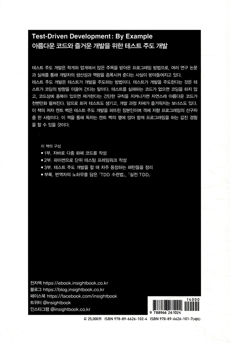 1부. 자바로 다중 화폐 코드를 작성 2부. 파이썬으로 단위 테스팅 프레임워크 작성 3부. 테스트 주도 개발을 할 때 자주 등장하는 패턴들을 정리 부록. 번역자의 노하우를 담은 『TDD 수련법』, 『실전 TDD』 구매 시 참고사항 ★ 실전 TDD 파일 다운로드 링크 ☞ https://url.kr/y1z6vr (4쇄부터 부록CD 대신 파일 다운로드 제공) |