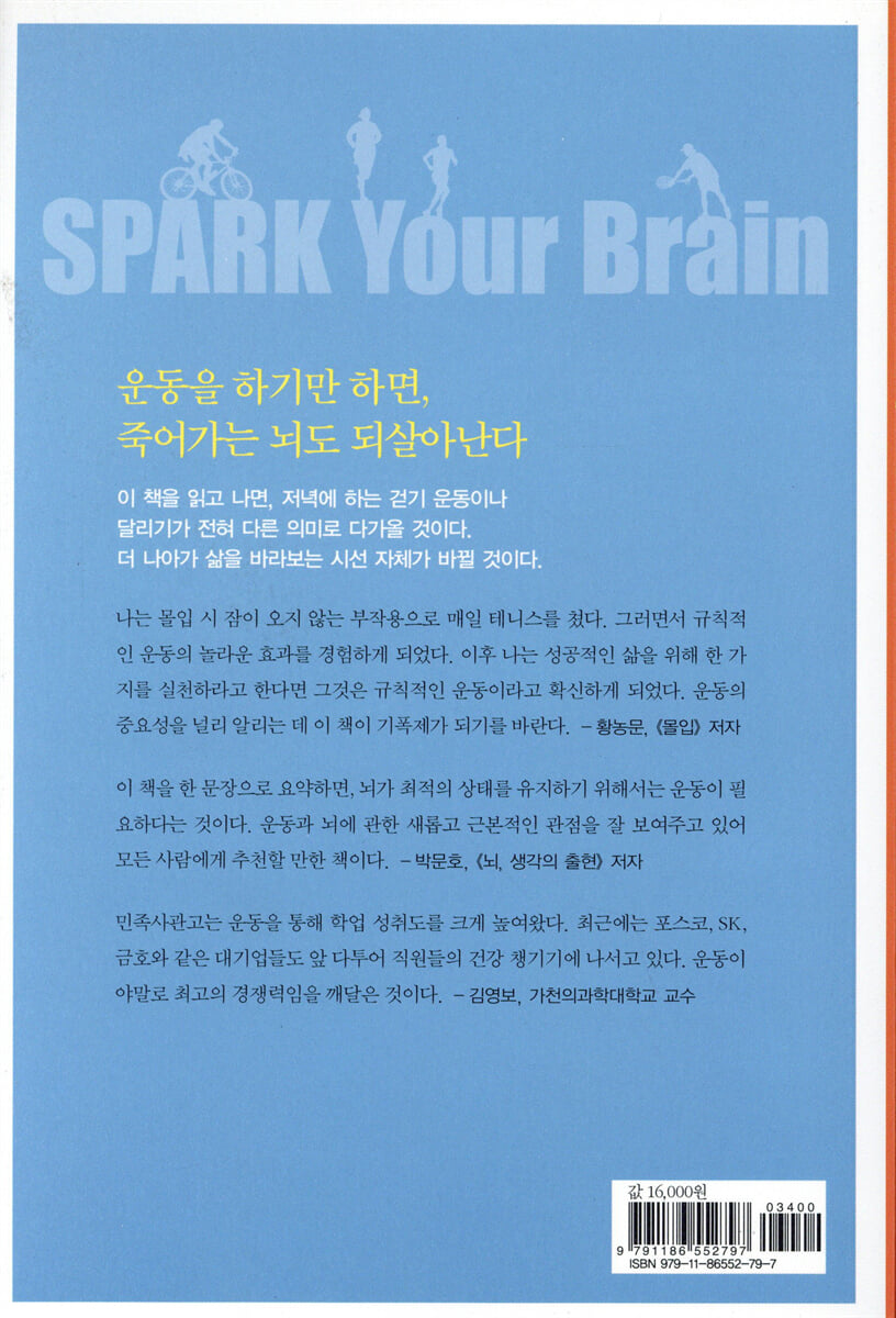 “이 책을 한 문장으로 요약하면, 뇌가 최적의 상태를 유지하기 위해서는 운동이 필요하다는 것이다. 운동과 뇌에 관한 새롭고 근본적인 관점을 잘 보여 주고 있어 모든 사람에게 추천할 만한 책이다.” - 박문호 (《뇌, 생각의 출현》 저자)