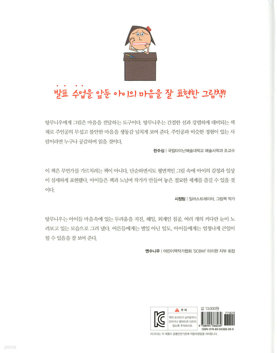 “지금 그대로도 충분히 괜찮아! 힘내!” 이 책의 주인공 링링은 발표 수업을 앞두고 걱정이 많습니다. 친구들 앞에서 발표를 해야 하지만 가슴은 쿵쾅쿵쾅, 온몸은 화끈화끈합니다. 링링처럼 ‘발표’ 소리만 들으면 얼굴이 빨개지고 몸이 굳거나 당황하면 머릿속이 새하얘지고 말문이 막히는 아이들이 있습니다. 이렇게 아이들이 발표를 두려워하는 이유는 무엇일까요? 여러 가지 이유가 있겠지만 가장 큰 이유는 자신감이 부족하기 때문입니다. 보통 발표를 할 때는 자리에서 일어나게 됩니다. 이때 자신감이 없는 아이들은 교실 안에 있는 모든 친구들이 자기만 쳐다본다고 생각합니다. 그리고 틀린 답을 말하면 친구들에게 놀림을 받거나 선생님이 자신이 싫어할 거라고 믿어버립니다. 결국 아이는 발표할 때마다 엄청나게 긴장을 하고, 거기에 두려움이 더해져 점점 발표하는 것이 싫어지게 됩니다. 만약 내 아이가 주인공 링링처럼 발표하는 것을 두려워한다면, 아이가 왜 발표하는 것을 싫어하는지 스스로 털어놓을 수 있는 분위기를 만들고, 아이가 부끄러움을 이겨 내고 발표를 잘할 수 있도록 곁에서 응원해 주는 것이 좋습니다. 아이는 누구보다 부모가 해 준 말에 큰 용기를 얻으니까요. 2014년 볼로냐 국제 어린이 도서전 올해의 일러스트레이터 선정 작품 제3회 펑즈카이 아동 그림책 우수상 수상 작가 탕무니우의 그림책 탕무니우는 대만의 권위적인 신이아동문학상, 펑즈카이 아동 그림책 우수상을 비롯해 2014년 볼로냐 국제 어린이 도서전 일러스트레이터로 선정된 대만을 대표하는 그림책 작가입니다. 『아주 무서운 날 ? 발표는 두려워!』는 아이들의 마음속 두려움을 아이의 시각으로 재미있고 귀엽게 그렸습니다. 또한 매우 간결한 선과 강렬한 색채로 주인공 링링의 당황스러운 표정과 몸짓을 생생하게 표현했습니다. 이 책은 그동안 주목받지 못했던 대만의 그림책에 대한 인식을 새롭게 바꾸어 줄 최고의 그림책입니다. |