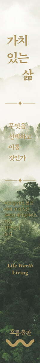 프롤로그_ 이 책이 당신의 삶을 바꿔놓을 것이다 1부 뛰어들기 1장 추구할 가치가 있다는 건 무슨 의미인가? 2장 어디서부터 시작해야 하는가? 2부 심해 3장 우리의 대답은 누구를 향하는가? 4장 좋은 삶은 어떤 느낌인가? 5장 무엇을 바라며 살아야 하는가? 6장 어떻게 살아야 하는가? 3부 해저면 7장 레시피 테스트 8장 우리 삶의 진짜 큰 그림 4부 한계를 마주하기 9장 누구나 실패할 수 있다 10장 때때로 삶은 고통스럽다 11장 피할 수 없는 삶의 고통에 대하여 12장 모든 것이 끝날 때 5부 다시 수면으로 13장 아직 해야 할 일이 남았다 14장 변화는 어렵다 15장 유지, 변화보다 더 어려운 과업 에필로그_ 당신만의 고유한 삶의 가치를 발견했기를 |