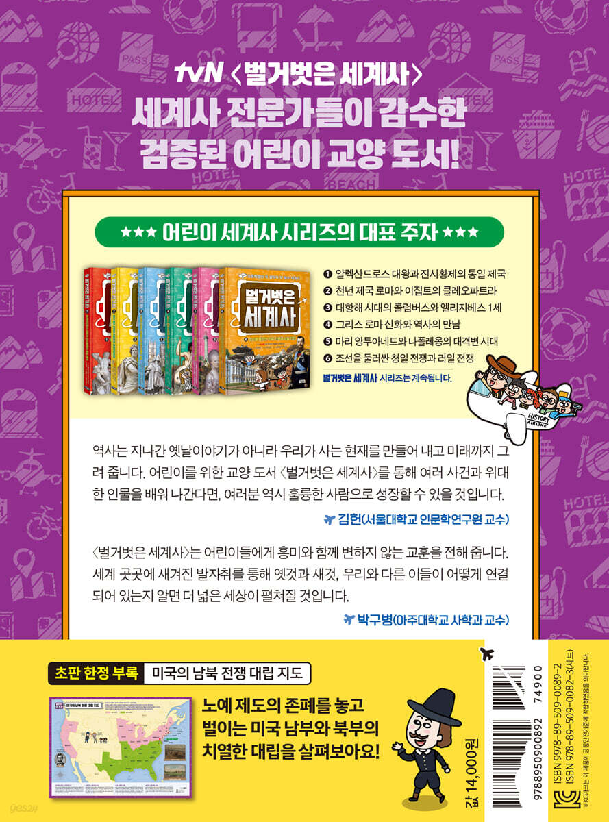 세계사 명강의들을 어린이의 눈높이에 맞춰 알려 주는 ‘온택트 스토리텔링 어린이 세계사’ 역사는 지나간 옛날이야기가 아니라 우리가 사는 현재를 만들어 내고 미래까지 그려줍니다. 역사를 넓고 깊게 이해한다면 새로운 세상을 만들 힘을 얻게 되죠. 세계사 속에는 새 시대를 이끌고 큰 업적을 이룬 인물들이 많습니다. 그들에겐 공통점이 있죠. 끊임없이 자신을 갈고닦으면서 노력했다는 점입니다. 어린이를 위한 교양 도서 [벌거벗은 세계사]를 통해 여러 사건과 위대한 인물을 배워 나간다면, 여러분 역시 훌륭한 사람으로 성장할 수 있을 것입니다. - 서울대학교 인문학연구원 교수 김헌 새롭게 태어난 [벌거벗은 세계사]는 어린이들에게 흥미와 함께 변하지 않는 교훈을 전해 줍니다. 알려진 것은 다시 돌아보게 하고, 감춰진 것은 드러내어 더욱 풍부한 세계의 역사를 만날 수 있지요. 세계 곳곳에 새겨진 발자취를 통해 옛것과 새것, 우리와 다른 이들이 어떻게 연결되어 있는지 알면 더 넓은 세상이 펼쳐질 것입니다. - 아주대학교 사학과 교수 박구병 온 가족이 함께 보는 대한민국 대표 예능 교양 프로그램 [벌거벗은 세계사] tvN [벌거벗은 세계사]는 대한민국 대표 ‘스토리텔링 세계사’ 교양 프로그램입니다. 자유롭게 여행하는 일이 어려운 시기가 왔을 때 ‘어떻게 하면 안전하게 세계 여행을 즐길 수 있을까?’ 하는 생각에서 탄생하게 되었습니다. 전 세계 곳곳을 ‘온택트’로 둘러보며 각 나라의 명소를 살펴보고, 다양한 관점에서 우리가 몰랐던 세계의 역사를 각 분야의 전문가와 함께 풀어나갑니다. 어른들은 물론, 어린이들이 보기에도 유익한 내용이기 때문에 온 가족이 모여 볼 수 있는 프로그램으로 인기를 얻기 시작했고, 교수님들의 스토리텔링이 가미된 흥미로운 강의 내용은 연일 화제가 되었습니다. 이 프로그램을 통해 온 가족들이 모여 세계사 강의를 들으면서 우리나라와 다른 나라가 왜 현재와 같은 상태에 이르게 되었는지, 내가 가보지 않은 나라의 삶의 방식과 가치를 이해하며 이야기를 나눌 수 있게 되었습니다. 어린이들이 세계사를 배워야 하는 이유 그렇다면, 어린이는 '세계사’를 왜 공부해야 할까요? 우리가 좋아하는 음악이나 그림 작품 등을 떠올려 보세요. 다양한 국가의 사람들이 같은 문화를 소비하고 열광하는 일이 늘어나고 있습니다. 앞으로는 더욱 많은 세계인과 교류하고 어울려 살아가게 될 것입니다. 이런 상황 속에서 어린이들이 더 넓은 세상에 잘 적응하고 꿈을 펼치기 위해서라도 세계사를 알아야 합니다. 아이들은 중학교 때 처음으로 '역사' 과목을 접합니다. 예전에는 한국사를 선행 학습한 후, 세계사를 배웠는데, 21학년도부터는 세계사적 맥락에서 한국사를 이해하자는 목적으로 세계사를 공부한 후에 한국사를 배웁니다. 초등학교 때 세계사에 대한 학습이 먼저 이루어지면, 중학교에 가서 좀 더 수월하게 역사 과목을 공부할 수 있습니다. 세계사를 알면 한국사 또한 더 재미있어집니다. 우리나라의 역사도 세계사의 거대한 흐름과 연결되어 있으니까요. 우리가 알고 있는 강화도 조약, 을미사변을 우리 역사 안에서만 보면 사건의 실상을 다 알 수 없습니다. 당시 청과 일본, 러시아와의 관계, 각국의 경제 상황까지 함께 들여다보아야 사건의 원인과 결과를 파악할 수 있죠. 이를 통해 과거의 일을 반면교사 삼아 같은 실수를 반복하지 않을 수 있습니다. 세계사를 공부하여 우리가 사는 세상을 제대로 이해하고 더 나은 방향으로 나아가게 하는 힘을 길러 보세요. 어린이 눈높이에서 재탄생한 [벌거벗은 세계사] 출간! * 초등학생이 꼭 알아야 할 세계사 강의만 엄선 문명, 제국, 신항로 개척, 전쟁 등 세계사의 필수 키워드를 카테고리화하여 지금까지 방영된 회차 중 교과서에서 중요하게 다루고 초등학생이 꼭 알아야 하는 세계사 강의를 엄선하였습니다. 자칫 어려울 수 있는 교수님들의 강의 내용을 어린이의 눈높이에서 쉽게 설명하여 역사적 사실들을 재미있게 전달합니다. 초등학생 고학년부터 예비 중학생까지 꼭 알아야 하는 세계사 교과 개념을 스토리 속에 자연스럽게 녹여냈습니다. * 방송 출연 전문가들이 감수한 검증된 역사 콘텐츠 [벌거벗은 세계사]에 방영된 강의를 새롭게 풀어내고 재구성한 만큼, 박구병 교수(아주대학교 사학과 교수) 조관희 교수(상명대학교 중어중문과 교수), 윤영휘 교수(경북대학교 사학과 교수), 김헌 교수(서울대학교 인문학연구원 교수) 등 [벌거벗은 세계사]에 직접 출연한 전문가들의 꼼꼼한 감수를 받아 내용에 대한 신뢰를 높였습니다. * 개성 있고 매력적인 캐릭터들과 함께 떠나는 여행 세계사를 배경으로 한 게임에 푹 빠진 겜돌이 ‘강하군’부터 슛돌이 공격수이자 반전 매력의 ‘공차연’, 요리사를 꿈꾸는 먹방 유튜버 ‘왕봉구’와 다른 나라에서 온 외국인 친구까지! 각기 다른 매력의 친구들과 함께 히스토리 에어라인을 타고 지루할 틈 없는 여행을 시작합니다. 아이들의 눈높이에서 생각하고 때로는 엉뚱한 질문을 하는 캐릭터들을 통해 책을 좀 더 재미있게 읽을 수 있습니다. 그리고 이들을 유