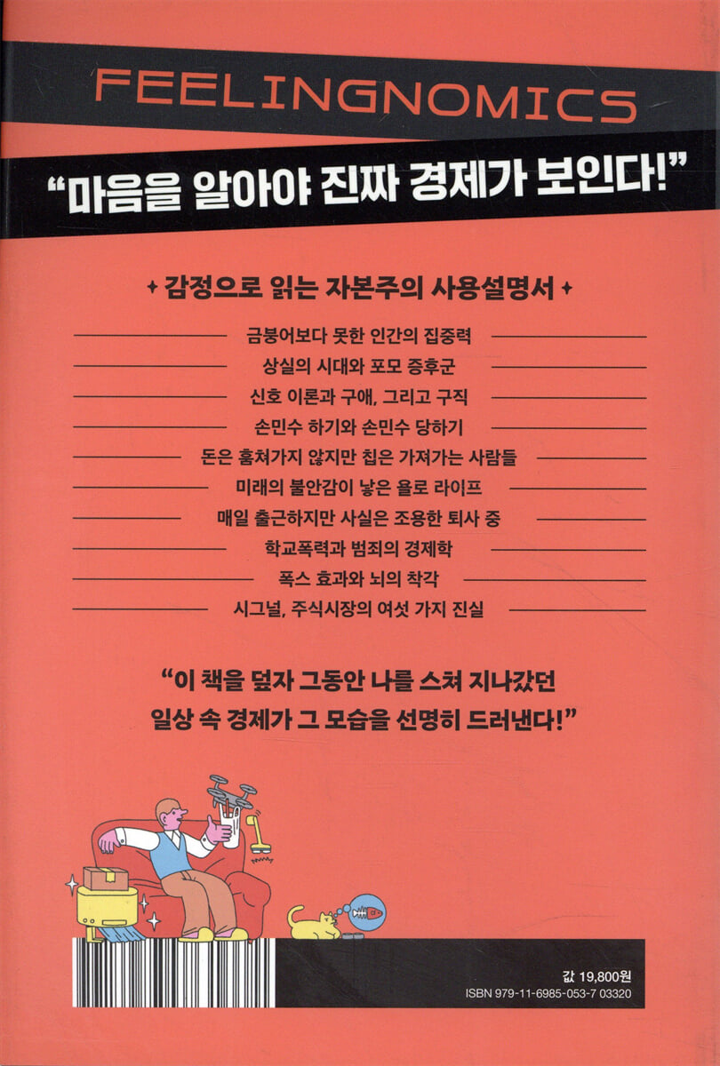 야성적 충동, 감정이 지배하는 자본주의 세계 경제학에서 꼭 다루어야 하는 감정의 중요성 투자, 인간관계, 마케팅에 모두 성공하려면? 제1강 · 나를 위한 가벼운 사치: 생활 속 경제 지표를 읽는 시간 불황이 오면 늘어나는 립스틱 매출 속옷과 치마 길이의 패션 경제학 시대에 따라 변하는 경기 측정 방법 제2강 · 지루함과 짧으면 돈이 되는 것들: 이야기에 집중이 필요한 시간 겨우 8초, 금붕어보다 못한 인간의 집중력 자극적인 카피에 빼앗기는 판단력 주목을 끄는 헤드라인의 중요성 고객의 마음을 사로잡는 언어와 브랜드 도둑맞고, 도둑질하는 집중력 제3강 · 상실감이 부르는 치명적인 화: 자존감이 필요한 시간 상실의 시대와 포모 증후군 ‘벼락 거지’가 될까 두려운 사람들의 투자 마케팅에 휘둘리는 포모의 모습 아무것도 선택하지 못하는 사람들, 포보 제4강 · 우유부단을 해결할 수학의 힘: 평생의 짝을 찾고 다가가는 시간 비서 문제와 의사 결정 짝을 찾는 과정에서의 타협 신호 이론과 구애, 그리고 구직 사랑의 방정식을 구성하는 3요소 제5강 · 모방이 부른 경제의 자화상: 동경과 손민수를 숙고할 시간 모방과 동경이 만드는 소비 손민수 하기와 손민수 당하기 긍정적 네트워크 효과의 가치 제6강 · 애착이 부르는 편견과 삽질: 애정과 집착을 구분할 시간 소유물에서 느끼는 애착 이득과 상실에 대한 인간의 편향 닻 내림과 보유 효과 자기 과신과 편애에서 벗어나기 제7강 · 신뢰감이 만드는 후광 효과의 진실: 주관과 객관을 분리할 시간 후광 효과와 콩깍지 경영자의 후광 효과와 올바른 투자 이미지 메이킹, 기대와 편견 사이에서 객관화를 방해하는 인지 오류 삼총사 제8강 · 상황에 따라 잔혹해지는 인간의 심리: 폭력과 범죄에서 벗어나야 할 시간 잔혹함의 대명사, 가스라이팅 학교폭력과 범죄의 경제학 돈은 훔쳐가지 않지만 칩은 가져가는 사람들 깨진 유리창 이론과 범죄 심리 제9강 · 불안과 불공평함의 경제관: 욜로와 파이어족을 꿈꾸는 시간 미래의 불안감이 낳은 욜로 라이프 분노의 시대와 앞으로의 변화 돌아온 짠테크의 시대와 세계 최고 부자의 일 빨라진 은퇴 연령, 파이어족이 답일까? 제10강 · 사소함이 부르는 재앙: 안전 불감증을 끊어내야 할 시간 사소함이란 감정의 이중성 주주가치를 훼손하는 기업의 행태 하인리히의 법칙과 도미노 이론 시스템적 위기 관리를 강조한 재해 연쇄 이론 파킨슨의 법칙, 사소함의 법칙 제11강 · 무기력감이 주는 직장생활의 번뇌: 사직과 해고란 갈림길의 시간 팬데믹과 대퇴직의 시대 매일 출근하지만 사실은 조용한 퇴사 중 일자리 시장의 키워드 엿보기 조용한 퇴사의 진정한 의미를 찾아서 제12강 · 자신감과 좌절감 사이: 신호와 소음을 판별할 시간 누락과 오경보 사이에서 소음을 일으키는 군중심리 자기 과신은 신호가 아닌 소음 시그널 - 주식시장의 여섯 가지 진실 제13강 · 동정과 연민이 주는 힘과 오류: 신화와 오해를 경계할 시간 언더독과 언더도그마 현상 시가총액 1위 애플이 언더독? 언더독 마케팅을 활용하는 기업들 공감 경영과 언더도그마 극복 제14강 · 압박감으로 승리를 부르는 필살기: 비장함과 무모함을 구별할 시간 승리와 패배를 결정짓는 배수진 배수진이 주는 압박감 신빙성 있는 위협의 혜택 환경을 바꿔 목표를 이루는 가두리 기법 신빙성을 확보하는 세 가지 전략 제15강 · 권위와 소속감의 모래성: 착각과 현실을 파악할 시간 폭스 효과와 뇌의 착각 전문가는 자기 일에서는 완벽할까? 다단계 피라미드와 링겔만 효과 권위를 활용한 폰지 사기 제16강 · 편안함이 부른 일상의 혁신: 게으름과 AI를 활용할 시간 게으른 뇌가 내리는 결정과 인지 오류 챗GPT가 몰고 온 혁명을 보며 빌 게이츠가 게으른 사람을 좋아하는 이유 제17강 · 순수에 대한 온전한 갈망: 사랑과 물질의 순도를 잴 시간 사랑에도, 물질에도 순도가 있다 나를 채워줘, 2% 부족할 때 순도 100%의 사랑이 있을까 제18강 · 공감의 진정한 의미: 상생 경영을 생각해 볼 시간 진정한 교감이란 무엇일까? 삼국지로 바라본 상생 경영 진실은 독점할 수 없다지만 제19강 · 행복과 현타 사이의 방황: 소득과 행복의 관계를 음미할 시간 현타를 느끼는 순간 행복은 달아난다 행복의 개념과 절대적인 조건 논쟁 직장인의 현타 사례와 비교의 함정 이스털린의 역설을 대하는 우리의 자세 제20강 · 혁신과 설렘의 미학: 첫사랑이 남긴 미련을 회고할 시간 슘페터와 드러커, 새로움의 추구 스티브 잡스와 네오필리아 그리고 ‘한가지 더’ 우리가 혁신과 혁명에 주목해야 하는 이유 미완결된 첫사랑의 설렘과 자이가르닉 효과 에필로그 · 경제는 심리이자 감정이다 밀당 자본주의 앞에 선 당신의 선택 무의식이 지배하는 시장에 선 소비자와 판매자의 싸움 야성적 충동과 제조업 구매관리자지수 기대 심리와 심리 위축에 민감한 정부 자본주의의 거대한 동인으로서의 감정 |
