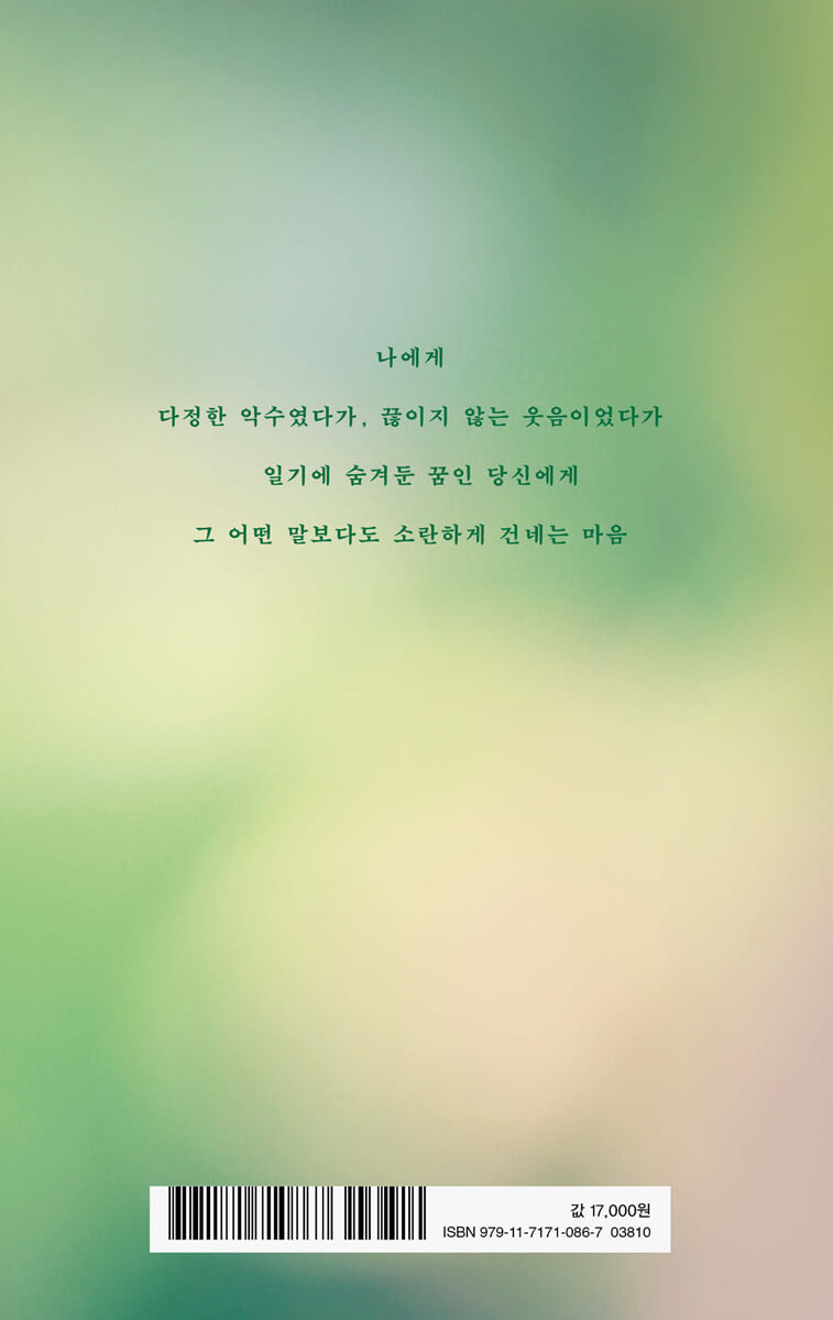 1부. 매일이 화창하다는 예보 작가의 말 / 숲 / 매일이 화창하다는 예보 / 초록 / 너는 / 노트 속 비밀 정원 / 애틋한 월담 / 날이 참 좋네요 / 청혼 / 지금 / 바람이 네 얼굴로 조각되는 밤 / 흰 민들레 문구점 / 물망초의 비밀 / 밤의 유영 / 허리가 푸른 돌고래 / 접시꽃 / 문하생의 서재 / 너를 쫓는 근위병 / 사월 / 바람의 첫 문단 / 약속 / 꽃구경 / Y에게 / 호흡 / 별의 자백 / 팔월 / 장밋빛 인생 / 물병자리 / 아타카마 / 고요한 침식 / 별자리 / 달의 이야기 / 휘청 / 재난 25호 / 엔딩 크레딧 / 자목련 색을 닮은 너에게 2부. 그대는 나의 여름이 되세요 도둑이 든 여름 / 맑은 곳에도 비가 내린다 / 그림자 / 이렇게 여름은 시작된다 / 사월 십삼 일에 관하여 / 당신을 기어이 사랑해서 오늘도 밤이 깊다 / 꿈에 / 그 애 / 사과꽃 / 여름밤 / 다섯 번째 계절 / 불나방의 자살 / 꽃병 / 별 1 / 별 2 / 별 3 / 우주행 러브레터 / 새벽 첫차 / 세상의 빛깔 / 능소화 / 손 / 파도 / 강물이 우는 방법 / 꽃밭 / 잠수부 / 천국 / 당신은 나의 것 / 장미 도둑 / 버들잎 / 비행운 / 여름 증후군 / 호우경보 / 소낙비 / 가로등 / 판타지 소설 / 흰 꽃이 향기가 짙다는 속설 3부. 사랑할 것이 없어진 사람들의 이야기 못 갖춘 문장 / 안녕이라는 이름 / 유실물 / 사랑할 것이 없어진 사람들의 이야기 / 마음에 당신이 / 달이 지는 속도 / 네가 밤에 / 세이렌 / 따뜻한 문장 / 질식 / 낡은 고백 / 진통의 이야기 / 그 꽃 / 테잎에 녹음된 꿈 / 비탈길 / 장마 / 바늘 / 정류장 / 너의 의미 / 우울한 공회전 / 장마전선 / 상사화 꽃말 / 가와 을 / 수채화 / 이끼 / 불명열 / 다음 생에는 내가 너를 가져갈게 / 쓸쓸 / 환절기 / 아침의 단막극 / 303호의 후유증 / 나에게 사랑은 / 그 애에 관하여 / 엔딩은 있는가요 4부. 내 슬픔의 종점에는 네가 있을까 당신이 이 책을 본다면 좋겠습니다 / 따뜻한 평화 / 비는 내리고 / 하고많은 것들 중에 당신을 사랑하였다 / 물별 / 월식 / 몽사 / 섬 / 가장 아름다운 얼굴을 한 비극 / 마르지 않는 강 / 옛 꿈 / 사진 보관함 / 귀 하나에 관하여 / 별똥 / 강물 / 무인도 / 사춘기 / 은색 철제 거울 / 필사본 / 눈보라 밤 전차 / 멍 / 등장인물 / 은하 / 해빙 / 그 애의 속임수 / 장작 / 오프닝 크레딧 / 우주 끝에는 보물이 있다 / 꽃여울의 전설 / 네온색 다이너마이트 / 밤은 죄가 없다 / 된바람 / 당신의 깊이 / 무인 서점 / 창밖의 온온한 풍경을 기억하기 위하여 |