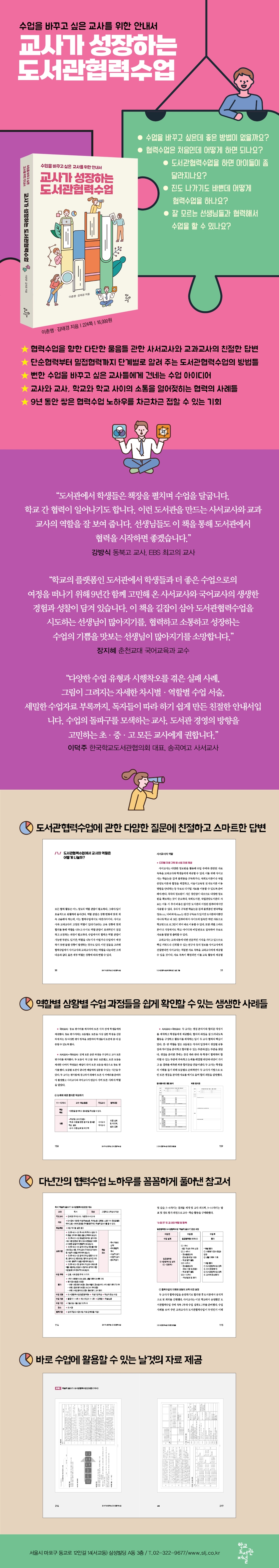 --- 「왜 도서관협력수업을 해야 하는가?」 중에서 사서교사의 정보활용교육은 정보 탐색, 이용, 종합, 평가의 과정을 교육하여 학생의 정보활용 역량을 향상시킨다. 특히 국어, 사회, 도덕, 과학 등 자료 탐구를 교수·학습 방법으로 활용하는 교과와 연계하면 해당 교과의 성취 기준 달성에 큰 도움이 된다. --- 「사서교사가 정보활용교육을 하는 협력수업」 중에서 ‘밀접협력형 수업은 여러 교과와 연계하여 다양한 교육과정을 만들고 학생의 자기 주도 학습 능력과 융합적 사고 역량을 키우는 것을 지향하는 교육 패러다임의 변화와 맥락이 같다. --- 「수업 설계부터 평가까지 함께하는 협력수업」 중에서 도서관은 교과 융합이 원활하게 이루어질 수 있도록 활동 공간을 제공하고 사서교사는 수업에 필요한 자료를 제공하고 정보활용교육을 통해 학습자가 능동적으로 자료를 탐색하고 정보를 종합할 수 있도록 안내할 수 있다. --- 「여러 교사가 함께하는 학교도서관을 활용한 융합 수업」 중에서 우리의 융합은 초학문적 접근을 지향한다. 초학문적 통합은 교과 간에 공통 개념, 문제를 추출하여 다루는 게 아니라 실생활의 맥락에서부터 시작한다. 학생의 질문과 관심에서부터 학습이 시작되기 때문에 개별 학문 간 경계가 허물어지고 문제를 해결하는 과정에서 교과는 자연스럽게 접목된다. --- 「여러 학교 교사가 함께하는 학교도서관을 활용한 교과 융합 수업」 중에서 수업을 할수록 학생들은 교단이 아니라 자신들 바로 옆에 두 교사가 있다는 사실을 자연스러워했습니다. --- 「맺음말」 중에서 |