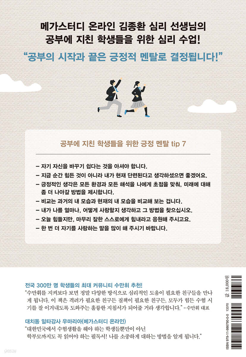 --- p. 29 여러분이 유튜브나 영상 매체를 보면서 느끼는 정말 대단한 사람들 있잖아요. 그 사람들이 하나하나 얘기했던 ‘나 이렇게 해서 성공했다! 난 이런 과정을 했다’ 등을 보고 똑같이 따라 합니다. 그리고 실패합니다. 그런데 보십시오. 그 사람의 기준을 가지고 왜 여러분이 실패했다고 이야기하십니까? 아니에요!! 자신을 보십시오. 자기를 보십시오. 내가 어디서부터 시작해야 하는지 생각하고 조금씩 조금씩 나아가세요. 제가 여러분께 자신 있게 말씀드린 건 이겁니다. --- p. 34 제발 자만하지 마시고 지금부터 대비하길 바랍니다. 불안이라는 감정에 대해서 조금 예민한 성격을 지니신 분들이라면 회피 동기가 아니라 접근 동기로 돌리세요. 여러분이 접근 동기를 자주 인식하다 보면 모의고사에 대해서 불안하기보다는 ‘이 모의고사가 본시험이 아니라서 다행이다. 이 모의고사 때문에 수능 때 실수할 가능성이 줄어든다’라는 긍정적인 사고의 관점을 지닐 수 있다는 사실! 이걸 꼭 명심하시고요. 이렇게 모의고사를 대하다 보 면 본 시험도 같은 마음으로 대할 수 있을 겁니다. --- p. 59 긍정적인 생각은 나에게 놓인 환경을 긍정적인, 나에게 도움이 되는 해석을 하게 해 미래에 대해 좀 더 나아갈 긍정적 방법을 제시합니다. 긍정적으로 되어 가장 좋은 것은 적극적인 사고방식의 함양이에요. 수동적인 사고방식은 여러분을 변화시키지 않습니다. 똑같은 환경이라도 해석을 다르게 하셔야 합니다. --- p. 82 열등감을 계속 가지고 있으면 ‘뭘 해도 안 돼!’라는 생각과 안 되는 나의 미래만 생각하다 보니 결국 불안한 상태가 되죠. 그러면 정체된 삶을 살기 시작합니다. 그리고 1년이 지나고 2년이 지나도 변화되지 않는 내 모습을 보고 “나는 왜 이렇지?”라며 나락으로 떨어질 수밖에 없습니다. 그렇기에 이 글을 보시는 여러분은 자신의 장점을 찾아보기 바랍니다. 자신의 장점을 아는 사람 많이 없습니다. 그 장점을 찾으면 아마 좋은 친구 A, B, C 그다음 D는 자신이 되며, 진정한 친구가 된다는 점을 꼭 명심하셨으면 좋겠습니다. --- p. 100 많은 학생들이 한 시간 공부하는 것에만 신경 썼지, 공부한 내용을 습득하기 위한 준비는 전혀 하지 않아요. 그러나 운동을 하기 전에 준비 운동을 해야 안 다치듯이 여러분이 공부하기 전에 한 시간 내용을 습득할 수 있는 내 컨디션, 내 감정, 내 무의식의 상태를 잘 조절하고 좋은 환경을 만들어야 합니다. --- p. 151 여러분이 어떤 걸 시작하면 누구나 하는 것이 아니고 아무나 못하는 겁니다, ‘어렵다’라는 마음으로 시작하면 훨씬 더 그 과정이 괜찮다는 점을 명심하셨으면 좋겠습니다. 아시겠죠? 아! 제일 중 요한 것이 있습니다. 끝까지 포기하지 말라는 것이죠. --- p. 163 그렇다면 내가 나를 위해 해야 하는 게 무엇일까요? 두려움이 생겼다면 인정하고 받아들이는 거예요. 어떻게든 두려움을 벗어나려고만 하지 마시고요. 두려움을 맞닥뜨렸을 때 어떻게 대처할 지, 두려움에 대항하는 그 모습만 생각하고 계속 자신을 바꿔나가셨으면 좋겠어요. --- p. 176 다른 것에 의존하지 마십시오. 스스로 힘을 키우십시오. 소극적 동기는 오래가지 못합니다. 왜? 없어도 그만이니까. 그런데 적극적 동기는 내가 지금 행동이라는 실천을 통해서 투자했기 때문에 투자한 것을 아까워하며 못 놓칩니다. 아까워서 못 놓치고 스스로에 의지하다 보면 어느 순간 의지력이 생기면서 어떤 일에 대해 어떻게든 되게 하는 방식을 머릿속에 고민합니다. --- p. 187 특히!! 3학년 여러분, 재수생 여러분 왜 공부합니까? 여러분은 완벽한 수험생입니다. ‘그래! 나는 재수생이야!’ ‘나는 고3 수험생이야!’라고 인정하면 좋겠습니다. 그러면 현재의 고통을 받아들여 수험 생활에 더 잘 집중할 수 있어요. 훨씬 더 좋은 기분으로 수능시험 보는 마지막까지 잘 해낼 수 있을 겁니다. ‘견장 효과’ 아시죠? 아무것도 아닌 사람이라도 아무리 내향적인 사람이라고 할지라도 ‘견장’ 하나 채워주면 그 견장에 맞게 행동하게 돼 있어요. --- p. 202 경험 자체는 중요하지 않아요. 경험이 중요한 게 아니라 여러분이 원하는 것은 ‘경험적 지식’이라는 것을 생각하고 있어야 합니다. 저는 오프라인 강연을 하면서 학생들한테 항상 물어보는 이야 기가 있습니다. --- p. 215 6월 평가는 어떤 의미입니까? 여러분이 수능에 대해서 어떠한 대처 능력을 지녀야 할지 보는 거지, 한 번 시험 잘 쳤다고 “엄마 아빠 잘 쳤습니다” 이렇게 자만하라고 치르는 건 절대 아닙니다. 6월 평가원 모의고사를 못 쳤다고 해서 내 ‘인생이 끝났다!’ ‘나는 수능에서 이 점수가 나올 거니까 더 이상 공부할 필요 없어’라는 성급한 생각을 하는 것도 절대 아니라는 거죠. 이 상황을 파악하려면 눈치가 빨라야 합니다. --- p. 228 |