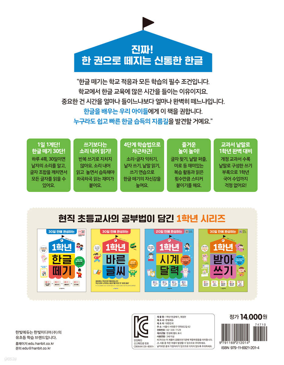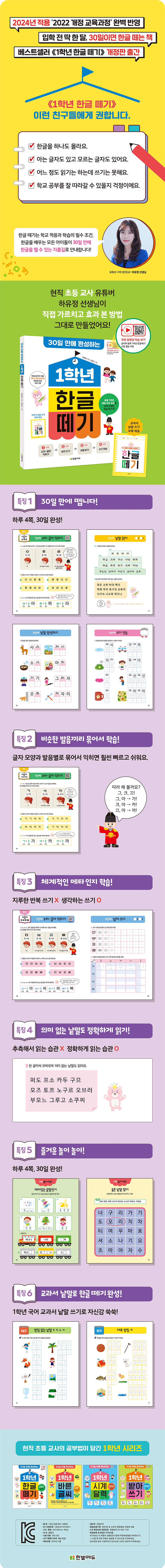 한글 학습서의 새로운 표준 《1학년 한글 떼기》 2024년부터 7년 만의 새 교육과정인 ‘2022 개정 교육과정’이 교육 현장에 적용되었습니다. 2022 개정 교육과정 가운데 가장 큰 폭으로 변화한 것은 단연 초등 1, 2학년 국어 교과입니다. 이번에 출간된 개정판 《1학년 한글 떼기》는 바뀐 초등 1학년 국어 교과서와 동일하게 한글 창제 원리에 따른 기초 문법 체계를 따르고 있습니다. 기존의 한글 학습서처럼 ㄱㄴㄷ이나 가갸거겨부터 익히는 것이 아니라, 기본 모음자를 먼저 익히고 자음자-받침 글자-받침 가족 순서대로 한글을 익히는 방식입니다. 따라서 이 책으로 한글 떼기를 경험한 아이들은, 책과 동일한 흐름대로 1학년 교실에서 한글 공부를 할 수 있게 됩니다. 《1학년 한글 떼기》는 6개의 단원, 총 30단으로 구성되어 있으며 아래와 같은 특징을 가집니다. 하루 4쪽, 단계별로 한글 연습 2022 개정 교육과정에서 비중 있게 다루는 ‘음운 인식, 읽기, 쓰기’의 과정을 4단계의 체계적인 과정으로 연습합니다. 학습 내용에 따라 단원별로 조금씩 다른데, 대체로 〈1단계 소리·글자 익히기-2단계 낱말 읽기-3단계 낱말 완성하기-4단계 쓰기 연습〉으로 구성됩니다. 음가를 먼저 알고 읽은 다음, 스스로 글자를 완성하고 쓰기 연습으로 마무리하는 흐름을 따라 오세요. 비슷한 발음끼리 모아서 학습! 2022 개정 교육과정에서 신설된 ‘한글의 기초와 국어 규범’ 범주에서 배우는 한글의 과학적 원리를 적용해 ‘ㄱ, ㅋ, ㄲ’끼리, ‘ㄴ, ㄷ, ㅌ, ㄸ’끼리 모아서 학습합니다. 이렇게 글자 모양과 발음별로 묶어서 익히면 한글을 훨씬 체계적으로 빠르게 깨칠 수 있습니다. 입 모양 그림을 보면서 한글을 읽고, 글자의 소릿값을 연결하여 빠르게 한글을 읽을 수 있습니다. 마술 같은 메타 인지 쓰기 연습 2022 개정 교육과정의 글자-단어-문장 쓰기로 이어지는 과정을 메타 인지 학습법으로 더욱 세분화해서 학습합니다. 모음만 쓰기-자음만 쓰기-글자 전체 쓰기 등의 단계별 쓰기 활동으로 두뇌를 입체적으로 사용하면서 글자 구조를 익힐 수 있습니다. 무의식적으로 반복해서 쓰는 것이 아닌 ‘생각하는 쓰기’를 통해, 자신이 모르는 글자를 다시 확인하게 되고 쓰기가 훨씬 재미있는 활동이 됩니다. 의미 없는 낱말도 읽으며 완전한 한글 습득! 힌트가 되는 그림이 없는 상태에서 그루고, 오브러, 돕수러… 이렇게 의미 없는 단어를 읽을 수 있다면 그 단원의 글자는 완전히 습득한 것입니다. 짐작으로 ‘호랑이’를 ‘고양이’라고 읽는 등 ‘추측해서 읽는 습관’을 예방하고 정확하게 읽는 습관을 길러 줍니다. 즐거운 놀이 놀이! 120개 스티커가 들어 있어 읽은 횟수만큼 스티커를 붙이며 즐겁게 한글을 뗍니다. 낱말 퍼즐, 숨은 낱말 찾기, 끝말잇기 미로 등의 단원별 복습으로 애매하게 알았던 글자까지 신나게 익히고 다음 단원으로 넘어갑니다. 교과서 낱말로 1학년 완벽 대비 《1학년 한글 떼기》 본권에서 글자와 낱말을 쓰는 활동이 부족했다면, 개정판 도서에 추가된 부록을 활용하세요. 개정 1학년 교과서 낱말을 수록한 〈교과서 낱말로 쓰면서 한글 떼기〉를 통해 학교 수업에 대한 자신감까지 얻게 될 것입니다. |