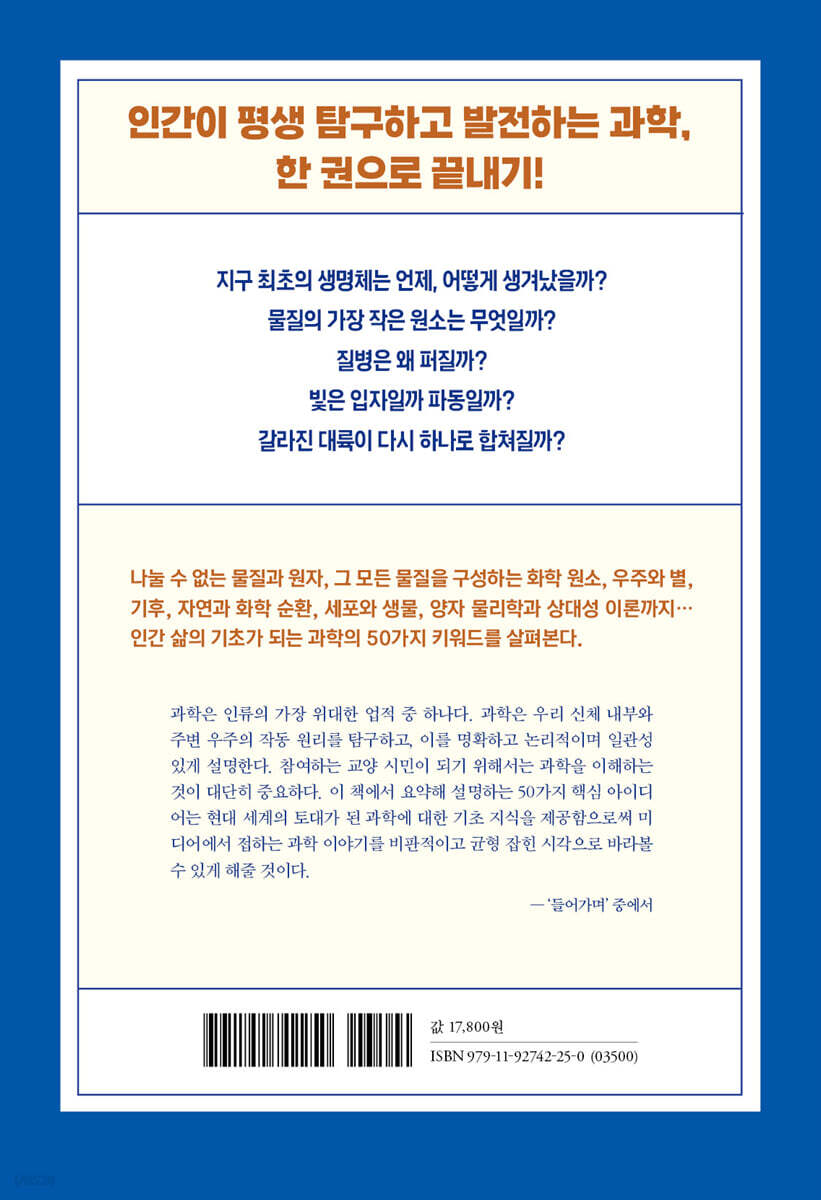 01 나눌 수 없는 물질 물질의 원자론 02 아무것도 존재하지 않는 허공 속으로 진공 상태의 존재 03 물려주기 유전 법칙 04 나눌 수 없는 물질 나누기 원자 구조 05 무통 수술의 시대를 열다 마취제 06 모든 물질을 구성하는 화학 원소 07 화학적 순서 부여하기 주기율표 08 우리를 지탱하는 힘 중력 09 생명의 단위 세포설 10 원자에서 나오는 에너지 방사능 11 영원한 반석 오래된 지구 12 천체를 형성하다 행성 강착 13 가장 작은 생명체 미생물 14 질병이 퍼지는 원인은 무엇일까? 세균설 15 대폭발로 시작하다 빅뱅 16 입자일까 파동일까? 빛을 조명하다 17 전파에서 감마선까지 전자기 스펙트럼 18 찬란하게 반짝이는 별빛 별의 작동 원리 19 우주 공간의 구멍? 블랙홀 20 화학물질은 돌고 돈다 생물 지구 화학적 순환 21 우주의 중심은 태양이다 태양 중심설 22 건강한 신체 균형 유지를 위한 관찰 신체 모형화 23 지구 생명의 기원 자연 발생론 24 합치거나 나눠서 에너지를 생산하다 핵융합과 핵분열 25 우주의 다크 포스 암흑 물질과 암흑 에너지 26 지표면에서 지구 핵까지 지구의 구조 27 충돌하는 판, 이동하는 대륙 지각 변동 28 열과 가스가 과하면 온실 효과 29 너무 뜨겁고 너무 빨라 기후 위기 30 원자들이 줄을 잇는다 자기 31 생명의 책 DNA 32 기본 입자와 입자의 상호작용 표준 모형 33 감염 예방 청결 유지 소독 34 소독보다 더 섬세하고 정확한 살균 항생제 35 물질은 영원히 그대로일까? 물질의 보존 36 모든 것이 질서정연하게 생물 분류 37 세포 내의 세포 세포내공생설 38 백신 접종 vs. 접종 거부 예방 접종 39 생명의 화학 작용을 돕는 손길 효소 40 암석이 층층이 쌓여 층서누중 41 에너지는 절대 고갈되지 않는다 에너지 보존 42 무질서하지 않은 혼돈 카오스 이론 43 유전자 적자생존 진화 44 진화, 이제 유전자와 함께 현대 진화론의 종합 이론 45 죽어 사라져 버리다 멸종 46 모두 상대적일 뿐 특수 및 일반 상대성 이론 47 작은 것보다 더 작은 양자 물리학 48 상자 속의 고양이 불확정성 원리 49 스스로 진화하는 가이아 살아 있는 지구 50 우주에서 우리는 과연 혼자일까? 외계 생명체 찾아보기 그림 출처 |