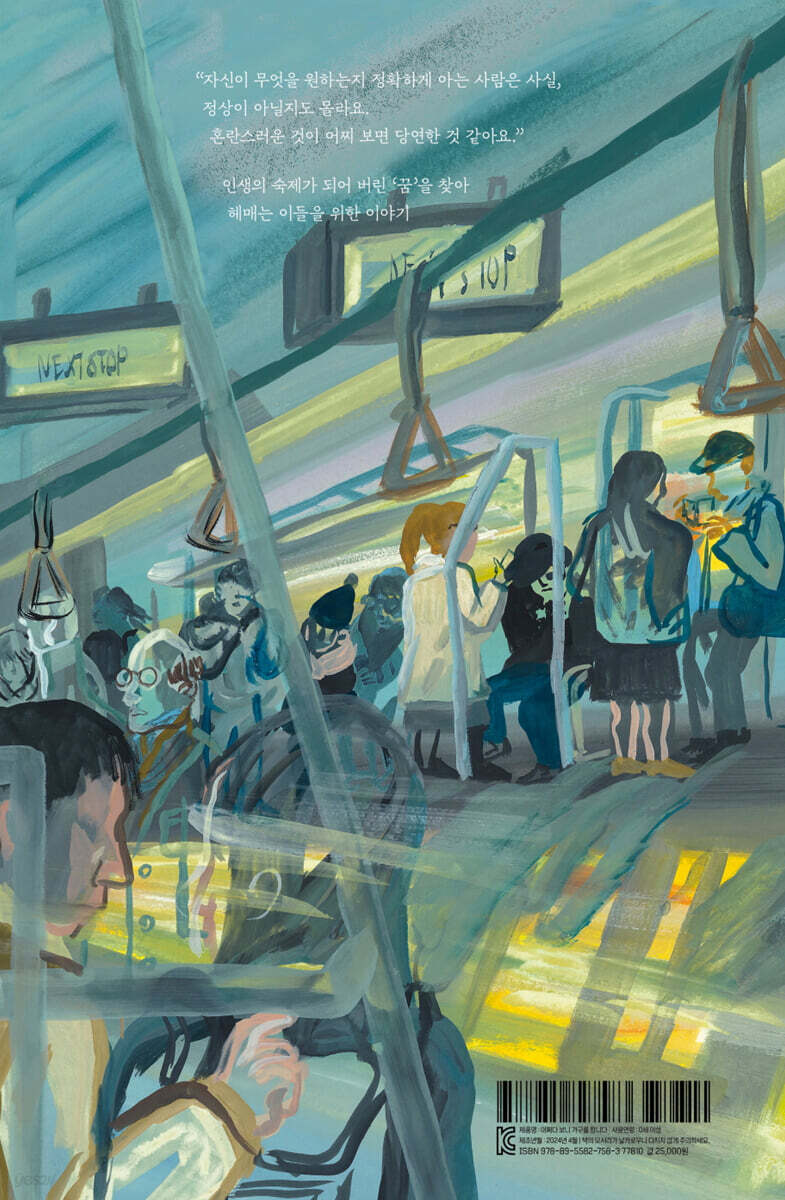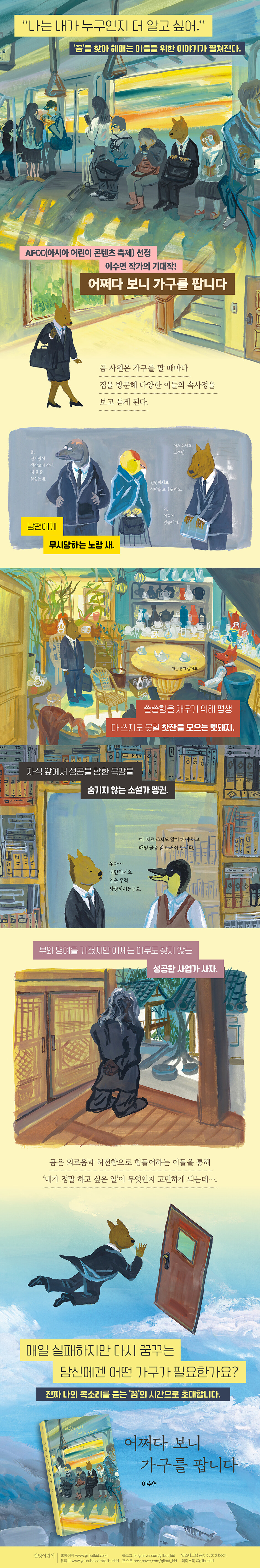 외로움과 허전함을 안고 살아가는 우리 모두의 자화상 가구를 파는 곰 사원은 오늘도 가구를 팔기 위해 무거운 발걸음으로 회사를 나선다. 윽박지르는 남편 때문에 원하는 식탁 하나도 마음대로 살 수 없는 새, 외로운 마음을 달래기 위해 쓰지도 않는 찻잔을 모으는 멧돼지, 성공에 목마른 소설가 펭귄, 나이가 들자 찾아오는 이가 없는 성공한 사업가 사자를 만나며 곰 사원은 그들이 필요로 하는 가구와 그 쓰임을 통해 고객에게 가구보다 더 필요한 것은 따로 있음을 짐작하게 되고, 더 나아가 실적 때문에 점점 변해가는 자신에게는 무엇이 필요한지 고민에 빠진다. 《어쩌다 보니 가구를 팝니다》는 남들에게 쉽게 내보일 수 없는 속사정을 안고 살아가는 사람의 다양한 삶과 꿈을 보여 준다. 무엇이든 참고 살았던 새가 남편 앞에서 원하는 식탁 하나도 사지 못하는 모습과, 하고 싶은 음악을 위해 잠을 포기하고 편의점에서 일하는 캥거루가 기타를 연주할 때 앉을 소파를 고르는 모습처럼 그 안에서도 방황하는 인물과 꿋꿋하게 선택을 이어가는 인물의 이야기가 대조되며, 곰 사원이 이들과 나눈 대화는 실적이 쌓일수록 가구를 파는 일에 자꾸만 회의감이 들던 곰 사원에게 중요한 실마리를 제공하게 된다. 허전함을 채우려면 가구가 아닌 나의 이야기를 들어 한 사람이 필요한 존재들의 이야기 《어쩌다 보니 가구를 팝니다》이다. “우리는 무엇을 붙잡고 싶어서 그렇게 잠도 미뤄 두는 걸까?” 진짜 나의 목소리를 듣는 '꿈'의 시간 실적 압박에 힘들어하던 곰 사원은 언제부터인가 꿈에 낡고 허름한 ‘집’이 등장한다. 꿈에서조차 이 집의 주인에게 어떤 가구를 팔면 좋을지를 고민하고, 고객이 부르면 잠을 미루면서까지 한밤중에 달려가 실적을 위해 최선을 다하지만 꿈속에서의 곰 사원은 여전히 집을 청소하고 가꾸며 수리하는 것을 멈추지 않는다. ‘이달의 우수 사원’으로 뽑힌 이후에도 곰 사원의 꿈에는 여전히 ‘집’이 등장하고, 이번엔 처음 보는 지하실 문을 발견한다. 열리지 않는 문 앞에서 극심한 답답함을 느끼며 꿈에선 깬 곰 사원은 마침내 방치된 그 집이 ‘나’였음을 깨닫는다. “나는 내가 누구인지 더 알고 싶다.” -208쪽 안정적이고 평범한 삶이 가장 자신이 바라던 삶이라고 생각한 곰 사원은 꿈속에서 집을 청소하고 페인트를 칠하며 열심히 일을 한 것처럼 가구 판매원으로서 최선을 다해 살았다. 하지만 고객에게 가구를 팔기 위해 원하지 않는 행동을 하고, 때론 자신이 무엇을 원하는지도 모르는 사람들을 만나면서 곰 사원은 가구를 판매하기 위해 거짓말을 하고 진심을 다하지 못하는 자기 모습에 점점 못마땅함을 느끼게 된다. 이야기 속의 꿈은 곰 사원이 자신의 진짜 목소리를 찾는 고요한 세계이며, 열리지 않는 지하실은 곰 사원이 정말로 의욕을 갖고 할 수 있는 일로 안내하는 문이다. 문 너머에는 꿈을 지킬 확신이 없던 어릴 때 포기한 작가라는 길이 있을 수도 있고, 자신의 이야기를 있는 그대로 들어주었던 친구처럼 그때의 다정함을 회복하는 시작이 펼쳐질 수도 있다. “자신이 무엇을 원하는지 정확하게 아는 사람은 사실, 정상이 아닐지도 몰라요. 혼란스러운 것이 어찌 보면 당연한 것 같아요.” -179쪽 긴 고민 끝에 남편을 설득해 식탁을 사기로 한 새가 말했던 것처럼 무엇을 원하는지 정확하게 아는 것은 어려운 일일지도 모른다. 하지만 세상에 무가치한 일이란 없듯이, 곰 사원이 최선을 다해 우수 사원이 되고서 일을 그만두었기에, 어릴 적에 꿈꾸었지만 그때는 확신이 없어서 포기했던 그 길을 이제야 걸어가 보겠다는 용기를 얻었을 것이다. 꿈과 현실을 넘나드는 밀도 높은 서사와 아름다운 그림으로 이수연 작가의 경험을 담은 자전적 이야기 《어쩌다 보니 가구를 팝니다》는 실적이 없는 곰 사원과 실적을 위해서라면 무엇이든 하는 오렌지 여우 사원, 곰 사원이 만나는 각양각색의 고객들과 회사에서 유일하게 곰의 변화를 알아보는 개 사원처럼 인물들의 역할뿐 아니라 관계도가 치밀하게 구성되어 이야기의 몰입을 한층 끌어올리며, 이를 탄탄하게 끌고 가는 완성도 높은 그림으로 또 한 번 독자들을 만족시킨다. 이야기 속 인물들은 ‘동물’의 외형을 갖고 있지만, 작가는 이를 통해 인물의 성격을 직관적으로 전달하는 장치로 활용하면서도 입체적으로 변하는 모습을 보여주며 오늘날의 인간 군상을 새롭게 표현하였다. 《어쩌다 보니 가구를 팝니다》는 이수연 작가의 자전적 이야기로, 진정한 행복을 위해 가구가 아닌 사랑을 나누는 이야기인 그림책 《어떤 가구가 필요하세요?》에서 못다 한 이야기를 담아 220페이지에 걸쳐 꿈과 행복을 찾아 방황하는 사람들의 현실적인 고민을 보다 사실적으로 세밀하게 풀어냈다. 작가는 꿈을 이루기 위해 불안한 오늘을 살아가는 이들의 어려움을 알아주고, 꼭 꿈이 없더라도 오늘을 힘껏 사는 것만으로도 충분하다고 이야기한다. 불완전한 선택을 두려워하지 말고 앞으로 나아가길 응원하는 《어쩌다 보니 가구를 팝니다》이다. |