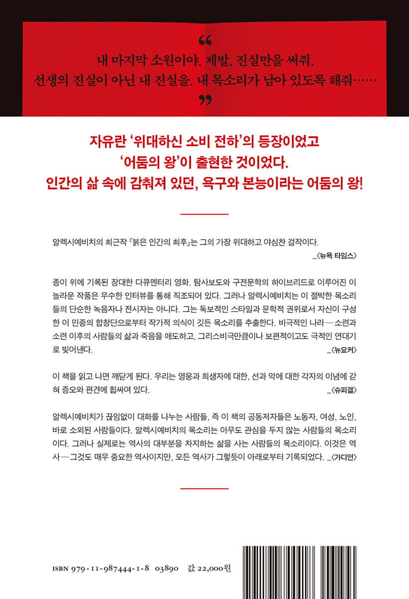 알렉시예비치의 최근작 『붉은 인간의 최후』는 그의 가장 위대하고 야심찬 걸작이다. - 뉴욕타임스