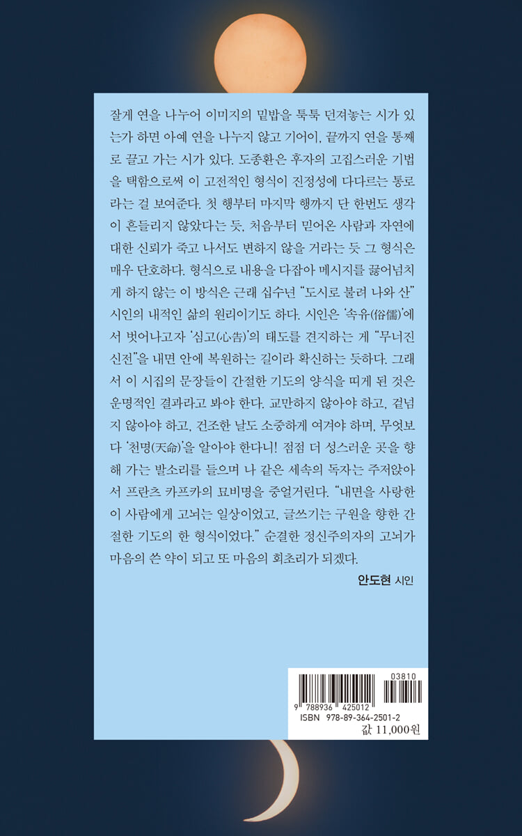 잘게 연을 나누어 이미지의 밑밥을 툭툭 던져놓는 시가 있는가 하면 아예 연을 나누지 않고 기어이, 끝까지 연을 통째로 끌고 가는 시가 있다. 도종환은 후자의 고집스러운 기법을 택함으로써 이 고전적인 형식이 진정성에 다다르는 통로라는 걸 보여준다. 첫 행부터 마지막 행까지 단 한번도 생각이 흔들리지 않았다는 듯, 처음부터 믿어온 사람과 자연에 대한 신뢰가 죽고 나서도 변하지 않을 거라는 듯 그 형식은 매우 단호하다. 형식으로 내용을 다잡아 메시지를 끓어넘치게 하지 않는 이 방식은 근래 십수년 “도시로 불려 나와 산” 시인의 내적인 삶의 원리이기도 하다. 시인은 ‘속유(俗儒)’에 서 벗어나고자 ‘심고(心告)’의 태도를 견지하는 게 “무너진 신전”을 내면 안에 복원하는 길이라 확신하는 듯하다. 그래서 이 시집의 문장들이 간절한 기도의 양식을 띠게 된 것은 운명적인 결과라고 봐야 한다. 교만하지 않아야 하고, 겉넘지 않아야 하고, 건조한 날도 소중하게 여겨야 하며, 무엇보다 ‘천명(天命)’을 알아야 한다니! 점점 더 성스러운 곳을 향해 가는 발소리를 들으며 나 같은 세속의 독자는 주저앉아서 프란츠 카프카의 묘비명을 중얼거린다. “내면을 사랑한 이 사람에게 고뇌는 일상이었고, 글쓰기는 구원을 향한 간절한 기도의 한 형식이었다.” 순결한 정신주의자의 고뇌가 마음의 쓴 약이 되고 또 마음의 회초리가 되겠다. - 안도현 (시인)
