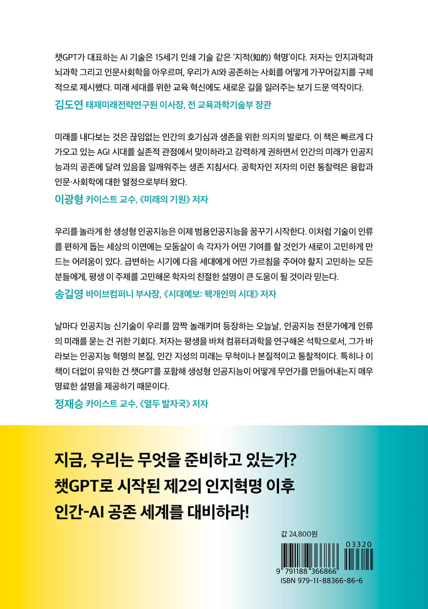 챗GPT가 대표하는 AI 기술은 15세기 인쇄 기술 같은 ‘지적(知的) 혁명’이다. 저자는 인지과학과 뇌과학 그리고 인문사회학을 아우르며, 우리가 AI와 공존하는 사회를 어떻게 가꾸어갈지를 구체적으로 제시했다. 미래 세대를 위한 교육 혁신에도 새로운 길을 일러주는 보기 드문 역작이다. - 김도연 (태재미래전략연구원 이사장, 전 교육과학기술부 장관)