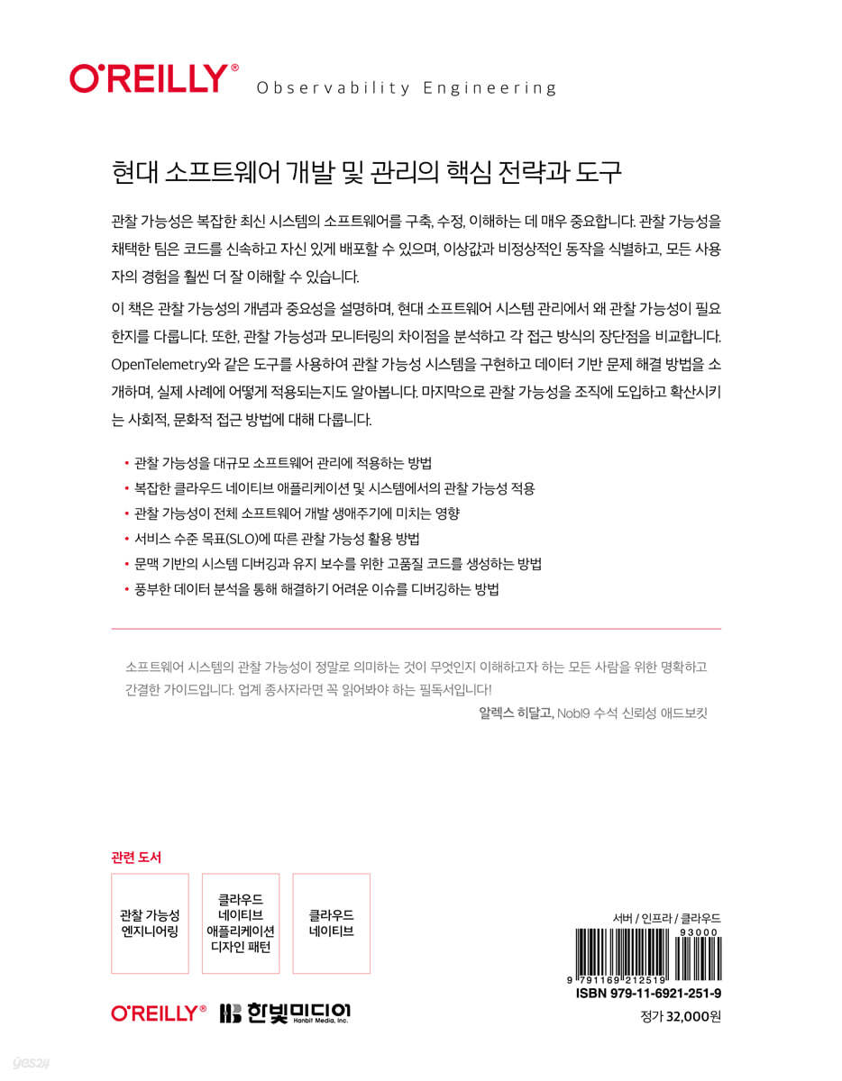 chapter 1 관찰 가능성이란? _1.1 관찰 가능성의 수학적 정의 _1.2 소프트웨어 시스템에 대한 관찰 가능성 적용 _1.3 소프트웨어를 위한 관찰 가능성에 대한 잘못된 특성화 _1.4 왜 지금 관찰 가능성인가? __1.4.1 이것이 정말 최선의 방법인가? __1.4.2 메트릭과 모니터링이 충분하지 않은 이유 _1.5 메트릭을 이용한 디버깅과 관찰 가능성을 이용한 디버깅 __1.5.1 카디널리티의 역할 __1.5.2 디멘셔널리티의 역할 _1.6 관찰 가능성을 이용한 디버깅 _1.7 현대적인 시스템을 위한 관찰 가능성 요약 chapter 2 관찰 가능성과 모니터링의 디버깅은 어떻게 다를까? _2.1 모니터링 데이터를 활용한 디버깅 __2.1.1 대시보드를 이용한 문제 해결 __2.1.2 직관을 통한 문제 해결의 한계 __2.1.3 사후 대응적일 수밖에 없는 기존 모니터링 _2.2 관찰 가능성을 통한 더 나은 디버깅 요약 chapter 3 관찰 가능성 없이 확장하며 배운 교훈 _3.1 메타가 인수한 MBaaS 기업 Parse _3.2 Parse에서 경험했던 확장성 _3.3 현대적 시스템으로의 진화 _3.4 현대적 관행으로의 진화 _3.5 Parse의 전환 사례 요약 chapter 4 관찰 가능성은 어떻게 데브옵스, Sre, 클라우드 네이티브를 연결하는가 _4.1 클라우드 네이티브, 데브옵스, SRE에 대한 간단한 소개 _4.2 관찰 가능성: 디버깅의 과거와 오늘 _4.3 관찰 가능성을 통한 데브옵스와 SRE 프랙티스의 강화 요약 PART 2 관찰 가능성 기초 chapter 5 정형화된 이벤트: 관찰 가능성의 기본 구성 요소 _5.1 정형화된 이벤트를 이용한 디버깅 _5.2 메트릭을 기본 구성 요소로 사용하기 어려운 이유 _5.3 기존 로그를 기본 구성 요소로 사용하기 어려운 이유 __5.3.1 비정형 로그 __5.3.2 정형화된 로그 _5.4 디버깅 시 유용한 이벤트 속성 요약 chapter 6 이벤트를 추적으로 연결하기 _6.1 분산 추적이란 무엇이고 왜 중요한가? _6.2 추적을 구성하는 컴포넌트 _6.3 어렵게 추적 계측하기 _6.4 추적 스팬에 사용자 정의 필드 추가하기 _6.5 이벤트를 추적으로 연결하기 요약 chapter 7 Opentelemetry를 이용한 계측 _7.1 계측이란? _7.2 오픈 계측 표준 _7.3 코드를 이용한 계측 __7.3.1 자동 계측 시작하기 __7.3.2 사용자 정의 계측 추가하기 __7.3.3 백엔드 시스템으로 계측 데이터 전송하기 요약 chapter 8 관찰 가능성 확보를 위한 이벤트 분석 _8.1 알려진 조건 기반의 디버깅 _8.2 디버깅의 제1원칙 __8.2.1 핵심 분석 루프 사용하기 __8.2.2 핵심 분석 루프의 무차별 대입 자동화 _8.3 AIOps의 약속에 대한 오해 요약 chapter 9 관찰 가능성과 모니터링의 공존 _9.1 모니터링이 적합한 사례 _9.2 관찰 가능성이 적합한 사례 _9.3 대상 시스템, 소프트웨어에 따른 고려 사항 _9.4 조직의 요구사항 평가 __9.4.1 예외 무시할 수 없는 인프라 모니터링 __9.4.2 실전 예시 요약 PART 3 팀을 위한 관찰 가능성 chapter 10 관찰 가능성 사례 적용하기 _10.1 커뮤니티 그룹 참여하기 _10.2 가장 큰 고민거리에서 시작하기 _10.3 구축보다 구매 _10.4 반복을 통한 계측 구체화 _10.5 기존의 노력을 최대한 활용하기 _10.6 관찰 가능성 적용의 최종 관문 요약 chapter 11 관찰 가능성 주도 개발 _11.1 테스트 주도 개발 _11.2 개발 생애주기 내에서의 관찰 가능성 _11.3 디버그 지점의 결정 _11.4 마이크로서비스 시대의 디버깅 _11.5 계측이 관찰 가능성 도입을 촉진하는 방법 _11.6 관찰 가능성의 조기 투입 _11.7 소프트웨어 배포 가속화를 위한 관찰 가능성 활용 요약 chapter 12 신뢰성을 위한 SLO의 활용 _12.1 전통적 모니터링 접근 방법이 낳은 알람에 대한 피로감 _12.2 알려진 무지만을 위한 임계치 기반의 알람 _12.3 중요한 것은 사용자 경험이다 _12.4 SLO란 무엇인가? __12.4.1 SLO 기반의 신뢰성 있는 알람 __12.4.2 사례 연구: SLO 기반의 알람 문화 변화 요약 chapter 13 SLO 기반 알람 대응과 디버깅 _13.1 오류 예산이 소진되기 전에 경고하기 _13.2 슬라이딩 윈도우를 이용한 시간 범위 설정 _13.3 오류 예산 소진 알람 생성을 위한 예측 __13.3.1 룩어헤드 윈도우 __13.3.2 베이스라인 윈도우 __13.3.3 SLO 소진 알람 대응하기 _13.4 관찰 가능성 데이터와 시계열 데이터를 이용한 SLO 측정의 차이 요약 chapter 14 관찰 가능성과 소프트웨어 공급망 _14.1 슬랙이 관찰 가능성을 도입한 이유 _14.2 계측: 공유 클라이언트 라이브러리와 디멘션 _14.3 사례 연구: 소프트웨어 공급망에 관찰 가능성 적용하기 __14.3.1 도구를 이용한 문맥의 이해 __14.3.2 실행 가능한 알람 내장하기 __14.3.3 변경사항 이해하기 요약 PART 4 규모에 맞는 관찰 가능성 시스템 구축 chapter 15 투자 회수 관점에서 본 구축과 구매 _15.1 관찰 가능성의 ROI 분석 방법 _15.2 자체 구축 비용 __15.2.1 무료 소프트웨어 사용의 숨겨진 비용 __15.2.2 자체 구축의 장점 __15.2.3 자체 구축의 위험성 _15.3 상용 소프트웨어 실제 도입 비용 __15.3.1 상용 소프트웨어 도입의 숨겨진 재무적 비용 __15.3.2 상용 소프트웨어 도입의 숨겨진 비재무적 비용 __15.3.3 상용 소프트웨어 도입의 이점 __15.3.4 상용 소프트웨어 구매의 위험성 _15.4 자체 구축과 상용 소프트웨어 도입은 옳고 그름의 문제가 아니다 요약 chapter 16 효율적인 데이터 스토리지 _16.1 관찰 가능성을 위한 기능적 요구사항 __16.1.1 관찰 가능성에 부적합한 시계열 데이터베이스 __16.1.2 다른 데이터 저장소 후보들 __16.1.3 데