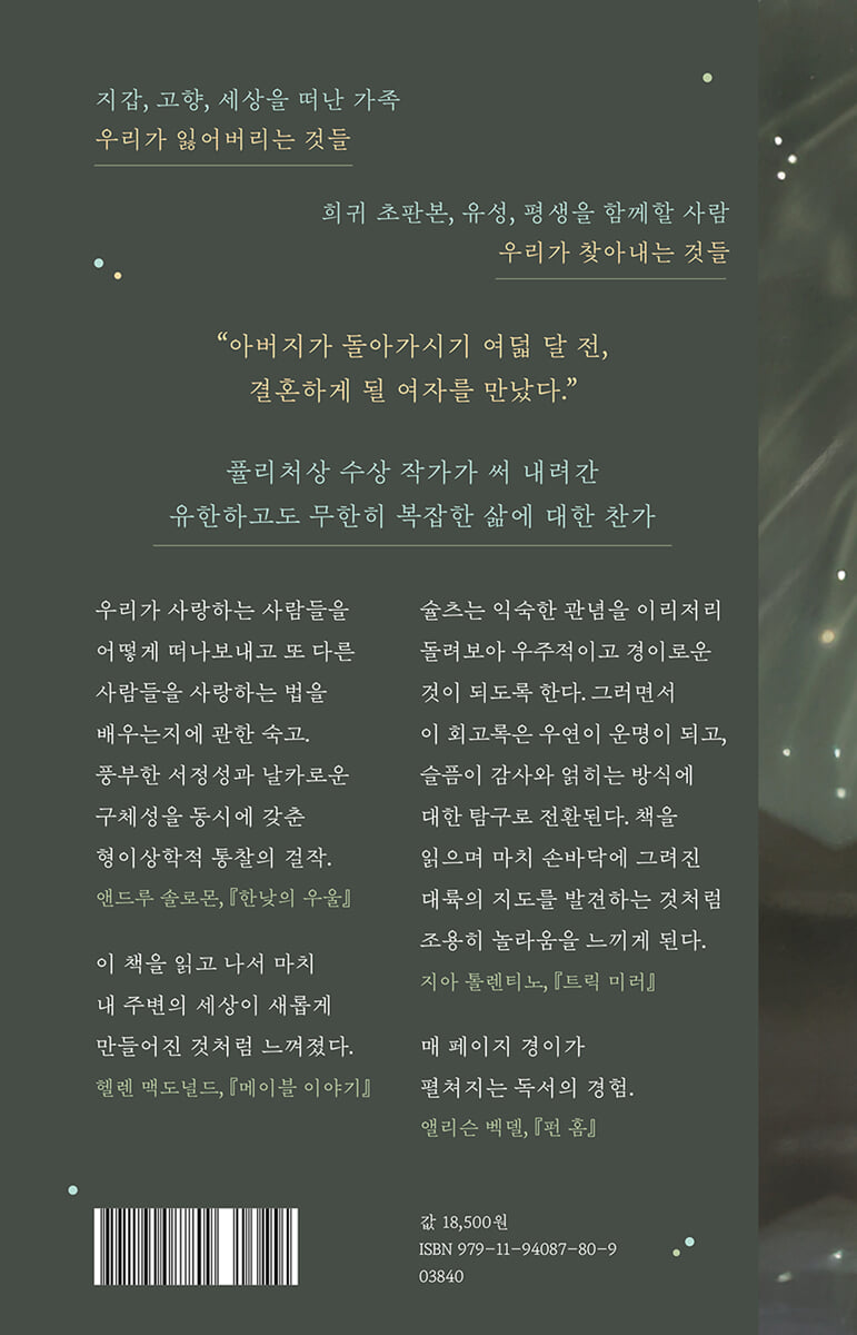 사랑과 상실, 그리고 인간으로 살아간다는 것의 의미에 관한 부드럽고 깊이 있는 명상. 이 책을 읽고 나서 마치 내 주변의 세상이 새롭게 만들어진 것처럼 느껴졌다. - 헬렌 맥도널드 (『메이블 이야기』저자)