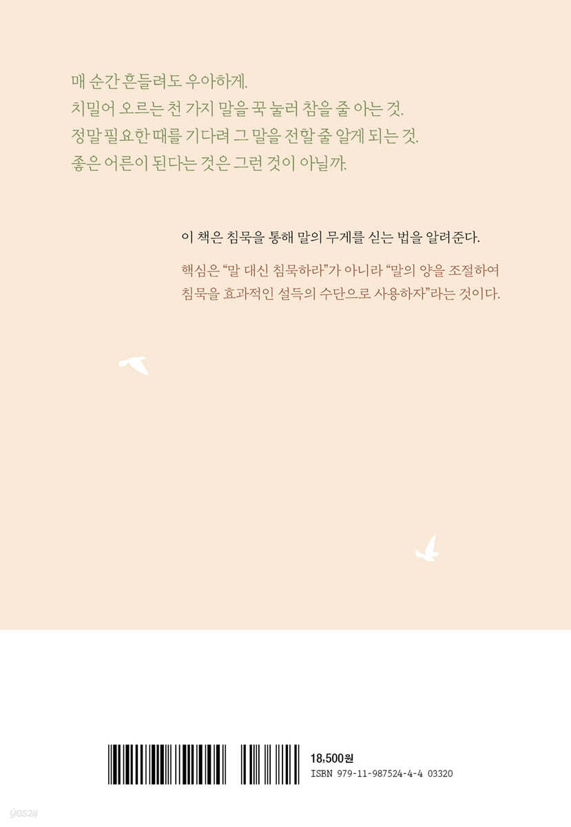 --- p.26 고대 로마인들의 법 원칙에 ‘침묵하는 이는 동의하는 것Qui tacet consentit’이 있다. 현대 법에서는 이것을 ‘암묵적 동의’라고 부른다. 어떤 제안에 반박이 없을 경우 동의했다고 해석하는 것이다. (...) 한 여성이 “너무 좋은 대화였다”라며 상대 남성을 침이 마르도록 칭찬했다. 그런데 팀장이 알기로는 그 상대 남성은 평소 소통 능력이 그리 뛰어나지 않았던 사람이었다. 그래서 궁금증에 녹화 영상을 돌려보았더니 그 남성은 거의 아무 말도 하지 않았다. 그의 입에서 나온 말은 주로 “흠”, “네”, 당연하죠”, “정말요?”, “세상에”처럼 동의를 표하는 추임새가 대부분이었다. --- pp.44-45 법정에 서는 모든 피고인에게는 묵비권이 있다. 자신에게 불리할 것 같은 증언은 하지 않아도 되는 권리다. 이 또한 침묵이다. 법정에서조차 사용될 정도로 침묵은 유익한 것이다. --- p.57 베스트 프렌드는 어떤 사람인가? 멋진 조언을 해주는 친구? 그렇게 대답하는 사람은 거의 없다. 대부분은 이렇게 대답한다. “내 말을 잘 들어주는 친구요.” 우리는 떠들어대는 사람이 아니라 내 말에 귀를 기울여주는 사람을 원한다. --- p.59 정적의 효과는 상상 이상이다. 경기에 출전하기 전 운동선수들을 생각해보라. 경기 시작 직전에 조잘거리는 선수는 없다. 다들 입 다물고 정신을 가다듬는다. 정적 속에 힘이 있기 때문이다. --- p.71 우리가 점점 침묵을 지키기 어려운 이유 중 하나가 바로 ‘사람들의 관심을 끌고 싶기 때문’이다. 말 그대로 ‘관종’이 넘쳐나는 세상이다. 어떻게든 엄마의 관심을 끌려는 어린아이처럼 사람들의 관심을 끌고 싶어 끊임없이 말하고, 메시지를 보내고, SNS에 사진과 글을 올린다. --- p.72 우리는 지속적으로 자신을 과도하게 몰아붙인다. 우리의 휴식은 휴식이 아니다. 우리는 가만히 멈추지를 못하고, 자신에게 고요와 침묵을 허락하지 않는다. 대부분의 사람은 평생 이 사실을 깨닫지도 못한다. 심장 발작이 세 번이나 찾아와도 말이다. --- p.242 지혜로운 노인들이 과묵한 것도 다 그런 이유다. 지혜와 힘은 소란함이 아니라 고요에서 온다. 그러나 과묵한 지혜가 꼭 나이 때문에 생겨나는 것은 아니다. 나이와 관계없이 남들이 떠들 때 입을 다물 줄 아는 사람은 지혜를 얻을 수 있다. --- p.258 |