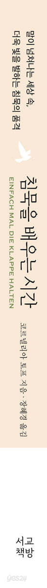 우리는 말의 홍수 속에 살고 있다 1장. 말 비우기 연습 말은 할수록 힘이 떨어진다 일단 뱉고 나서 후회하는 사람들 대화에서 침묵이 효과적인 이유 존중함을 잃어버린 사회 [침묵수업 1] 말과 침묵의 균형 유지하기 2장. 침묵도 소통의 방식이다 공든 탑을 무너뜨리는 말 잔잔한 물이 더 깊다 듣는 자만이 기회를 잡는다 “좋은 의견 고마워.” 그걸로 끝! 흔히, 지나고 후회한다 피고인에게 묵비권이 있는 이유 [침묵수업 2] 강력한 한마디 준비하기 3장. 우리는 모두 ‘관종’이다 말하는 자가 통제한다는 착각을 버려라 경기 시작 직전에 조잘거리는 선수는 없다 말을 하면, 들을 수 없다 “자랑질을 멈출 수가 없어요” 지위가 높을수록 말이 많아지는 이유 누구에게나 약점은 있다 하나 마나 한 소리는 이제 그만! [침묵수업 3] 말하기 전 5초 생각하기 4장. 비울수록 커지는 말의 무게 왜 한 시간도 스마트폰을 끄지 못할까? 자기 자신과 대화하는 법 자신과의 관계가 원만해야 타인과의 관계도 만족스럽다 마음속 목소리를 먼저 들어라 운동으로 마음의 평온을 얻는 방법 [침묵수업 4] 모든 소음 끊어보기 5장. “말을 해야 해”라는 강박에서 벗어나라 당신도 싫지 않아, 이 어색한 침묵이? 다른 사람을 즐겁게 해줘야 한다는 의무감을 버려라 타인은 당신에게 큰 관심이 없다 좋은 대화를 시작하는 법 [침묵수업 5] 난감한 침묵 적극적으로 맞이하기 6장. 대화를 유리하게 이끄는 법 즉답은 절대 금물! 도발적인 질문에는 이렇게 대처하라 참을 수 없는 모욕에 대처하는 법 침묵은 협상 상대를 불안하게 만든다 화난 사람을 상대하는 최고의 대응책 상대의 욕망을 읽는 법 침묵으로 코칭하라 최고의 대화는 스톱-고(stop-go) 원칙을 따른다 [침묵수업 6 ] 침묵으로 설득하기 7장. 상대의 마음을 움직이는 법 ‘잠깐 멈춤’은 말에 무게를 실어준다 말을 멈출 타이밍은 언제인가? 상대에게 호감을 주는 표정과 제스처 자기 과시형 리더에게는 사람이 모이지 않는다 갈등 상황에 더욱 빛을 발하는 침묵의 기술 [침묵수업 7] 말을 멈추고 상대에게 생각할 시간 주기 8장. 말이 넘쳐나는 세상 속 침묵할 권리 상사의 소음에 대처하는 법 “내가 참고 말지”란 자세를 버려라 수다쟁이의 입을 빨리 다물게 하는 법 메타커뮤니케이션: 직접적으로 질문하라 공격적인 침묵도 가능하다 질문을 던지는 쪽이 주도권을 갖는다 [침묵수업 8] 소음에 참지 않고 제대로 저항하기 9장. 고요한 관조의 힘 지속적으로 자신을 과도하게 몰아붙이는 사람들 시끄러운 가운데 고요하게 지혜의 힘은 소란함이 아니라 고요에서 온다 직관의 목소리에 귀를 기울여라 가끔은 말보다 글쓰기가 낫다 [침묵수업 9] 말을 하는 대신 적어보기 마치며 행복은 고요한 순간에 찾아온다 |
