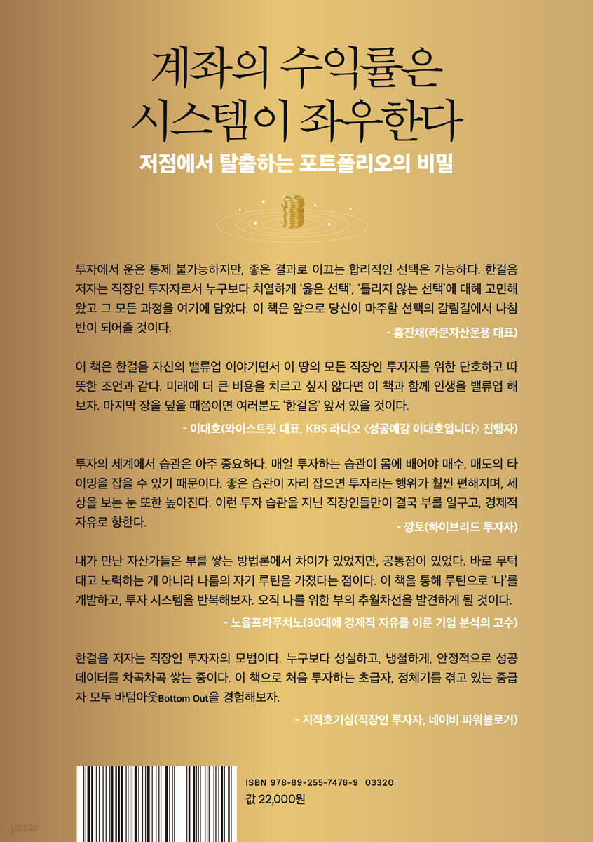한걸음 저자와 식사를 한 날이었다. 함께 점심을 먹고 와이스트릿 사무실에서 차담을 나눈 뒤 헤어졌다. 그리고 1시간도 되지 않아 그의 블로그 글이 올라왔다. 우리 만남과 관련된 글이었다. 한걸음은 ‘실행하는 사람’이다. 직장 생활뿐 아니라 투자 공부, 블로그 운영, 책 집필까지 ‘그냥’ 실행한다. 평범한 직장인, 아빠, 생활인인 그를 특별하게 만드는 것은 다름 아닌 ‘실행력’이다. 이제 ‘블로거 한걸음’은 웬만한 투자 커뮤니티에서 알아주는 이름이 되었다. 이 책은 한걸음 자신의 밸류업 이야기이기도 하지만, 이 땅의 모든 직장인 투자자를 위한 단호하고 따뜻한 조언과 같다. 제임스 클리어는 이런 말을 했다. “좋은 습관의 비용은 현재에 치르고, 나쁜 습관의 비용은 미래에 치른다.” 미래에 더 큰 비용을 치르고 싶지 않다면 이 책과 함께 인생을 밸류업 해보자. 마지막 장을 덮을 때쯤이면 여러분도 ‘한걸음’ 앞서 있을 것이다. - 이대호 (와이스트릿 대표, KBS 라디오 〈성공예감 이대호입니다〉 진행자)
