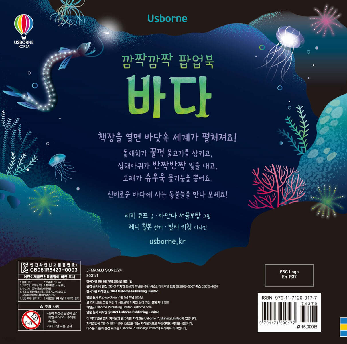 ○ 천천히 책장을 넘겨 주세요. 책장을 넘길 때마다 알록달록 바닷속 풍경과 동물들의 모습이 입체적으로 살아나요. 입체적인 모습이 아기의 시선을 사로잡아 책 읽기에 집중력과 흥미를 돋아 주지요. ○ 간결하고 경쾌한 문장과 의성어, 의태어가 아기의 언어 감각과 어휘력을 키워 줘요. 생생한 느낌이 들도록 읽어 주면 책 읽기에 더 큰 즐거움을 느낄 수 있어요. ○ 다양한 바다 생물의 특징과 바닷속 풍경이 생생한 그림 속에 잘 표현되었어요. 바닷속 동식물의 생태에 대해 이야기를 나누며 아기의 표현력을 키울 수 있답니다. |