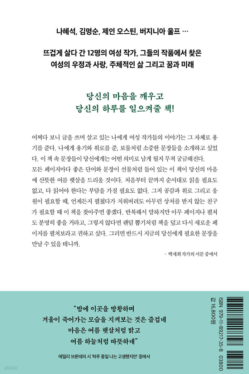 --- p.5 「서문 ‘나에게 용기와 위로를 준 보물처럼 소중한 문장들」중에서 크리스티는 충동적으로 주변 친구들에게 손을 내밀었고, 그들 모두가 한마음으로 그녀의 손 위에 손을 얹었다. 그들은 나이와 인종, 가진 돈과는 상관없이 행복한 결말의 도래를 서두르기 위해 자신의 역할을 할 준비가 된 사랑스러운 여성들이었다. --- p.11 「『일: 경험의 이야기』 루이자 메이 올컷」중에서 그녀는 손바닥으로 느껴지는 마르고 거친 풀의 촉감을 사랑했고 얼굴을 파묻은 백리향의 냄새, 바람이 머리카락과 블라우스를 스치는 감촉, 바람에 흔들리며 삐걱거리는 낙엽송의 소리를 좋아했다. 그녀는 종종 언덕에 올라 바람을 느끼고 풀에 뺨을 문지르는 단순한 즐거움을 누리기 위해 홀로 누워 있었다. 그럴 때면 그녀는 보통 아무 생각도 하지 않았고 그저 말로 표현할 수 없는 행복에 잠겨 있었다. --- p.51 「『여름』 이디스 워튼」중에서 아아, 다행이다. 경희의 넓적다리에는 살이 쪘고 팔뚝은 굵다. 경희는 이 살이 다 빠져서 걸을 수가 없을 때까지 팔뚝의 힘이 없어 늘어질 때까지 할 일이 무한이다. 경희가 가질 물건도 무수하다. 그러므로 낮잠을 한 번 자고 나면 그 시간 자리가 완연히 티가 난다. 종일 일을 하고 나면 경희는 반드시 조금씩 자라난다. 경희가 갖는 것은 하나씩 늘어간다. 경희는 이렇게 아침부터 저녁까지 얻기 위하여 자라갈 욕심으로 제 힘껏 일을 한다. --- pp.77~78 「『경희』 나혜석」중에서 조는 주변의 좋은 분위기에 매우 행복했다. 빵을 사기 위해 열심히 일하며 노력한 덕분에 그 빵이 더 달게 느껴졌고, 일을 하면서도 틈틈이 글을 쓸 시간을 냈다. 지금 그녀를 사로잡은 목적은 가난하고 야망 있는 소녀에게 자연스러운 것이었지만, 그 목적을 달성하기 위해 택한 수단은 최선이 아니었다. 그녀는 돈이 권력을 부여한다는 것을 깨달았고 그래서 돈과 권력을 가지기로 결심했다. 그것을 자신만을 위해서가 아니라, 자신보다 더 사랑하는 사람들을 위해 사용하려는 것이었다. --- p.121 「『작은 아씨들』 루이자 메이 올컷」중에서 |