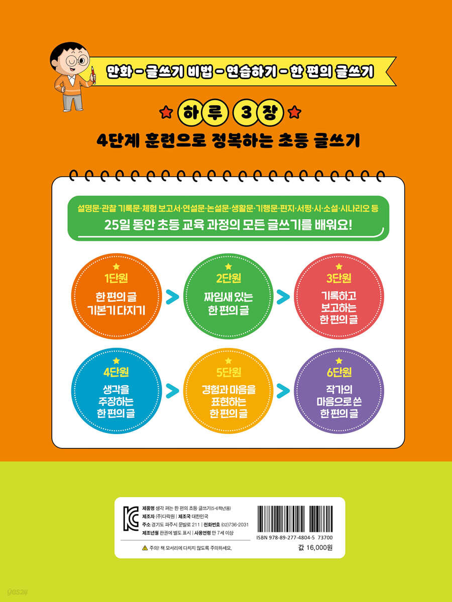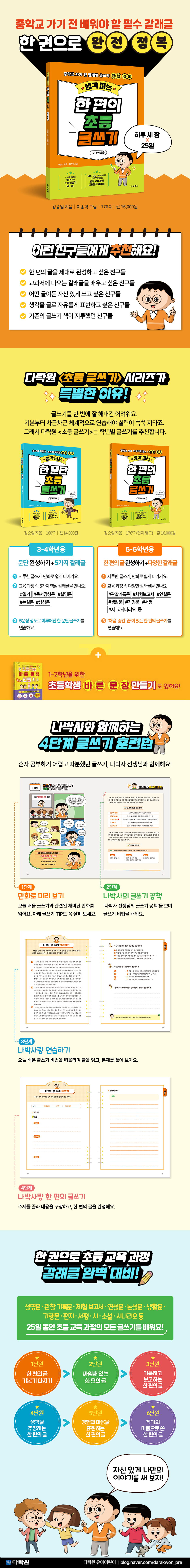 초등 교육 과정 속 갈래글을 한 번에! 《생각 펴는 한 편의 초등 글쓰기(5-6학년용)》에는 설명문, 보고서, 논설문, 토론 입론서, 기행문, 서평, 시, 소설, 시나리오 등 20여 가지의 글쓰기 방법이 나와 있어요. 그 덕분에 학교에서 배우는 거의 모든 종류의 글쓰기 방법을 배울 수 있답니다. ‘만화-나박사의 글쓰기 공책-나박사랑 연습하기-나박사랑 한 편의 글쓰기’ 4단계 글쓰기 훈련법을 반복하다 보면, 다양한 글을 연습하며 고학년 글쓰기를 마스터하고, 중학교에서의 새로운 시작을 잘 준비할 수 있을 거예요. 우리 모두 글쓰기를 완벽하게 정복해 보아요! 만화로 배우고 직접 써 보는 초등 글쓰기 워크북! 글쓰기라면 시작부터 두려운 친구들이 있나요? 그럼《생각 펴는 한 편의 초등 글쓰기(5-6학년용)》과 함께해요. 다양한 갈래별 글쓰기를 어렵지 않게 연습할 수 있도록 만들었거든요. ‘한 편의 글쓰기 수업’을 통해 나박사 선생님과 재미난 만화를 보고, 긴 글을 완성하는 법과 여러 갈래글을 쓰는 비법을 익히다 보면 앞으로 있을 논술형 글쓰기가 어렵게 느껴지지 않을 거예요. 25일 후, 글이 술술 써지는 기적을 경험해 보세요! |