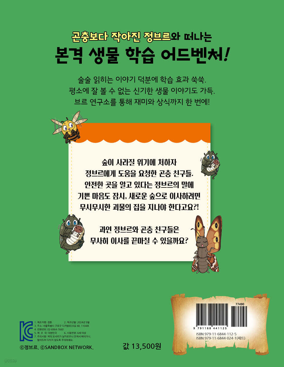 곤충보다 작아진 정브르와 떠나는 본격 생물 학습 어드벤처! 귀여운 생물 친구들과 말이 통한다고?! 생물 친구들과 대화를 할 수 있다면 어떨까 상상해 본 적 있나요? 바로 〈곤충보다 작아진 정브르〉 속에서는 인기 유튜버 정브르가 직접 생물들과 같은 눈높이에서 고민 상담도 해 주고, 부탁도 들어줘요! ‘이럴 때 이 생물은 어떤 상태일까?’ 하고 한 번쯤 궁금했을 법한 상황을 생물들이 직접 설명하는 방식으로 구성해 이야기 집중력을 높였어요. 또한 곤충학자 파브르의 이름을 따서 지은 정브르란 이름에 걸맞게 ‘브르 관찰기’가 이야기 속에 자연스럽게 들어 있답니다. 책을 읽으면 저절로 관찰 정보를 습득할 수 있어 관찰력도 쭉쭉 올라갈 거예요. 또한 ‘브르 연구소’라는 활동 페이지를 함께 구성해, 한 권 안에서 다양하게 즐길 수 있답니다. 퀴즈나 그림 그리기 등이 알차게 들어 있어 어린이들이 직접 풀고, 그리고, 읽으면서 사고력과 창의력 향상에 도움을 줄 수 있도록 준비했어요. 모든 생물에 진심인 유튜버 ‘정브르’가 책 속으로! 신비한 힘에 의해 몸은 작아졌지만 대신 생물들과 소통할 수 있는 능력을 얻은 정브르! 〈곤충보다 작아진 정브르 7〉에서는 작아진 정브르와 테일, 고나가 곤충 친구들의 이사를 돕기 위해 똘똘 뭉쳤어요. 그런데 이곳은 안락한 곤충하모니가 아닌 숲속이라는 사실! 화려한 빛으로 유혹하는 괴물과 소리 없이 쫓아오는 포식자의 등장까지! 과연 정브르는 야생에서의 위험천만한 순간을 이겨 내고, 무사히 곤충 친구들의 이사를 도울 수 있을까요? 호기심을 유발하는 스토리가 아이들에게 행복한 독서 시간을 만들어 줄 거예요. 술술 읽히는 이야기 속에서 어린이들이 생물 친구들에게 감정 이입하며 책을 즐길 수도 있고, 번뜩이는 시선으로 다양한 생물 친구들을 관찰할 수도 있지요. 생물 친구들의 귀엽지만 진지한 부탁을 유심히 보고 있으면, 어느새 함께 울고 웃는 아이들을 발견할 수 있을 거예요. 정브르와 다양한 생물 친구들의 웃음과 감동을 함께 느껴요! 생물 탐구 포인트, ‘브르 관찰기’ 〈곤충보다 작아진 정브르〉는 다양한 생물 친구들을 소개하고 재밌게 설명하는 생물 학습 만화예요. 책 속에서 새로운 생물 친구가 나타나면 생물 관찰 일지인 ‘브르 관찰기’가 항상 등장하지요. 한눈에 살펴보기 쉽게 구성되어 읽기도 편하고, 심화 학습에도 유용하답니다. 책 중간중간 등장하는 채집통 모양의 ‘팁’ 상자는 어려운 단어를 쉽게 설명해 주거나, 놓치기 쉬운 상식 또는 여담을 짧게 소개해요. 어린이들이 깨알 꿀팁까지 놓치지 않고 몽땅 채집해 갈 수 있게 말이에요! ‘브르 연구소’에서 놀이도 하고, 연구도 하고! 브르 연구소는 책을 읽었다면 누구나 참여할 수 있는 재밌는 활동들로 구성했어요. 생물 스케치북에서는 생물을 직접 그리고 색칠하면서 자연스럽게 학습 내용을 자기 것으로 만들 수 있어요. 등장 생물들을 활용한 ‘그림자 퀴즈’를 통해 사고력을 기를 수도 있답니다. ‘만약에 일기’에서는 평소에 생각해 본 적 없는 만일의 상황을 제시해 어린이들이 마음껏 상상할 수 있도록 했어요. 시야도 넓히고 상상력도 풍부해질 수 있을 거예요. 이 외에도 흥미로운 상식 이야기와 놀이가 브르 연구소에 가득하답니다. 〈곤충보다 작아진 정브르 7〉을 하나부터 열까지 모~두 즐겨 보세요! |