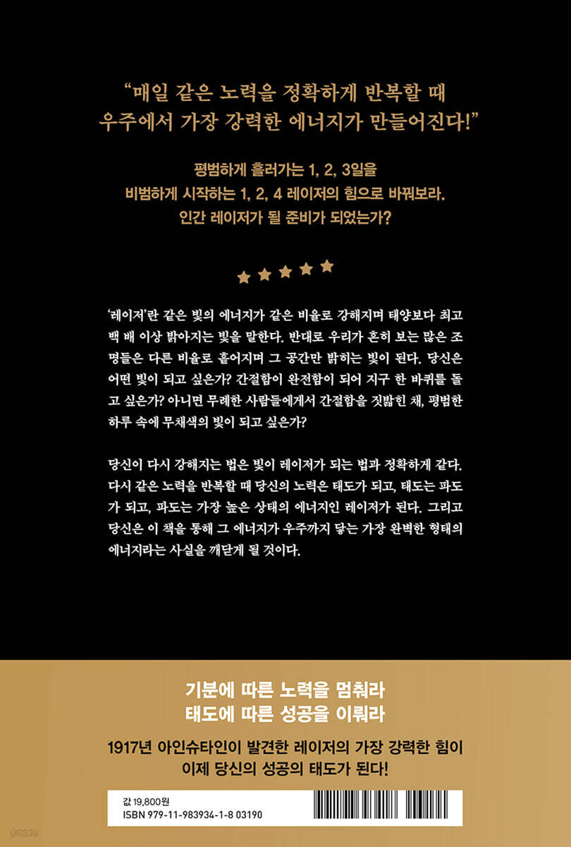 하버드 상위 1퍼센트가 전하는 가장 간단한 성공 법칙! “같은 노력의 반복의 힘!” 시리즈 누적 50만 부, 20여 년간 집필한 책의 시리즈 완결판 『더 레이저』. 사회 낙제생으로 불렸던 100킬로그램 소년이 매일 검은콩 100그램으로 50킬로그램 감량에 성공하며 환골탈태한 이야기 『살잡이 까망콩』은 20만 독자가 사랑한 이야기가 되었고, 중국·일본·대만·태국에서 더 많은 독자들이 인생의 놀라운 변화를 경험한 이야기가 되었다. 그 뒤로 저자는 10여 년간 더 큰 다이어트에 나섰다. 바로 사회 낙제생이라 불렸던 1킬로그램에 가득 든 두뇌 속 부정적인 신호들이었다.?저자와 변화를 함께 찾아가던 독자들은 『하버드 상위 1퍼센트의 비밀』을 통해 이번에는 1킬로그램의 두뇌에 가득 든 부정적인 신호를 벗겨냈다. 그렇다면 이제 무엇을 채울 수 있을까? 저자는 새로운 성공의 신호를 찾기 위해 레이더를 켰고, 하버드 상위 1퍼센트의 사람에게서 작은 레이저 포인터 하나를 받았다. 100그램의 작은 레이저 포인터 안에는 저자가 평생을 간절히 찾았던 성공의 비밀이 모두 담겨 있었다. 『더 레이저』는 빛이 강해지는 원리 그대로 인간의 모든 동기와 열정, 그릿들이 강해지는 법칙을 과학적으로 밝혀냈다. 만약 당신이 ‘1만 시간의 법칙’을 이루려고 노력할 때, 이 성공 법칙을 모른다면 100시간도 다다르지 못하고 번번이 포기할 것이다. 과학자들이 말하는 1만 시간의 법칙은 하루에 3시간씩 동일한 양으로 누적해서 쌓는 ‘1만 시간’이기 때문이다. 그러나 평범한 사람들은 처음에는 의욕에 가득 차서 3시간을 훌쩍 뛰어넘는 5시간, 6시간, 7시간까지 하루 치 노력의 양을 늘리다가 포기해버리고 만다. 레이저는 절대 그렇게 만들어지지 않는다. 레이저는 3시간씩 동일한 양의 노력을 매일 쌓는 것을 요구한다. 이 법칙을 발견한 사람은 누구일까? 정답은 아인슈타인이다.?아인슈타인은 레이저의 핵심을 만들었다. 이 책은 아인슈타인이 발견하고 하버드 상위 1퍼센트들 사이에서 비밀스럽게 전해지던 레이저의 법칙을 토대로 가장 간단하면서도 단단한 성공의 법칙을 알려준다. 매일 같은 노력의 반복은 당신이 성공을 이루는 가장 빠른 지름길이다. 빛이 강해지는 법을 알게 되면 성공은 빛의 속도로 이루어진다. 당신이 곧 빛이기 때문이다. 이제 빛나는 변화를 받아들일 준비가 되었는가? |