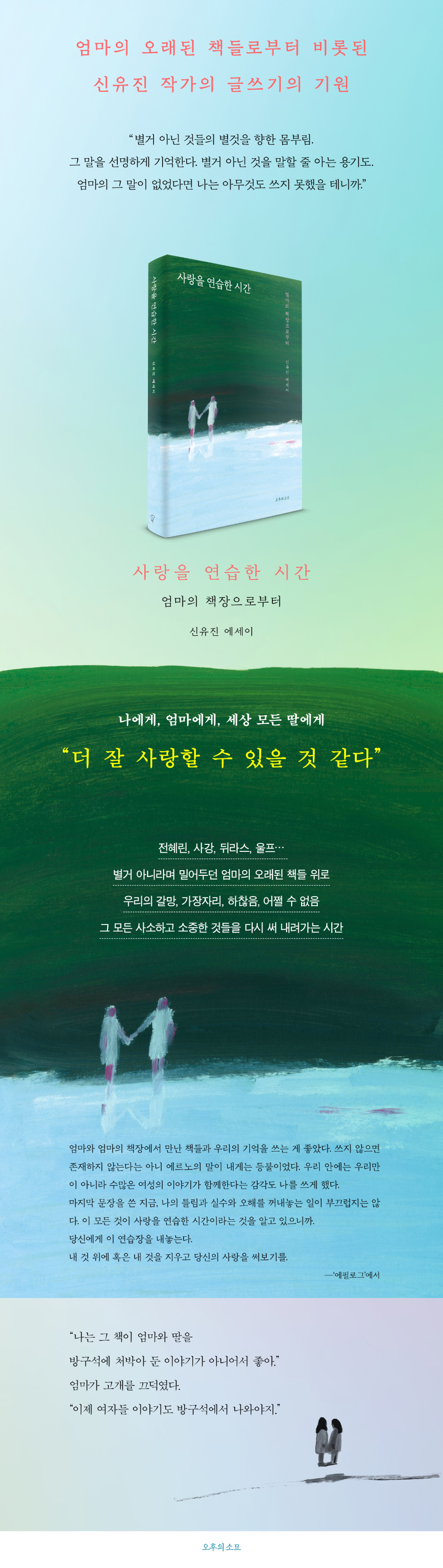 엄마, 여자, 한계, 사랑, 장소, 나…” 전혜린, 사랑, 뒤라스, 울프… 엄마의 오래된 책들 위로 한 여자를 다시 쓰는 시도 나의 첫 번째 이방인, 엄마. 그는 한겨울 서늘한 방에서 작은 스탠드의 노란 불빛 아래 읽고 썼던 사람, 문이 달린 책장을 좋아했던 사람, 문을 닫고 자신만의 모험으로 떠날 줄 알았던 사람이다. 그리고 ‘나’는, 감탄과 깨달음의 ‘아!’가 아니라 갈망과 비명의 ‘악!’ 소리를 내며 읽던 엄마의 책들 속에서 엄마의 언어를 배우며 내 것으로 옮겨보고 싶었던 사람. 그리하여 나는 엄마의 오래된 책들을, 무엇보다 엄마를, 엄마의 삶을 받아쓴다. 엄마의 책들 속 전혜린처럼 갈망의 언어로, 울프처럼 진실을 캐내는 언어로, 사강처럼 가벼운 슬픔의 언어로, 뒤라스처럼 침묵을 듣는 언어로. 번역가가 되어 절실히 옮기듯이. 또 나의 새로운 책들 속 에르노처럼 내 계급을 향한 언어로, 솔닛처럼 날실과 씨실의 언어로, 그리고 고닉처럼 길 위의 언어로, 오늘의 엄마와 나를, 여성이라는 텍스트를 통과한다. 한계와 갈망을, 금기와 자유를, 불안과 불행을, 희생과 죄책감을, 그침 없이 가쁘게, 다시 쓰고 고쳐 쓴다. 오래전 아니 에르노는 어머니를 한 여성으로 돌려놓는 시도로 《한 여자》를 썼고, 신유진 작가는 거기에서 실패를 읽어내고는 딸인 우리가 어머니에게서 어머니를 떼어내는 일이 가능한지 물었다. 그럼에도, 그토록 명확한 한계를 품은 채로 써나가는 용기를 보여준다. 복원사가 되어 엄마, 그리고 여성으로서의 삶을, 그 두 번째 시간을 살아낸다. 금기와 불행과 희생으로 축소하지 않고 온전한 한 존재의 삶으로. 실패할 시도가 될지언정 “엄마로서 고정된 삶이 아닌, 엄마로서 변화하는 삶, 생명력 넘치는 그 삶을” 내 앞에 있는 엄마에게, 나에게, 세상 모든 딸에게 전하기 위해. “끈끈한 혈육 관계의 이야기가 아닌, 살면서 놓친 연기 같은 것들을 바라보는 두 여자의 이야기, 그런 모녀 서사를 쓰고 싶었다. 덜 끈끈하고, 덜 달라붙어 있고, 덜 애잔한 글.” _「우리가 같이 걸을 때」 “내가 엄마 안에서 폭발할 것 같은 여성의 에너지를 발견한다면, 그것을 옮길 수 있다면, 금기와 불행과 희생을 뛰어넘은 그다음 이야기를 쓸 수 있지 않을까. 자궁이 축복의 전부이거나 불행의 전부이지 않은 이야기, 모성과 감성, 이성과 야성을 두루 가진 존재의 이야기.” _「나와 엄마와 마릴린 먼로 2」 신유진 작가의 글쓰기의 기원과 지평 우리의 갈망, 가장자리, 어쩔 수 없음, 그 모든 사소하고 소중한 것들을 사랑하기 위해 “별거 아닌 것들의 별것을 향한 몸부림. 그 말을 선명하게 기억한다. 별거 아닌 것을 말할 줄 아는 용기도. 엄마의 그 말이 없었다면 나는 아무것도 쓰지 못했을 테니까.” _「별거 아닌 것들의 별것」 “내 자리에서 날아가는 모든 것의 아름다움을 지켜보는 목격자가 되리라 다짐했다. (…) 내가 목격한 어떤 발들의 아름다움을 말하기 위해. 어떤 말은 날개가 될 수 있으므로.” _「맨발로 오롯이」 나의 언어를 이루고 쓰기의 기원이 된 엄마의 책들에서 시작된 이야기는 또한 여성으로서 작가로서 앞으로 써 나갈 것들과 나아갈 걸음을 비추는 등불이 된다. 가져본 적 없는 언어, 품은 적 없는 사유가 아니라 별거 아닌 것들을, 가장자리를, 하찮고 사소한 것들을 진실로 응시하고 그것들에 날개를 달아주겠다고. 그가 가장 먼저 날개를 달아주고자 하는 것은 엄마의 가장자리, 엄마의 발이다. 맨발로 삶을 마중 나가는, 생을 열정적으로 만나기 위해 망설이지 않고 걸음을 내딛는. 엄마는 그 뜨거운 발로, 한때 ‘여자들은 어쩔 수 없지’라고 읊조리면서도 그 어쩔 수 없음으로 멀리까지 나아갔고, 이제는 집에서 일터까지 5분 거리를 ‘내 인생의 순례길’이라고 여긴다. 마침내 그 길을 나와 나란히 걷는다. 엄마의 책 위로 나의 책을, 엄마의 삶 위로 나의 삶을 포개며 씨실과 날실로 엮어낸 이 이야기를, 신유진 작가는 완성이라 말하지 않는다. 이 모든 것은 ‘사랑을 연습한 시간’이라고, 이 연습 끝에 탄생하게 될 진짜 작품은 바로 연습했던 시간, 우리의 ‘인생’일 거라고. 언젠가 이 연습이 완성된다면 그 끝에 쓰일 마지막 문장은 엄마의 편지처럼, 언제나 ‘사랑한다’일 것이다. 여성의 이야기에 귀 기울여온 오후의 소묘가 선보이는 더없이 애틋한 작품 엄마와 딸이라는 그 아슬아슬하고 아름다운 관계를 탐구한 그림책 《두 여자》, 사랑과 폭력 사이에서 무너진 삶 위로 자신의 길을 찾아 나서는 이야기를 담은 아티스트북 《고양이와 결혼한 쥐》, 여성 창작자 10인의 ‘자기만의 방’에 관한 앤솔러지 에세이 《자기만의 방으로》까지, 여성 창작자와 여성의 이야기에 깊은 관심을 기울여온 출판사 ‘오후의 소묘’가 전하는 새로운 여성 서사. 작가 자신만큼이나 오래 품어온, 반드시 하고자 했던 이야기를 이제 당신에게 건넨다. 여성으로서의 나를, 우리를 오롯이 사랑하자고, 함께 뜨겁게 살아가자고, 여자아이들의 미래를 낙관하자고, 여전한 야만의 시대에 간절히 전한다. “나는 그 책이 엄마와 딸을 방구석에 처박아 둔 이야기가 아니어서 좋아.” 엄