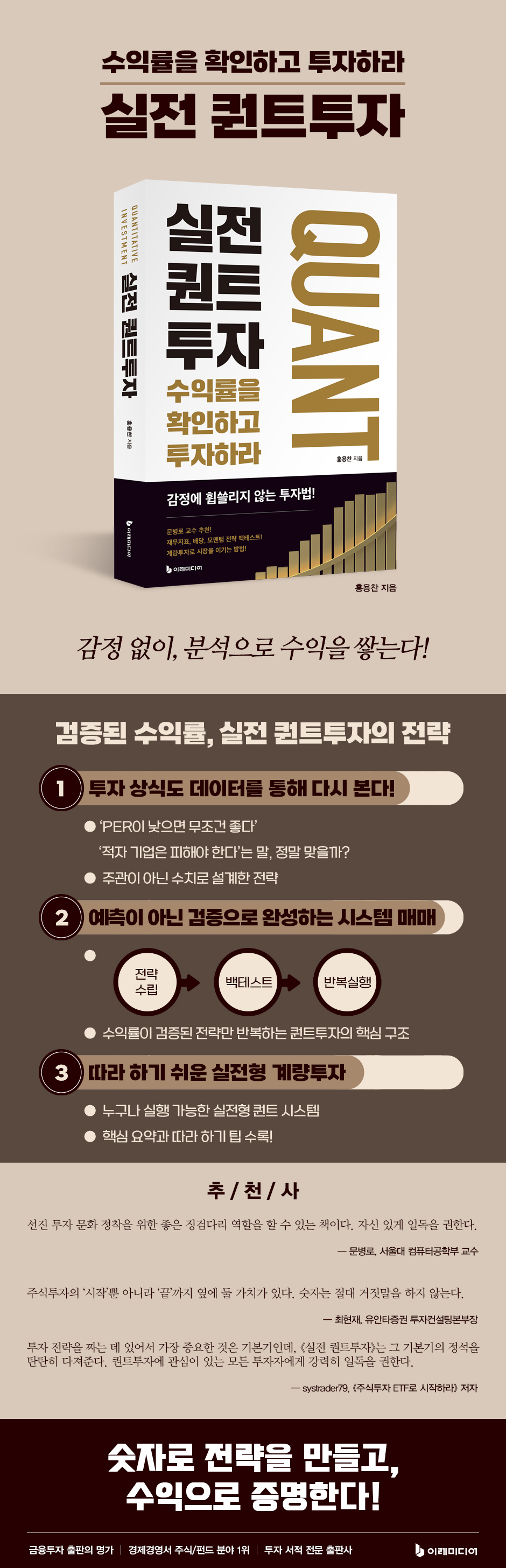 퀀트투자는 감정에 의한 휘둘림을 최소화하고 통계적 검증에 의한 투자 방법이기에 책의 내용을 이해하고 응용할 수 있다면 독자들도 성공적인 투자법을 익힐 수 있을 것이라 확신한다. - 이현열 (NH-Amundi자산운용 매니저 / 《SMART BETA》 저자)