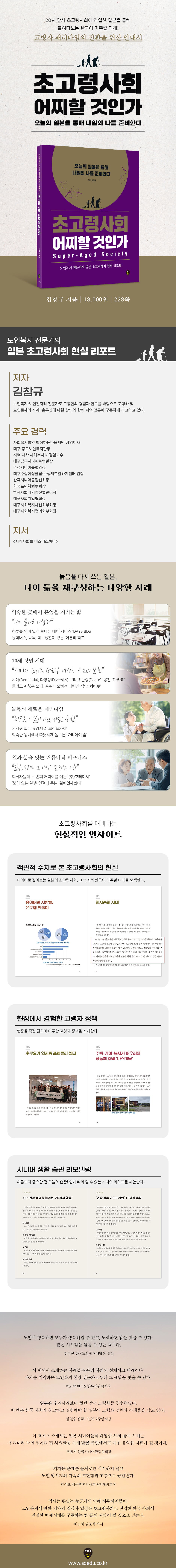 추천사 1장 초고령사회, 마주해야 할 현실들 01 ‘2025년 문제’ 예측된 상황 02 고령자가 고령자를 돌보는 사회 03 사회 속 표류자가 된 고령층 04 숨어버린 사람들, 은둔형 외톨이 05 죽어야 보이는 사람들, 고독사 〈시니어 라이프〉 뇌의 건강 수명을 늘리는 ‘20가지 행동’ 2장 지역 돌봄의 핵심, 지역포괄케어 01 인지증의 시대 02 의료와 돌봄을 동시에, 지역포괄케어시스템 03 사회적 편견을 깨는 사람들 04 일본의 다양한 데이 서비스센터 05 후쿠오카 인지증 프렌들리 센터 〈시니어 라이프〉 ‘건강 장수 가이드라인’ 12가지 수칙 3장 초고령사회를 새로 쓰는 이들 01 길 위의 쉼표가 된 정류장과 이발소 이야기 02 인지증과 함께하는 사회 03 존엄과 자립을 실천하는 요양시설 04 생활 지원 서비스가 제공되는 ‘고령자 주택’ 05 주택·케어·복지가 어우러진 공동체 주택 ‘나스마을’ 〈시니어 라이프〉 인지증 대응 7대 원칙 4장 소비시장의 변화, 시니어 시프트 01 시니어 시프트의 출현 02 생필품 사러 가기 어려운 쇼핑 난민, 식품 사막 03 사람과 기술이 공존하는 돌봄의 해법 04 인생을 마무리하는 활동 ‘종활(終活)’ 〈시니어 라이프〉 일본의 새로운 시니어 라이프 스타일 5장 액티비티 시니어로 사는 사람들 01 단카이 세대와 액티비티 시니어 02 나이를 떠나 즐거움이 있는 삶! ‘취미인클럽(趣味人??部)’ 03 일본 시니어 살롱의 인생 2막 프로젝트 04 고령자들의 아지트, 삶을 디자인하다 〈시니어 라이프〉 슬기로운 액티비티 시니어 생활 6장 평생 현역으로 사는 사람들 01 70세 정년 시대 02 지역 사회와 함께 살아가는 고령자 03 은퇴 후의 또 다른 무대 〈시니어 라이프〉 늙는다는 착각 기고문 최학희 《시니어트렌드 2025》 저자 - 시니어 트랜드 2025 : 세 가지 핵심 키워드 박한우 영남대학교 언론정보학과 교수 - 시니어 세대의 정보격차 : 디지털 시대의 도전과 기회 변재관 한·일사회보장정책포럼 대표 - 한국 돌봄통합지원법의 연착륙 참고자료 |
