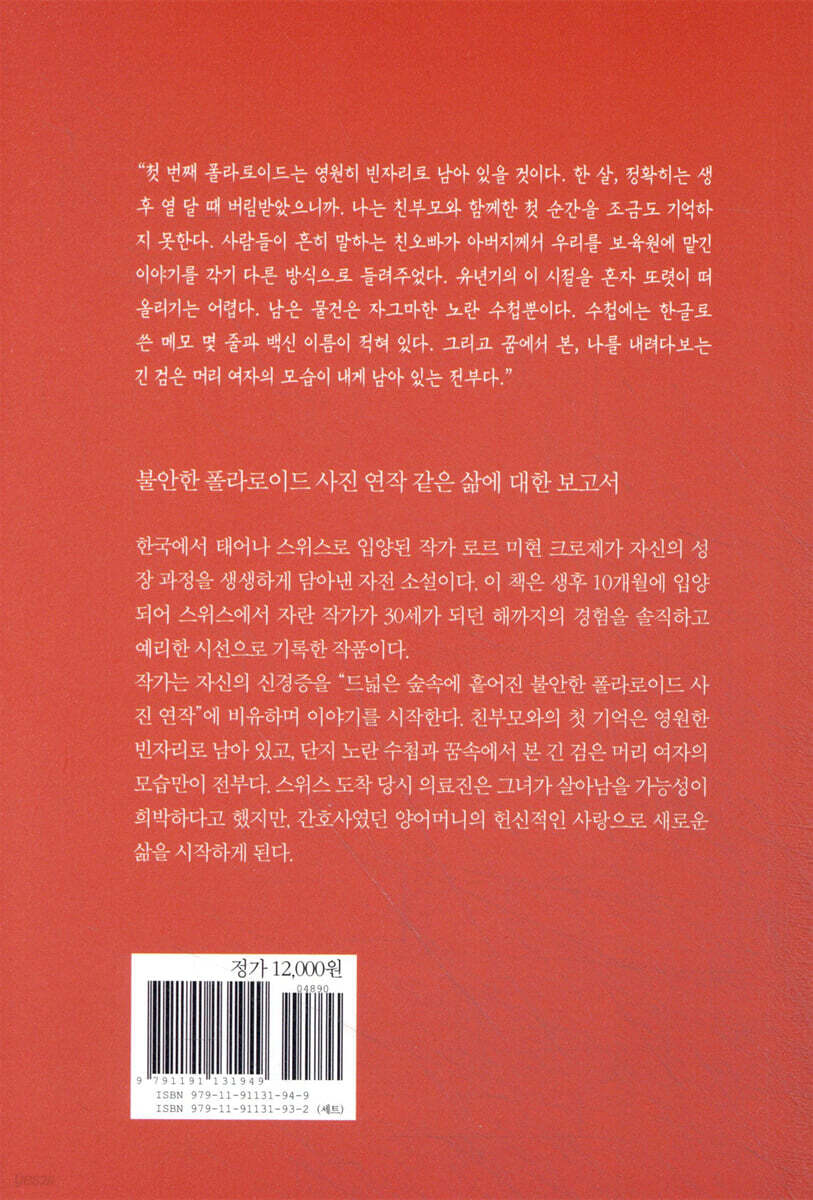 작가는 성장하면서 겪는 크고 작은 상처들을 가감 없이 드러낸다. 어린 시절 겪은 실수에 대한 강렬한 수치심, 외모와 신체에 대한 콤플렉스, 학교에서의 소외감, 그리고 무엇보다 아시아인으로서 유럽 사회에서 느끼는 미묘한 차별과 정체성의 혼란이 날카롭게 그려진다. “일본인인지 물어오면 정말 난처했다. 한국인이라고 설명할 때마다 ‘아! 올림픽 했던 나라!’라는 단순한 대답이 돌아왔다”는 작가의 고백에서 입양인이자 이방인으로서의 복잡한 심경이 드러난다. 책의 상당 부분은 작가가 문화와 예술을 통해 자신만의 정체성을 찾아가는 과정을 다룬다. 영화에 대한 열정, 문학에 대한 갈망, 그리고 언어 실력에 대한 자부심과 동시에 느끼는 불안감까지 세심하게 포착한다. 특히 대학 시절 『플럭스』 잡지에 기고한 알바니아 여행기가 거절당하는 장면에서는 예술가로서의 좌절과 성장통이 생생하게 드러난다. 연애 관계에서도 작가는 끊임없는 불안과 자기의심에 시달린다. 상대방을 기쁘게 하려는 지나친 노력, 문화적 차이에서 오는 오해, 그리고 진정한 자신을 드러내는 것에 대한 두려움이 관계를 복잡하게 만든다. 세 번의 자살 충동을 고백하는 부분에서는 깊은 우울과 절망의 순간들이 적나라하게 그려진다. 입양인 서사의 새로운 관점, 그리고 결국 희망을 품다 『폴라로이드』는 기존의 입양 관련 서사와는 다른 관점을 제시한다. 감상적이거나 감동적인 이야기보다는 입양인이 실제로 겪는 정체성의 혼란, 소속감의 부재, 그리고 끊임없는 자기증명의 압박을 차갑고 정확한 언어로 기록한다. 작가는 “내 허영이 짓밟힌 것보다, 여동생은 나와 달리 타고난 미인이라 특별히 가꾸는 게 마땅하다는 생각을 또 한 번 확인한 것이 더 마음 아팠다”는 식으로 자신의 감정을 솔직하게 해부한다. 책은 작가가 30세 생일날 “지극히 아찔하고 내밀한 프로젝트”, 즉 글쓰기를 결심하는 장면으로 마무리된다. 이는 단순한 결말이 아니라 진정한 자아를 찾기 위한 새로운 출발점이다. 『폴라로이드』는 입양, 이주, 정체성이라는 무거운 주제를 다루면서도 유머와 자기 성찰을 잃지 않는다. 비슷한 경험을 가진 이들에게는 공감과 위로를, 그렇지 않은 독자들에게는 타자의 삶에 대한 깊은 이해를 선사하는 소중한 작품이다. |