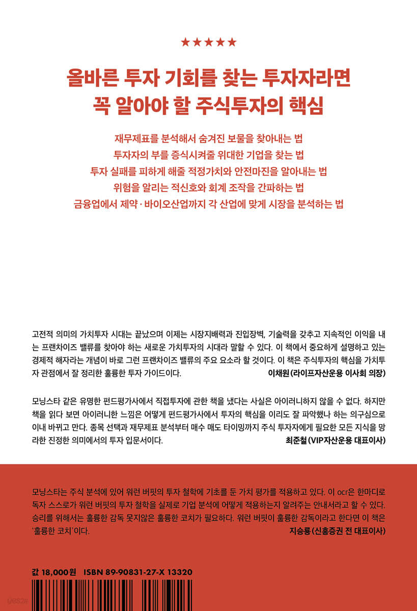 중요한 것은 기업이다 장기적으로 접근하라 우리의 확신에 용기를 가져라 시작하라 1.성공 투자를 위한 5가지 원칙 철저히 준비한다 경제적 해자를 찾는다 안전마진을 마련한다 오랫동안 보유한다 팔아야 할 때를 안다 투자자의 체크리스트 성공 투자를 위한 5가지 선택 2.피해야 할 7가지 실수 홈런을 노린다 이번에는 다를 것이라고 믿는다 제품과 사랑에 빠진다 시장이 침체일 때 공포에 빠진다 시장 타이밍을 발견하고자 노력한다 가치 평가를 무시한다 주당순이익에 지나치게 의존한다 투자자의 체크리스트 피해야 할 7가지 실수 3.경제적 해자 수익성 평가하기 경제적 해자 구축하기 얼마나 오래갈까? 업종 분석 투자자의 체크리스트 경제적 해자 4.투자 언어 기본 사항 돈은 어떻게 흐르는가 재무제표 작성하기 투자자의 체크리스트 투자 언어 5.재무제표 분석 대차대조표 손익계산서 현금흐름표 결론 투자자의 체크리스트 재무제표 분석 6.기업 분석 - 기초 성장성 수익성 재무 건전성 부정적인 가능성 결론 투자자의 체크리스트 기업 분석-기초 7.기업 분석 - 경영진 보수 인격 사업 운영 투자자의 체크리스트 기업 분석-경영진 8.회계 조작 피하기 6가지 적신호 그 밖에 주의해야 할 7가지 함정 투자자의 체크리스트 회계 조작 피하기 .가치 평가 - 기초 오른다고 능사는 아니다 주가승수의 현명한 사용 수익률을 따르자 투자자의 체크리스트 가치평가-기초 10.가치평가 - 내재가치 현금흐름, 현재가치, 할인율 현재가치 계산 할인율 분석하기 영구가치 계산 안전마진 결론 투자자의 체크리스트 가치평가-내재가치 11.개념 적용하기 AMD 바이오멧 결론 12.10분 테스트 회사가 최소한의 품질을 만족시켰는가? 회사가 영업이익을 벌어들이고 있는가? 회사는 영업 활동으로 인한 현금흐름을 지속적으로 창출하는가? 합리적인 재무레버리지 수준 안에서 자기자본수익률이 일관되게 10%를 상회하는가? 이익 증가율이 일관적인가 탄력적인가? 대차대조표가 얼마나 깨끗한가? 회사가 잉여현금흐름을 창출하는가? '기타'항목이 얼마나 많은가? 과거 여러 해 동안 유통 중인 주식 수가 크게 늘어났는가? 10분을 넘겨서 13.시장 견학 어디를 살펴봐야 하는가 결론 14.의료산업 의료산업의 경제적 해자 제약산업 복제 의약품 회사 생명공학 의료장비 회사 건강보험 및 의료 관리 15.소비자 서비스 우리가 매일 접하는 기업들 요식업 소매업 결론 투자자의 체크리스트 소비자 서비스 우리가 매일 접하는 기업들 16.비즈니스 서비스 아웃소싱 경향 비즈니스 서비스 산업의 경제적 해자 기술 기반의 비즈니스 서비스 인력 기반의 비즈니스 서비스 고정자산 기반의 비즈니스 서비스 투자자의 체크리스트 비즈니스 서비스 17.은행 이 모든 것이 리스크와 관련이있다 신용 리스크의 관리 유동성 매각 이자율 리스크의 관리 은행업의 경제적 해자 은행업 성공의 보증수표 투자자의 체크리스트 은행 18.자산운용사 및 보험사 자산운용 생명보험 손해보험 투자자의 체크리스트 자산운용사와 보험사 19.소프트웨어 소프트웨어 산업의 여러 부문 소프트웨어 산업의 경제적 해자 소프트웨어 회계 101 적신호 스프트웨어 기업 성공의 보증수표 소프트웨어 산업의 단점 결론 투자자의 체크리스트 소프트웨어 20.하드웨어 하드웨어 산업의 원동력 하드웨어 산업의 역동성 하드웨어 부문의 경제적 해자 하드웨어 기업 성공의 보증 수표 21.미디어 미디어 기업이 돈 버는 방법 미디어 부문의 경제적 해자 출판 방송과 케이블 엔터테인먼트 산업 미디어 부문 성공의 보증수표 미디어 부문의 리스크 투자자의 체크리스트 미디어 22.통신 통신의 경제적 특성 통신의 경제적 해자 통신 산업 성공의 보증 수표 결론 투자자의 체크리스트 통신 23.소비자 제품 소비자 제품 기업들은 어떻게 돈을 버는가 성장을 위한 핵심 전략 소비자 제품 부문의 단점 소비자 제품 기업의 경제적 ㅐ자 소비자 제품 기업 성공의 보증 수표 결론 투자자의 체크리스트 소비자 제품 24.산업재 경기순환성의 문제 기본재의 경제적 해자 산업재 부문의 경제적 해자 산업재 부문 성공의 보증 수표 적신호 산업재 시장에서 기회 찾기 투자자의 체크리스트 산업재 25.에너지 땅으로부터 송유관으로 정유회사로 소비자에게 서비스 제공 원유 가격의 영향 에너지 부문의 경제적 해자 에너지 기업 성공의 보증 수표 에너지 부문의 리스크 결론 투자자의 체크리스트 에너지 26.유틸리티 전기 부문 규제,규제,규제 유틸리티 부문의 재무적 특성 유틸리티 기업 성공의 보증 수표 유틸리티 부문의 리스크 전체적인 밑그림 투자자의 체크리스트 유틸리티 추천 도서 모닝스타 자료 부록 : 모닝스타 주식 등급 평가 방법론 |
