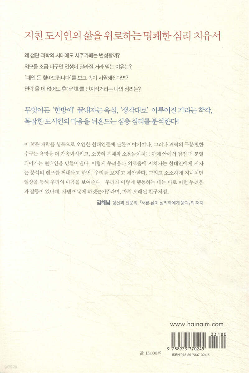 어쩔 수 없는 현실임을 받아들이고 마음 안에서, 또 현실에서 대체할 대상을 찾으면 안정을 되찾을 수 있다. 아이는 마음 안에 엄마의 이미지를 담아두는 것으로 이행기 대상을 간직하고픈 불안을 극복한다. 도시의 소통도 휴대전화나 메신저를 뛰어넘어 인간에 대한 근본적 신뢰를 통해 안전감을 얻을 수 있을 때 진정 풍요롭고 충만한 인간관계를 만들 수 있다. ---「전화보다 문자메시지가 편한 시대」 중에서 인생이라는 게임은 스타트 버튼을 다시 누르고 시작할 수 없다. 더 안타까운 것은 자살하고 나면 남겨진 사람이 평생 자신만 생각하고 가슴 아파할 것이라는 착각이다. 그들은 곧 죽은 사람을 잊고 일상으로 돌아가버린다. 이렇게 자살을 덧없이 한 사람은 두 번 죽는다. 자신의 영혼이 땅에서 사라지는 것으로, 타인의 마음속에서 잊혀지는 것으로. 자살이란 무조건적인 죄악이라고 설교를 하려는 것이 아니다. 자살을 생각할 만큼 뼈저리게 마음 아프고 괴롭고, 죄책감과 절망감에 시달리는 사람들이 많다. 세상 사는 것이 각박해질수록 그런 사람은 늘어날 것이다. 자살은 이들에게 유일한 해방구이자 비상탈출구일 수 있다. 그렇지만 대인관계의 상처가 자존심에 흠집 좀 냈다고, 이를 참지 못해 자존심을 회복하겠다는 일념이 지나쳐 자기를 파괴하는 상황까지 간 사람은 새로 산 차에 접촉사고가 나고 난 다음부터 여기저기 일부러 긁고 다니면서 새 차에 대한 애착을 아예 절연해 버리는 사람의 마음과 같다. 게다가 타인을 조정하고 타인의 감정에 영향을 미치기 위해 하는 자살행동은 더욱 위험하고 자기애적 폭력일 뿐이다. ---「죽도록 괴로운 일로 자살하는 사람은 많지 않다」 중에서 지름신은 21세기의 미륵불이 아닐까. 살면서 매일 남이 나를 어떻게 보는가가 내 생각보다 중요하고, 지나친 자기절제의 당위성에 머뭇거리는 보잘것없는 인생살이에 아직은 ‘내가 원해서 산 거야’라고 선언할 용기가 없는 우리에게 지름신은 현재의 답답함을 해결해 줄 처방을 내려주는 존재다. 불확실하고 어두워 보이는 미래에 대한 신뢰할 수 없는 약속보다 현재의 포만감과 행복감을 원하는 중생들은 지름신을 모시려 한다. 품안에서 신용카드를 꺼내들면 삶의 괴로움에 찰나적이나 짜릿한 엔돌핀이라는 연고를 바르며 행복해할 수 있기 때문이다. 지치고 힘든 자들이여, 당신 마음에 지름신을 모셔라. 베짱이 같은 삶을 살다가 겨울에 고생할 수 있다고 여름에 개미처럼 일만 할 이유도 없는 법. 오늘을 즐기자! ---「사주카페가 성행하는 두 가지 이유」 중에서 타인에 대한 믿음은 더 근본적으로는 자기신뢰(self-trust)로부터 시작한다. 뭔가를 남에게 빌려줄 때에는 자기 선택에 대한 믿음이 있어야 하고 이를 위해서는 우선적으로 자기확신감(self-confidence)이 형성돼 있어야 한다. 타인을 충분히 알고 있다는 믿음은 자기 자신을 아는 정도에 비례하기 때문에 배신과 사기를 당했을 때의 아픔은 더욱 크다. 금전적 손해보다, 믿었던 사람을 잃었다는 상실감보다, 더 결정적인 통증의 원인은 고이 모셔온 자존심에 금이 가는 것이다. 화가 난 이유는 남이 아닌 나에게 있는 것이다. 자존심에 입은 상처는 곧바로 ‘복수’에 대한 환상으로 이어진다. 그것만이 ‘쩍’ 하고 갈라진 자존심을 치유해 줄 수 있을 것 같다. 환상은 현실의 아픔과 좌절로 패인 마음의 생채기에 바르는 마술의 반창고다. 그러나 이 마술 반창고는 상처를 덜 아프게 하고, 눈에 보이지 않게 해주지만 아쉽게도 근본적 치료는 해주지 못한다. 이것이 환상의 한계다. 복수는 인간이 어떤 이유로든 좌절을 당할 때 경험하는 가장 흔한 무의식의 반응이다. 무의식에 기반하였기에 다양한 형태의 무의식적 충동이 환상의 형태로 나타난다. ‘떼인 돈 찾아드립니다’란 플래카드는 애써 잊고 지내며 그동안 억압해 온 대인관계에서 발생한 실망과 배신의 좌절감을 복수라는 환상의 형태로 되살려낸다. ---「“떼인 돈 찾아드립니다”」 중에서 |