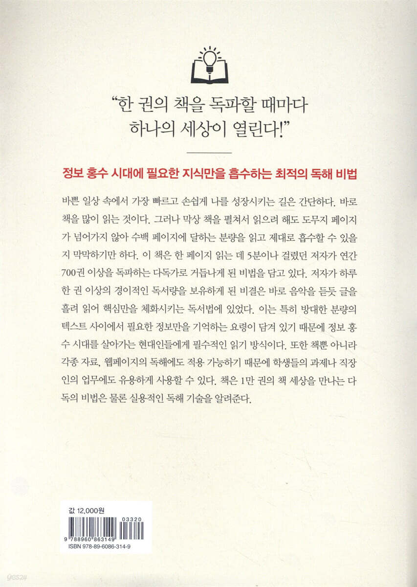 프롤로그 하루 한 권의 세상을 만나는 독서 비법 1장 나는 이렇게 1년에 700권을 읽었다 느리게 읽는 사람들이 하기 쉬운 착각 100퍼센트를 기억하는 독서에서 1퍼센트를 만나는 독서로 음악을 듣듯 편안하게 책을 기억하자 정보과잉 시대에 꼭 맞는 새로운 읽기 2장 어떻게 많은 책을 읽을 것인가 : 한 달에 20권 읽는 독서 습관 매달 20권의 독서를 습관화하는 ‘다독 리듬’ 매일 같은 시간에 읽는다 빨리 읽을 만한 책을 중심으로 고른다 어제와 다른 책을 읽는다 일상에 적용하기 쉬운 독서 습관을 만든다 3장 왜 읽어도 금세 잊어버리게 될까 : 핵심을 잊어버리지 않는 효율적인 독서법 책을 읽기 어려운 진짜 이유 독서의 군더더기를 버리는 효율적인 방법 책의 요점을 뽑아내는 한 줄 샘플링 최고의 문장을 골라내는 한 줄 에센스 책 한 권을 압축하는 한 줄 리뷰 자신의 독서 생활에 점수를 매겨본다 인용의 효과를 두 배로 높이는 마법의 손글씨 쓰면서 읽어야 빠르고 깊게 읽을 수 있다 4장 어떻게 빨리 읽을 것인가 : 술술 읽으면서도 요점을 파악하는 키워드 독서법 술술 읽는 사람은 책의 어디에 집중하는가 필요한 부분만을 골라내는 구체적인 요령 독서 속도의 90퍼센트는 머리말에서 결정된다 다섯 줄만으로 전체를 파악하는 비법 공들여 읽을 부분을 쉽게 찾아내는 방법 기어를 바꾸면서 속도의 완급을 조절한다 외우지 않아야 잊지 않는다 5장 책과 어떻게 만나고 헤어질 것인가 : 1만 권의 책을 고르고 관리하는 법 하루 한 권 일주일 독서계획을 세운다 흥미의 벽을 부수고 취향의 폭을 넓힌다 빨리 읽을 수 없는 책을 읽는 법 책을 손에 넣는 장소를 다각화한다 독서를 좋아할수록 책과 잘 헤어진다 처분할 책을 선정하는 기준 책장은 나를 비추는 거울이다 에필로그 책을 읽고 나서야 알게 된 것들 책을 마치며 1만 권의 책 세상이 나를 기다리고 있다 역자 후기 우리 모두가 1만 권의 짜릿한 세상을 만날 수 있기를 부록 실전, 운명의 한 줄을 만나는 서평 쓰기 |