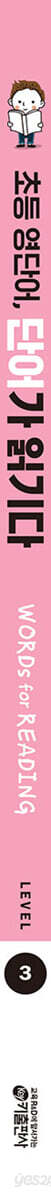 단어를 배우면 읽기가 저절로! 초등 영단어 Words for Reading 초등 교육과정을 완벽 분석하여 하루 12단어만 익히면 ‘어휘’, ‘읽기’까지 저절로 되는 구성! 1. 초등학교 교과서를 완벽 분석했어요! 교육부 권장 초등 필수 영단어 800개, 교과서 필수 영단어 200개 [총 1000개의 영단어 학습], 교과서에 나오는 초등 핵심 문장 100문장, 쉽고 재미있는 90개의 리딩을 마스터할 수 있습니다. 『단어가 읽기다』는 총 4권으로 구성되어 있어요. Level 1은 초등학교 3학년 과정, Level 2는 4학년 과정, Level 3는 5학년 과정, Level 4는 6학년 과정으로 구성되어 있어, 아주 쉬운 단어와 리딩부터 시작하여, 점차 누적되어 어려운 지문까지 마스터하게 할 수 있게 단계적으로 촘촘하게 구성하였어요. 2. 하루에 주제별로 딱 12단어만 외우면 돼요! 단어는 주제별로 관련 있는 단어와 묶어서 외우는 게 기억에 오래 남습니다. 『단어가 읽기다』는 주제별로 하루에 12단어씩 외울 수 있게 구성되어 있습니다. ‘단어를 좀 더 많이 외워야 하지 않을까?’ 욕심내지 마세요! 하루에 12단어면 충분합니다. 단, 보고, 듣고, 읽고, 쓰면서 반복학습해서 단어를 완전히 ‘내 것’으로 만드는 게 중요합니다. 3. 단어와 문장 패턴을 외우면, 읽기로 그대로 연결돼요! ‘단어’ 따로, ‘읽기’ 따로가 아니라, 단어와 문장을 익혔으면 읽기로 확장되어야 합니다. 『단어와 읽기다』에서는 누적 방식으로, 앞서 외운 단어와 문장 패턴이 확장되어 리딩 지문에 그대로 나와 반복학습의 효과를 극대화할 수 있어요! 예를 들어, 동물 관련 ‘단어’를 배웠다면, 동물을 묘사하는 ‘문장 패턴’을 익힌 후, 단어와 문장 패턴이 그대로 확장된 ‘읽기’를 통해 영어에 자신감을 갖게 됩니다. 4. 쓰기노트로 쓰기까지 대비할 수 있어요! 보고 듣고 읽으면서 단어를 익혔다면, 쓰기훈련노트로 쓰기까지 끝낼 수 있습니다. 『쓰기훈련노트』는 단어 쓰기를 특화한 노트로, 단어를 큰 소리로 읽고 의미를 생각하면서 충분히 따라 써보며 하루 12단어를 완벽하게 내 것으로 만들 수 있습니다. 『REVIEW BOX』에서는 앞서 2권에서 배운 내용을 짝꿍 단어(collocation)으로 복습할 수 있어 1, 2권과 연계하여 학습하면 더욱 좋습니다. |