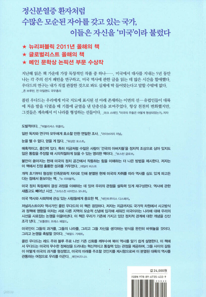 이들은 자신을 ‘미국’이라고 불렀다! 뉴리퍼블릭 2012년 올해의 책 글로벌리스트 올해의 책 메인 문학상 논픽션 부문 수상작 열한 개의 자아를 가진 미국이란 나라 당신의 이웃에 한 사람이 살고 있다. 일요일 아침마다 그는 정장을 차려입고 근엄한 표정으로 교회에 나간다. 그런데 어느 날 보니 그 사람이 지나가는 흑인에게 손가락질을 해대며 혐오 발언을 서슴지 않는 게 아닌가. 그런가 하면 재즈 공연장에서 문화와 예술을 찬양하는 데 여념 없는 그의 모습이 목격된다. 집 화단엔 그가 마치 직업 농부라도 되는 양 가꿔놓은 온갖 채소와 식물이 그득하다. 그리고 다음 날엔 또다시 TV에 나오는 민주당 후보를 가리키며 “빨갱이”라고 소리친다. 이쯤 되면 당신은 그가 슬슬 무서워질 것이다. 정신분열증 환자가 아니고서야 어떻게 이렇듯 이질적인 모습을 갖고 있단 말인가. 그런데 여기, 마치 분열증을 앓는 듯 모순된 면모를 가진 나라가 있다. 바로 11개의 국민들로 나뉜 데다 그 분열 증상이 더 심해지고 있는 미국이다. 미국의 지도자들은 위기 국면마다 “근본적인 공동 가치를 회복하자”고 말하지만, 그런 ‘원형적 가치 따위’는 미국에 있었던 적이 없다. 미국의 가장 고질적인 분열은 레드 주(공화당 우세 주)와 블루 주(민주당 우세 주), 보수와 진보, 자본가와 노동자, 백인과 흑인, 신앙인과 세속주의자 사이에 있지 않다. 오히려 근본적인 원인은 미국이 결코 의견 일치를 보이는 법이 없는 11개 ‘지역 국민regional nations’들로 구성된 연방국가라는 데서 기인한다고 저자는 파악한다. 주는 물론이고 나라 간 국경도 대수롭잖게 여기는 이 지역의 국민들은 캐나다와 멕시코의 국경을 마치 캘리포니아, 텍사스 주 경계선만큼이나 아무렇지 않게 넘나들면서 피를 흘리며 싸웠다. 이들 중 6개 국민은 대영제국으로부터의 독립 운동에 참여했고, 4개 국민은 영어를 쓰는 경쟁자들에게 정복당했지만 아직 그 명맥을 잇고 있다. 19세기 후반에는 미 서부 개척자들에 의해 서쪽에서 2개 지역 국민이 추가로 탄생했다. 어떤 국민은 여러 문화가 뒤섞인 다원화 사회를 세웠고, 또 다른 국민은 프랑스, 스페인 혹은 앵글로색슨의 유산을 아직도 간직하고 있다. 그러나 이들 중 어떤 국민도 미국이라는 한 나라의 일부로 융화됐다는 징후를 보여준 적은 없다. 오히려 1960년 이후, 국민 사이의 단층선이 훨씬 넓어지면서 더 격렬한 문화 전쟁과 헌법을 둘러싼 다툼을 벌이고 있다. 양키 선생, 타이트워터 지주, 디프사우스 귀족 vs 두메산골 촌뜨기 그레이터 애팔래치아 먼저 주목할 것은 매사추세츠 만 해안가에 세워진 양키덤이다. 칼뱅주의자인 그들은 뉴잉글랜드 황야에 종교적 유토피아를 세우겠다며 정착했다. 교육과 정치의 중요성을 믿고, ‘대의’를 위해서라면 금욕도 불사했던 양키들은 정부가 삶의 질을 높인다고 굳게 믿는다. 그들이 보기에 정부는 외세와 기업, 귀족들의 탐욕에 맞서 자신들을 지켜줄 존재다. 교육 수준이 높은 견실한 중산층 집단인 양키는 지적 성취를 중요시하며 지난 4세기 동안 활발한 정치 참여를 하면서 지구상에 좀더 완벽한 사회를 건설하고자 노력해왔다. 오늘날엔 비록 종교적 색채가 옅어졌지만 그들은 ‘세속적 청교도주의자’로서 여전히 도덕적, 사회적 가치를 추구한다. 타이드워터인들은 한마디로 미국의 ‘지주’들이다. 그런 만큼 보수적이고, 권위와 전통에 기대며, 대중의 정치 참여나 평등을 반기지 않는다. 태생이 영국 남부 젠트리의 후손들이기에 특권의식을 지니는 것도 그리 놀랍진 않다. 초기 공화정과 식민시대까지만 해도 가장 강력한 사회를 형성했던 이들은 영국의 반半 봉건문화를 가져와 버지니아 저지대, 메릴랜드, 델라웨어 남부, 노스캐롤라이나 동북부를 ‘젠틀맨’의 파라다이스로 만드는 데 성공했다. 하인과 노예들을 부렸던 타이드워터의 엘리트들이 어쨌든 미국 건국에 중추적인 역할을 했음은 부인하기 힘들며 헌법에도 귀족적 요소들을 심어 넣었다. 가령 오늘날 미국이 직접선거를 치르지 않고 의회가 임명하는 상원의원 제도와 선거인단 제도를 보유하게 된 것은 이들 때문이다. 디프사우스는 바베이도스 노예 소유주들이 세운 곳이다. 잔인하고 횡포한 이곳 제도를 보고 동시대 영국인들조차 경악을 금치 못했을 정도다. 미국 역사에서 디프사우스는 백인우월주의와 귀족적 특권의 보루였다. 고대 노예국가를 모델로 한 고전적 공화주의 국가 같은 이곳은 북미에서 가장 반민주적인 일당 체제 사회였으며, 이들의 정치적 성향을 결정짓는 첫 번째 변수는 여전히 인종이었다. 1861년 남북전쟁의 소용돌이를 일으킨 장본인이기도 하다. 한편 양키와 타이드워터인, 디프사우스의 우월감을 모조리 경멸한 국민들이 있으니, 바로 그레이터 애팔래치아인들이다. 북아일랜드와 북잉글랜드, 스코틀랜드 저지대 접경 지역의 거칠고 호전적인 사람들이 이들의 조상이다. 대중문화를 통해 흔히 ‘레드넥(교육 수준이 낮고 보수적인 시골 사람을 일컫는 모욕적인 표현)’ ‘힐빌리(두메산골 촌뜨기)’ ‘하얀 쓰레기(가난한 백인을 뜻하는 은어)’라고 조