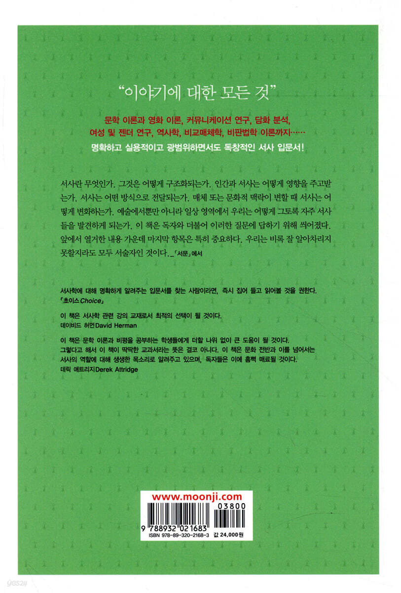 제2판 서문 1장 서사와 삶 2장 서사와 정의 3장 서사와 경계 4장 서사의 수사학 5장 종결 6장 서술 7장 서사의 해석 8장 서사 해석의 세 가지 방법 9장 매체 간 각색 10장 등장인물가 서사 속의 자아 11장 서사와 진실 12장 서사세계 13장 서사의 경합 14장 서사의 협상 옮긴이의 말 주 참고문헌 그림 목록 용어 해설 및 주제별 색인 |
