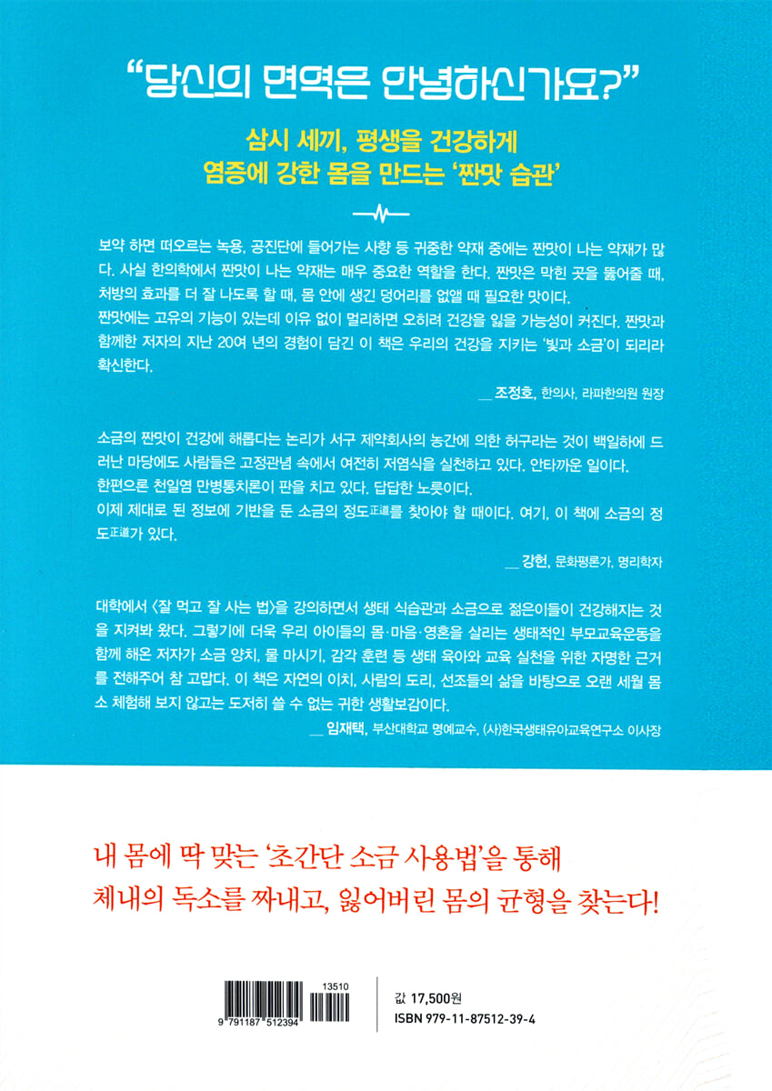 보약 하면 떠오르는 녹용, 공진단에 들어가는 사향 등 귀중한 약재 중에는 짠맛이 나는 약재가 많다. 사실 한의학에서 짠맛이 나는 약재는 매우 중요한 역할을 한다. 짠맛은 막힌 곳을 뚫어줄 때, 처방의 효과를 더 잘 나도록 할 때, 몸 안에 생긴 덩어리를 없앨 때 필요한 맛이다. 짠맛에는 고유의 기능이 있는데 이유 없이 멀리하면 오히려 건강을 잃을 가능성이 커진다. 짠맛과 함께한 저자의 지난 20여 년의 경험이 담긴 이 책은 우리의 건강을 지키는 ‘빛과 소금’이 되리라 확신한다. - 조정호 (한의사, 라파한의원 원장)