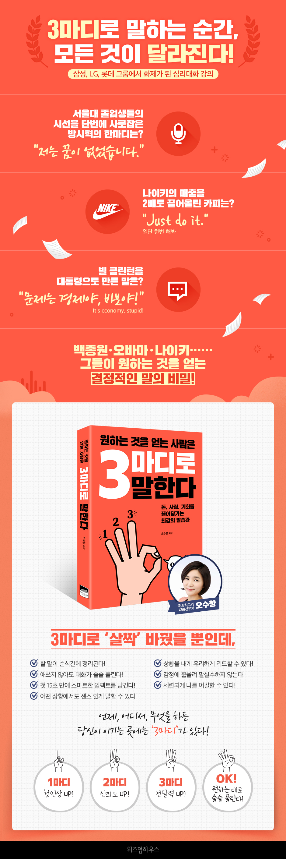 “(죄송하지만) 도태될 분들은 도태되어야 합니다.” 백종원 대표가 2018년 국정감사에 출석하여 한 말이다. 그는 [골목식당] 등의 TV 프로그램에 출연하며 시청자들에게 자영업에 대한 과도한 환상을 주고 있는 것은 아니냐는 어느 국회의원의 질문에 이렇게 대답했다. ‘충분한 준비와 노력이 없으면 (장사를) 시작하지 말아야 한다’는 자신의 뜻을 단 한마디로 단호하면서도 분명하게 밝힌 사례라고 볼 수 있다. --- pp.20~21 “일단 한번 해봐(Just do it).” 나이키의 경우 이 카피를 쓴 뒤 매출액이 40퍼센트나 증가했다. 이외에도 세계적인 광고 카피는 2마디 혹은 4마디 사이로 매우 간단하다. ‘3마디’는 연설에서도 막강한 힘을 발휘한다. 1992년 미국의 42대 대통령 선거 때다. 당시 대통령 선거는 투표를 시작하기도 전에 끝난 것이나 다름없었다. 민주당 빌 클린턴 후보가 선거 구호로 내세운 이 3마디가 전 국민의 가슴 속을 파고들었기 때문이다. “문제는 경제야, 바보야(It’s economy, stupid)!” 불경기 속에서 허우적거리던 미국인들은 그 말을 듣는 순간 지금 필요한 대통령으로 빌 클린턴을 낙점했다. 이 3마디의 힘을 통해 빌 클린턴은 현직 대통령 부시를 누르고 46세의 젊은 나이로 대통령에 당선되었다. 한마디 정도의 짧은 말로도 사람의 마음을 얻을 수 있다. 원하는 것을 얻기 위해서는 수천 권의 책 속에 들어 있는 막대한 단어가 다 부질없다. 짧은 말 하나면 족하다. --- pp.25~27 비교를 잘 활용해 핵심 메시지 전달에 성공한 광고가 LG 노트북 ‘그램’이다. LG는 노트북의 가벼운 무게를 강조하기 위해 실제 종이로 만든 노트북과 비교했다. 실제로 한 장인이 부품 하나하나를 다 만들어서 종이 노트북을 완성했다. 그런 후, 실제 노트북과 종이 노트북을 저울에 달았다. 그러자 놀랍게도 저울이 종이 노트북 쪽으로 기울어졌다. 이 장면 하나로 매우 가벼운 노트북이라는 핵심 메시지를 효과적으로 전 달해냈다. 시청자들은 이 장면에서 한눈에 반해버렸다. ‘종이보다 가벼운 노트북이구나.’ 이렇게 생각하면서 말이다. 능력 있는 쇼호스트일수록 ‘비교’를 적극적으로 활용해 제품을 소개한다. 작은 크기의 전자제품을 소개할 때 그 제품 옆에 백 원짜리 동전 하나를 옆에 갖다 놓는다. 그러고 나서 말한다. “백 원 동전보다 작습니다.” --- pp. 129~130 “말을 해서 이기는 것은 최선이 아니며, 말을 하지 않고 적을 굴복시키는 대화법이 최선이다.” 이는 세계적인 연설가 버락 오마바가 잘 입증한다. 2011년 미국 애리조나 주 투산에서 총기 난사 희생자의 추모식이 열렸다. 이곳에서 버락 오바마 전 미국 대통령이 연설을 했다. 시종 내내 침통한 표정으로 연설을 이어가던 그가 다음 두 구절을 끝으로 침묵을 지켰다. “나는 미국의 민주주의가 크리스티나가 꿈꾸는 것과 같았으면 좋겠다고 생각합니다. 우리 모두는 어린이들이 바라는 나라를 만들기 위해 최선을 다해야 합니다….” 말을 마친 그는 10초간 침묵한 후 오른쪽을 쳐다본 뒤 10초 후 심호흡을 했다. 그러곤 31초 후 눈을 천천히 깜빡였다. 무려 51초 동안 침묵이 흘렀다. 그러자 장내에는 애도의 감정이 끓어올랐다. 버락 오바마는 언어로 표현할 수 없는 극도의 침통함을 침묵으로 잘 전달해냈다. --- pp.180~181 |